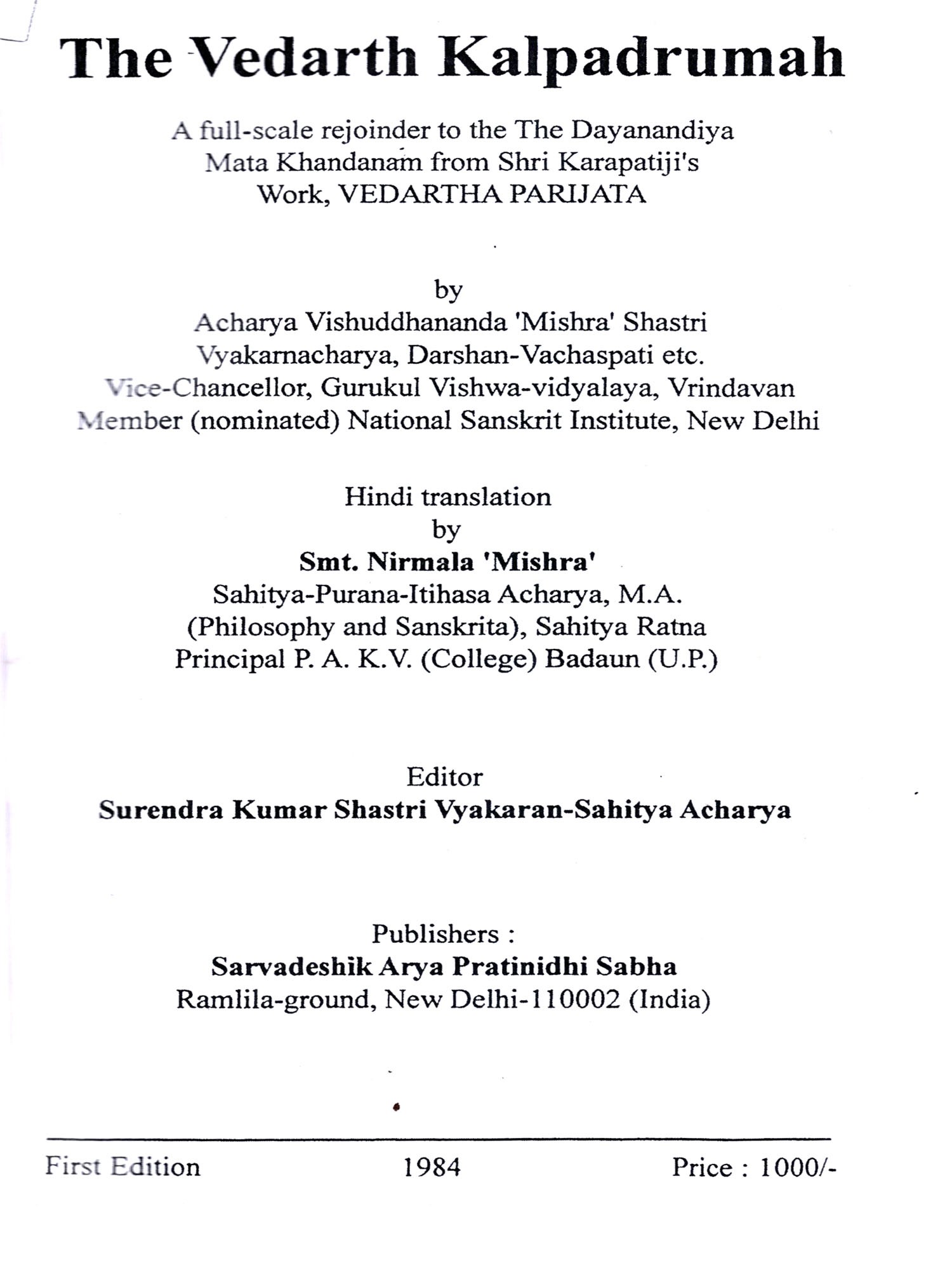 वेदार्थ-कल्पद्रुमः: The Vedarth Kalpadrumah (A Full-Scale Rejoinder to the Dayanandiya Mata Khandanam From Shri Karapatiji's Work, Vedartha Parijata) Set of 3 Volumes
