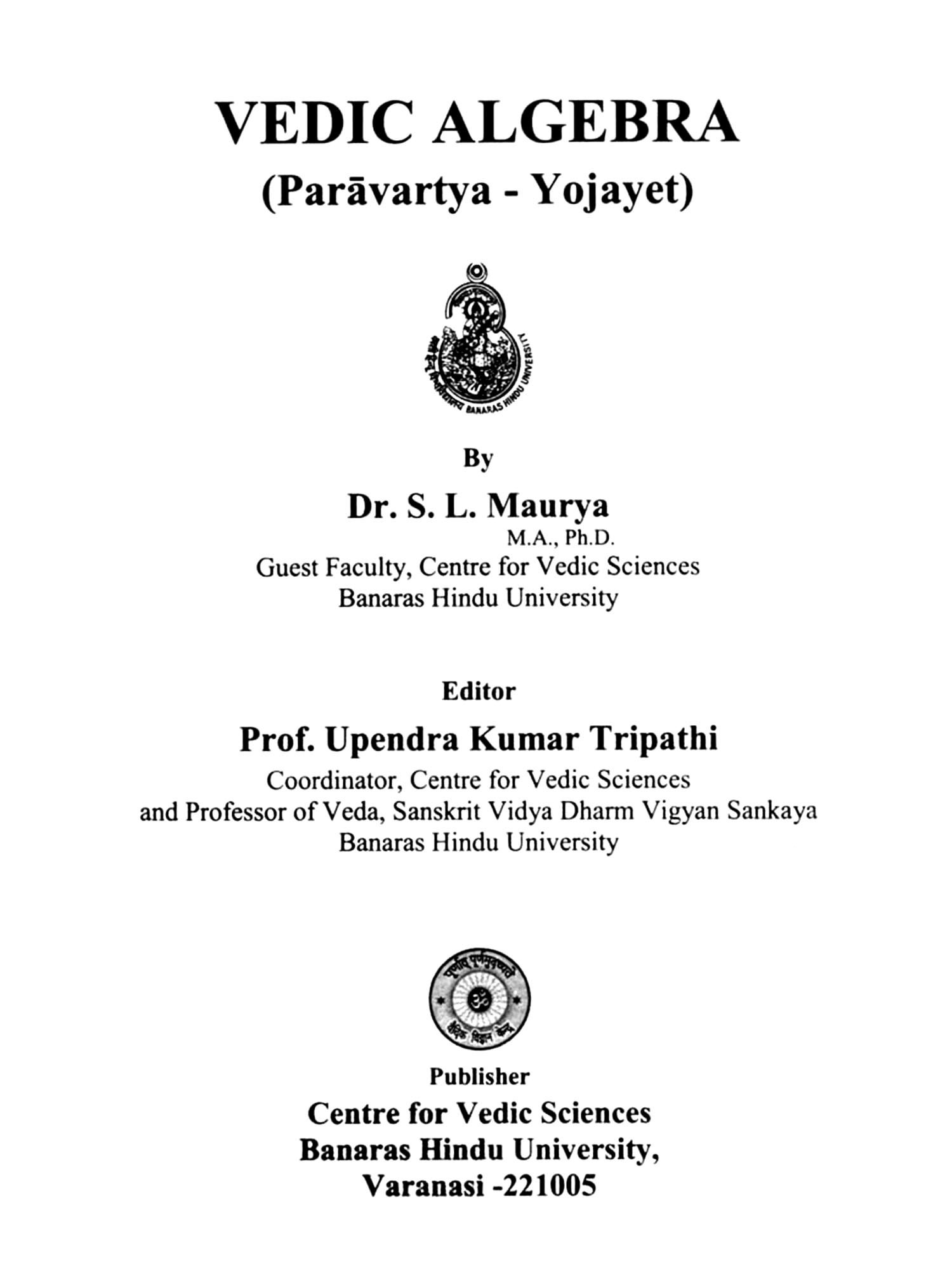 It gives me immense pleasure to dedicate this book to the readers keenly interested in learning Vedic approaches in modern form of symbolism in algebra. The symbolic algebra as of today emerged around 16th century. The origin of algebra dates to the scripting of Vedas or even before that but it was not in symbolic form. The constraints to determine unknown quantities were expressed in words. Gradually symbolism got introduced to denote the quantities and the relations among them. The word problems to determine the value of a quantity could get expressed in symbolic form as equations. The Siddhant Shiromani of Bhaskaracharya II has four volumes Leelavati, Bijganit, Grahganit and Goladhyaya. It is presumed that the algebra in present form could started taking shape during the period of Bhaskara II.