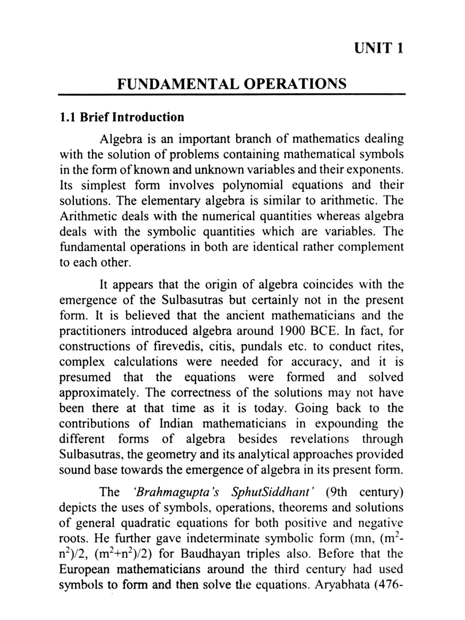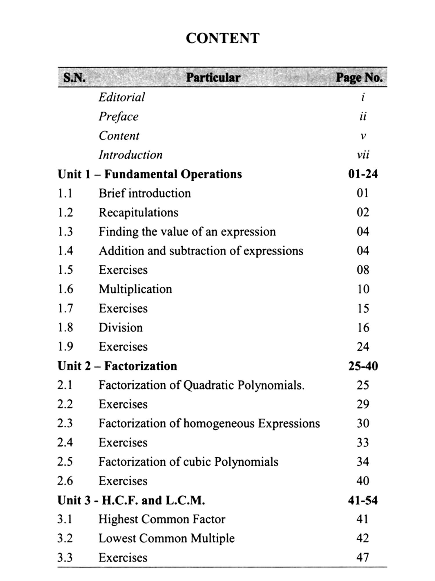 The fifth unit is on Partial Fractions. Splitting the rational expression into partial fraction is the process of expressing it as the sum of the fractions. Disguised forms too have been taken into consideration and values of the unknowns have been obtained in easy way without many computations. Resolution of the rational expression into partial fraction facilitates obtaining its integration in easy way. The sixth unit deals with the binomial theorem. The Meruprastar has been used to determine the coefficients of terms of binomial expansions. The related results and properties too have been discussed in detail.