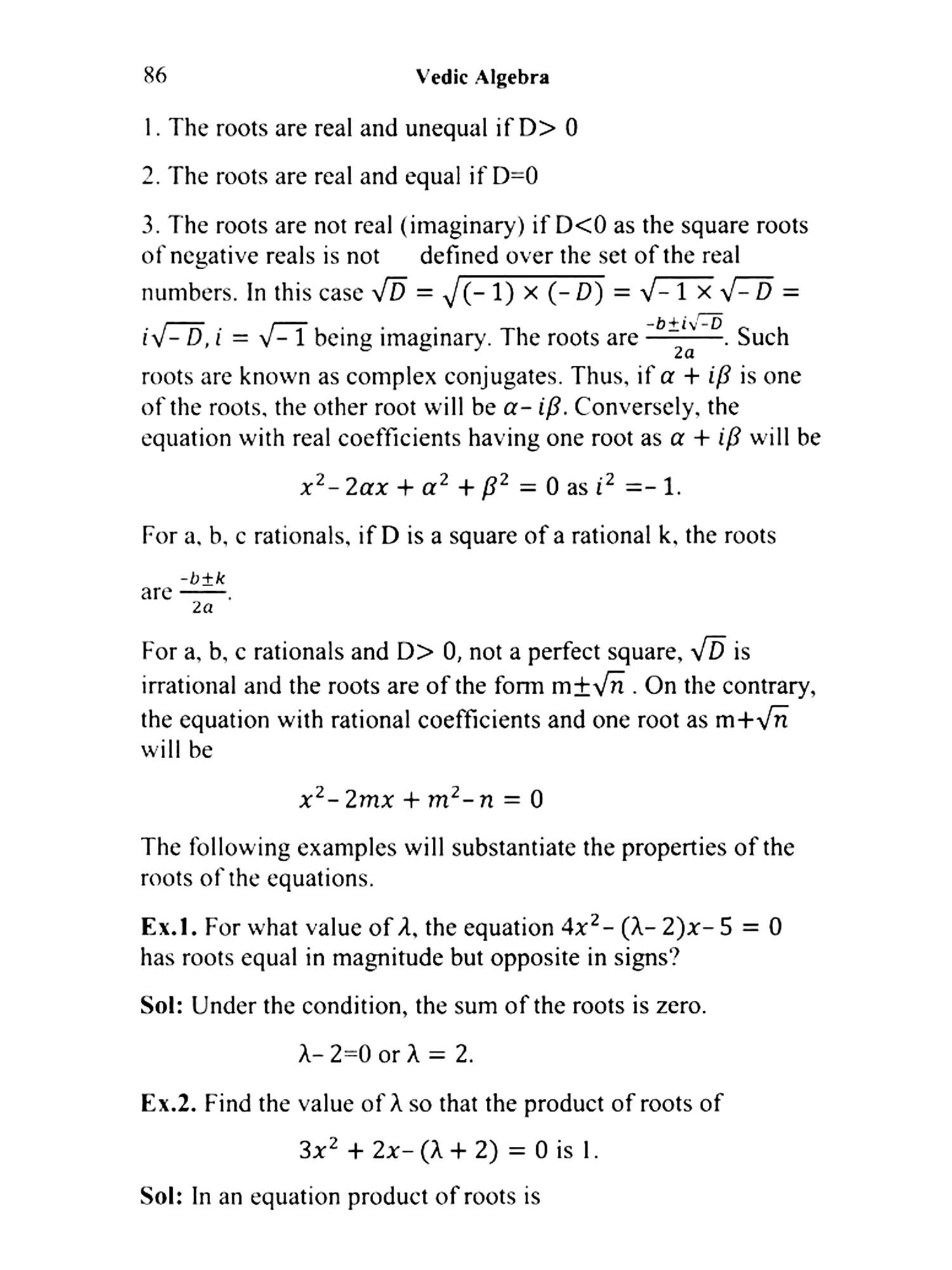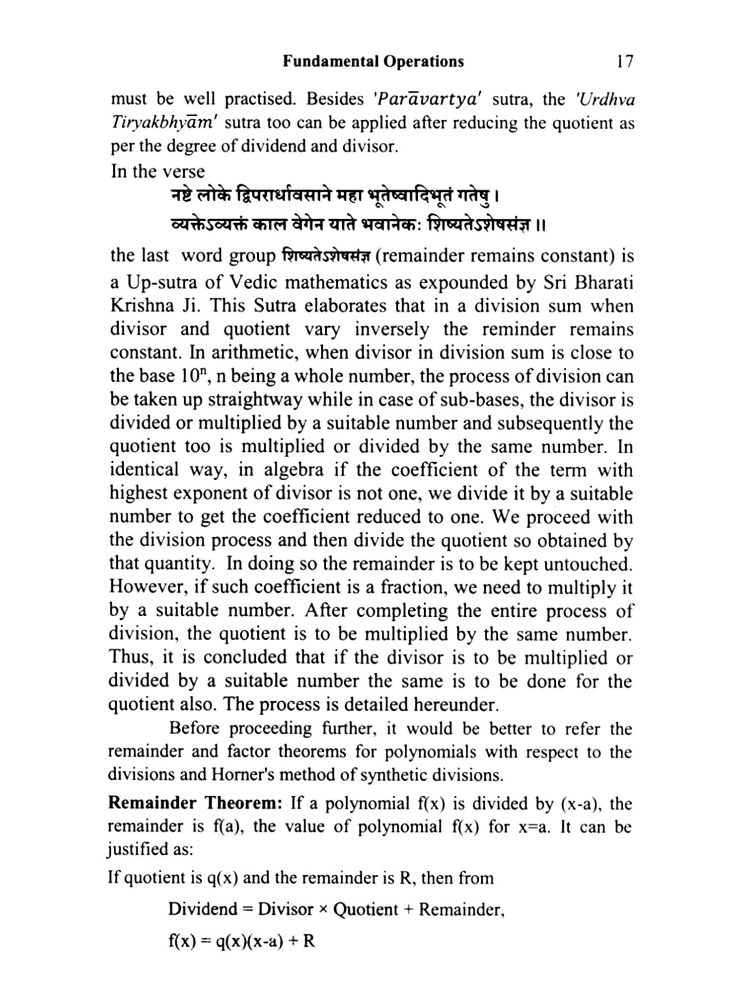 The present book is an endeavor to let the enthusiasts comprehend the fundamentals of algebra as founded by the seers of the ancient period and get acquainted with the traditional antiquities. The methods adopted for the fundamental operations is much simpler than the present conventional methods. The Sutra 'Paravartya Yojayet' has made the division process less time taking, simple and error free. The different methods adopted for the factorizations, particularly of cubic polynomials, is really interesting and makes the solutions of subsequent equations less cumbrous. The comprehensive texts on solution of equations covering the special forms are of immense use. The procedures for finding H.C.F. involving only addition and subtraction of expressions is far away from long divisions. Resolving a fractional expression into its partial form is simple and involves less computations. The binomial expansions with the help of Meru Prastar are easy and free from lengthy calculations.