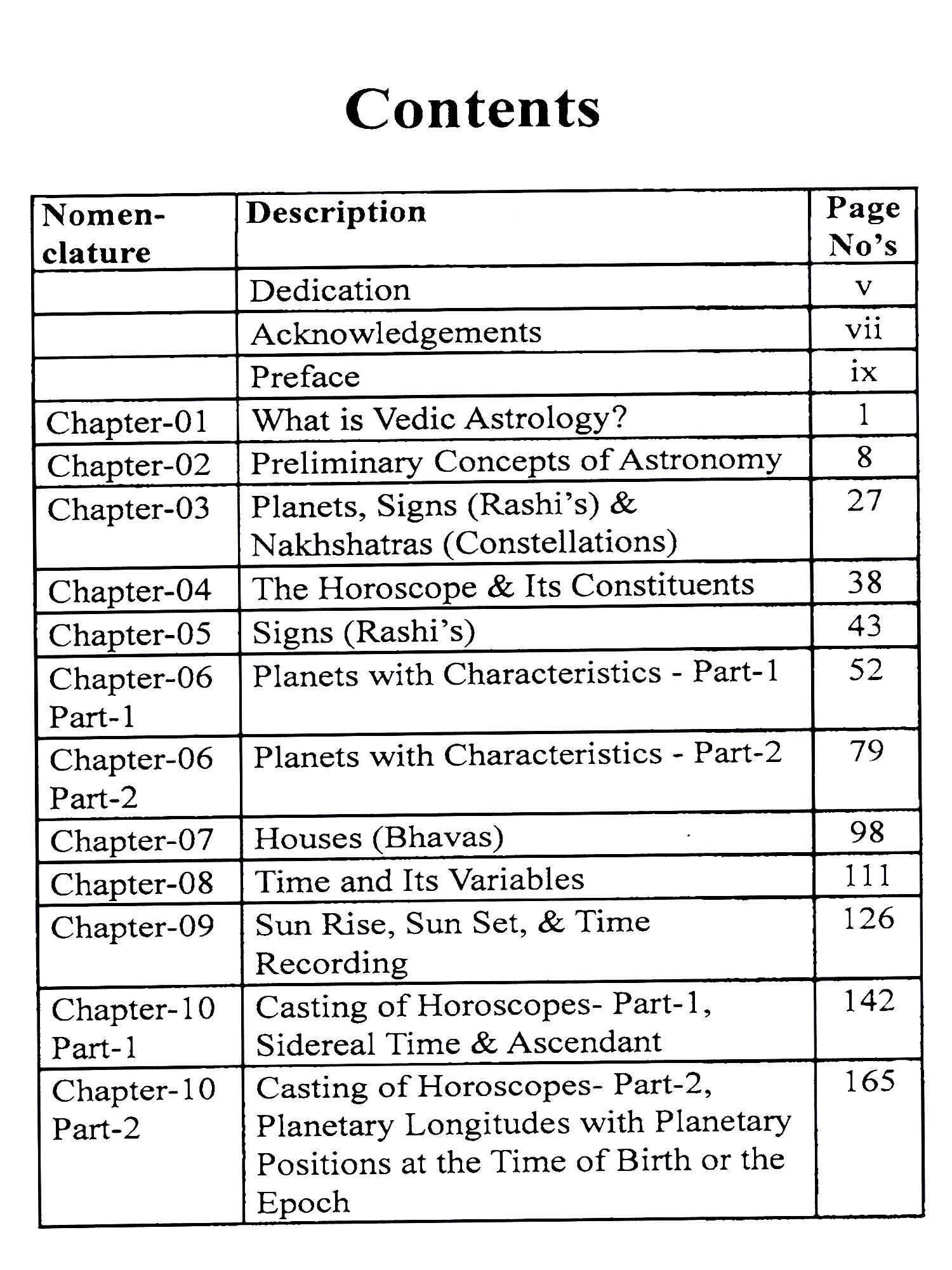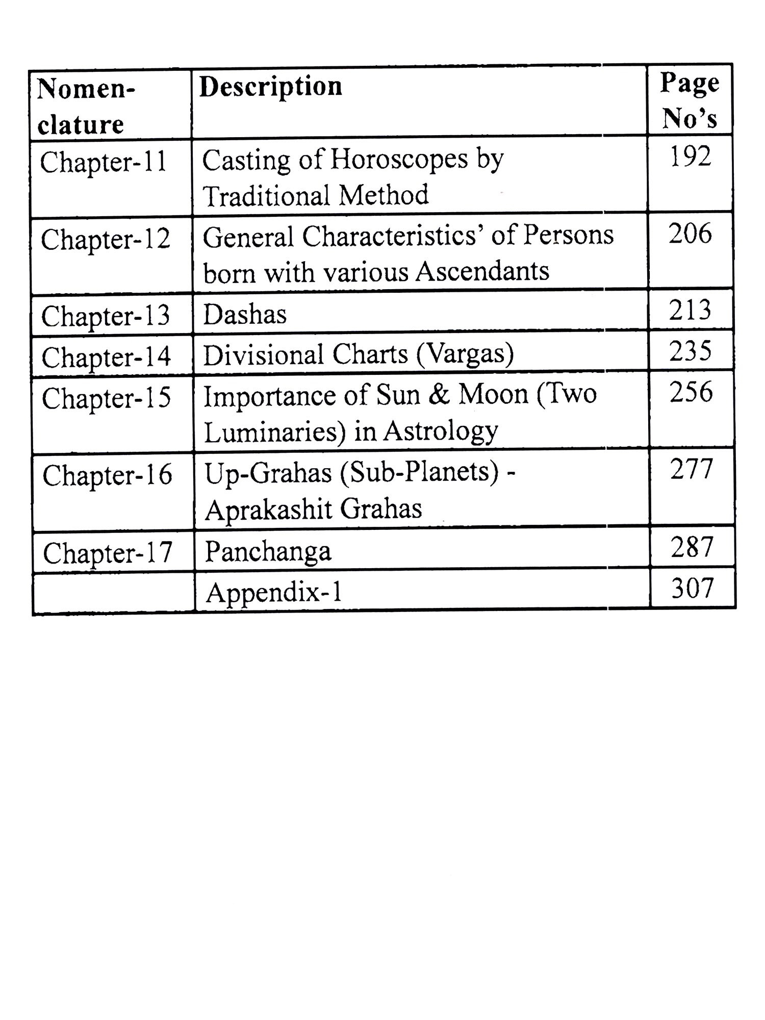 The subsequent chapters of this book deals with the essential aspects of mathematical astrology, necessary for the correct computation of the horoscopes according to the well laid out principles of astrological parameters.