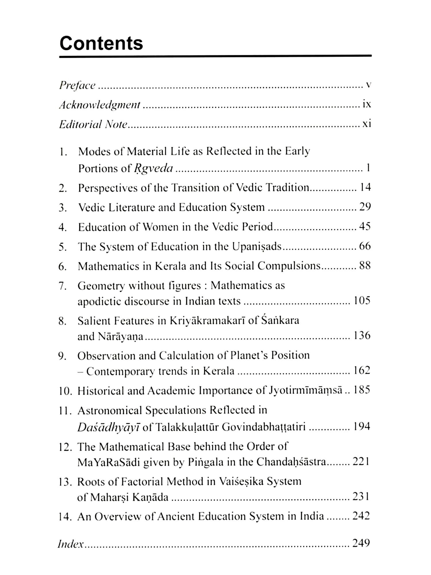 The second part deals with the profound and tremendous tradition of Mathematics and Astronomy in Kerala. The rich past in the mathematical history of Kerala has not been studied much by scholars. The articles are serious perceptions or discourses to the knowledge hubs like Talakkulathu Govindan Bhaţţatiri, Putumana Somayāji, Vațasseri Paramesvaran and Sankaranarayaņan. The oral tradition in the Vedic education system has influenced scientific treatises like gaņitam, jyotişam, ayurvedam, and so on.