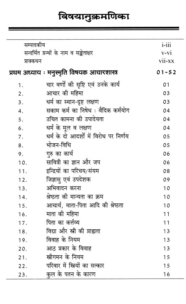 ग्रन्थ का कलेवर छोटा रखने का पूरा प्रयास है। विशेष की जिज्ञासा होने पर आकर ग्रन्थों को विद्वान् लोग देख सकते हैं। मन्वादि स्मृतियों के अनुसार जीवनयापन करने वाले महापुरुषों के लिए यह पुस्तक विकल्प नहीं प्रस्तुत करती है। वे महापुरुष सूर्य की तरह तेजस्वी हैं जिन्हें दीपक की आवश्यकता नहीं है। किन्तु अधिकांश लोग ऐसे हैं जो धार्मिक जीवन जीना चाहते हैं परन्तु शास्त्रों के समुद्र में गोता लगाना उनके वश में नहीं है, ऐसे लोग परम्परा से प्राप्त ज्ञान द्वारा काम चलाते हैं। परम्पराएँ धर्म की रक्षक होती हैं, किन्तु कभी-कभी वे विकृत रूप धारण कर लेती हैं। यह पुस्तक विकृति के निवारण पूर्वक, सामान्य लोगों को, मार्गदर्शन के लिए दीपक का काम करेगी। यही अनुबन्ध चतुष्टय है। अधिकारी के विषय स्पष्ट किया जाता है कि जो मन्वादि द्वारा प्रतिष्ठित या वैदिक धर्म के पालन के लिए इच्छुक श्रद्दधान नहीं हैं, वे हिन्दू होते हुए भी, इस पुस्तक को पढ़ने के अधिकारी नहीं हैं। इससे उनका अनावश्यक श्रम होगा।