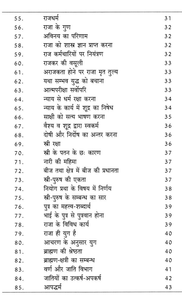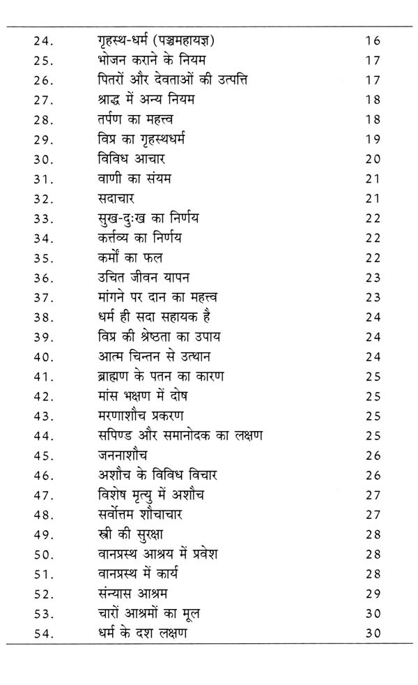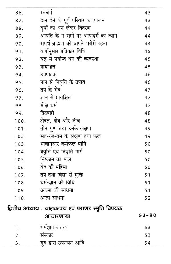पुरानी स्मृतियों तथा विशालकाय ग्रन्थों में से वर्तमान में प्रासंगिक अंश ही इसमें हैं। मानव धर्म, प्रायश्चित्त, राजधर्म, अध्यात्मविद्या तथा सार्वभौम नीतियों का संग्रह इसमें मिलेगा।