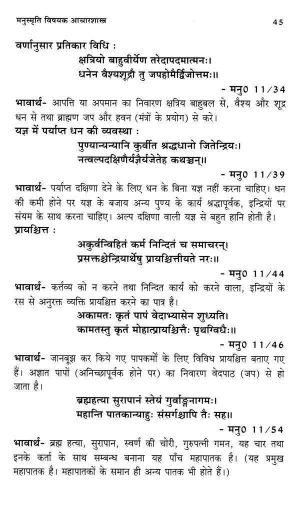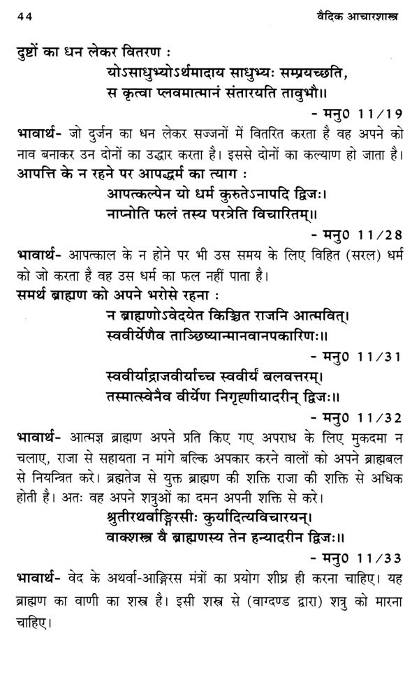 प्रस्तुत ग्रन्थ में लेखक ने याज्ञवल्क्य स्मृति, पराशर स्मृति, वाल्मीकि रामायण, महाभारत, श्रीमद्भगवत्गीता, उपनिषद्, योगशास्त्र, संक्षेप शारीरिक, पञ्चदशी, कठोपनिषद्, मुण्डकोपनिषद्, छान्दोग्योपनिषद, वृहदारण्यकोपनिषद्, पातञ्जलि योगशास्त्र विभिन्न स्फुट सूक्तियों में आचारशास्त्र के विभिन्न विषयों को संकलित कर युगानुरूप विवेचित किया है।