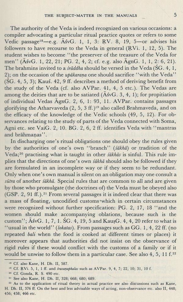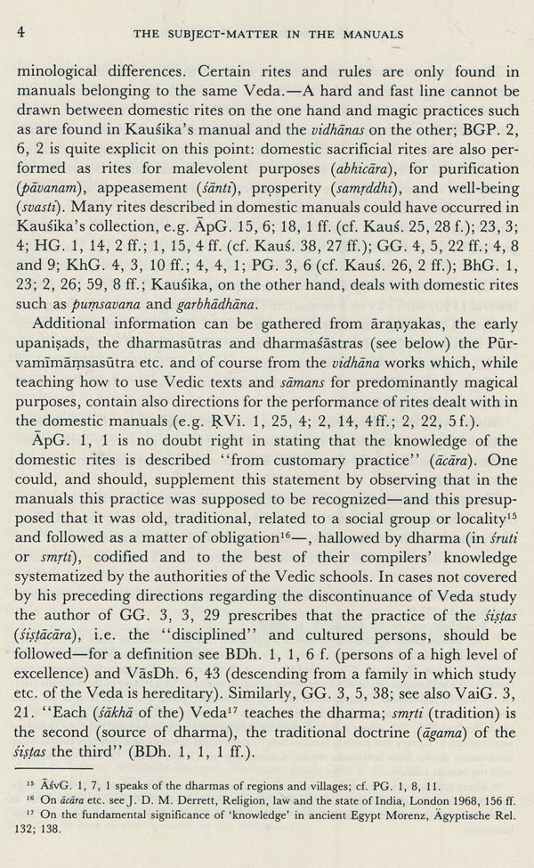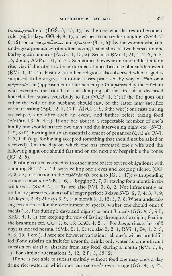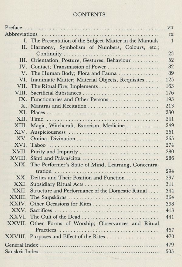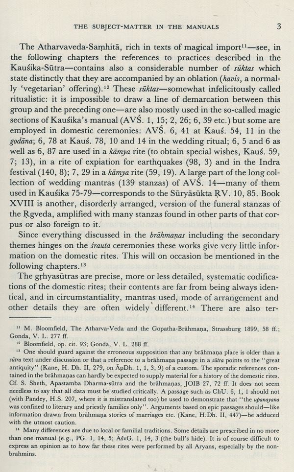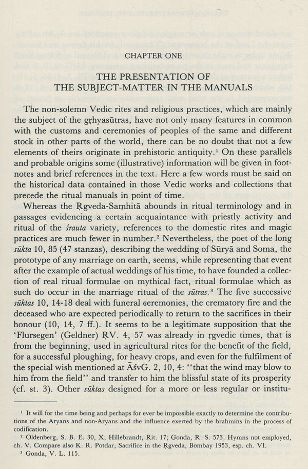 This book does not cover all aspects of Vedic ritualism. For information on its general religious context and background the reader may be referred to my Religionen Indians, I. The original sources and their chronology, literary aspects, etc. are discussed in my Ritual Sutras, which, being a volume of a History of Literature, should not have been expected thoroughly to deal with the intricacies and technicalities of the rituals, with their sociological background or with problems of the history of Indian civilization Questions regarding the relations between the Vedic ritual on the one hand and the prae- and non-Vedic rituals on the other have in all three books been designedly left out of consideration or only been touched upon in passing. The time is not yet ripe for an objective and comprehensive survey of the relevant problems. Moreover, reliable information on the historical facts and their significance for the Indians is in my opinion of greater interest and importance than our speculations on prehistoric origins. To sketch just yet all influences that the domestic rites might have undergone and exerted, all the relations which might have existed with customs, law and religions of Aryans and non-Aryans would have been to produce an encyclopaedia containing too many hypotheses. As mere assertion unconfirmed by textual evidence is extremely unsatisfactory I have made it a rule to support every statement by at least one text-place. While endeavouring to avoid any dominating and comprehensive theories I have, without aiming at completeness, not limited myself to systematically arranging the many data contained in the sutra texts and the related literature but also attempted to explain a considerable number of rites and ceremonies from the functional and historical points of view as well as from the angle of the comparative study of religions. If however some rite or ritual has already been satisfactorily explained by my predecessors a brief reference to their publications could in most cases suffice. The many references made to some modern works on other religions are mainly intended to add to the parallels and bibliographical notes found in two or three well-known handbooks on religious phenomena and so to illustrate the significance of the rites under discussion by some more specific examples.