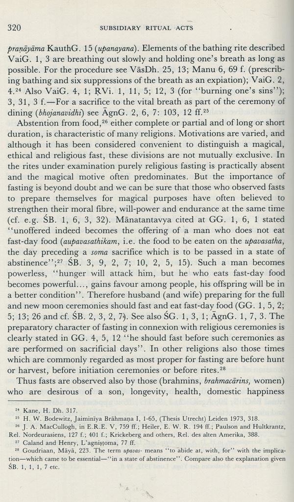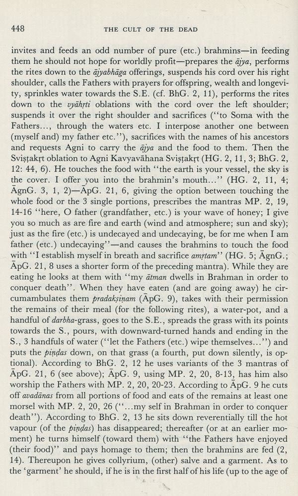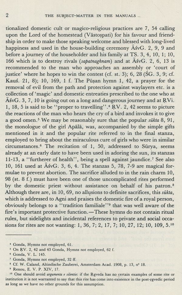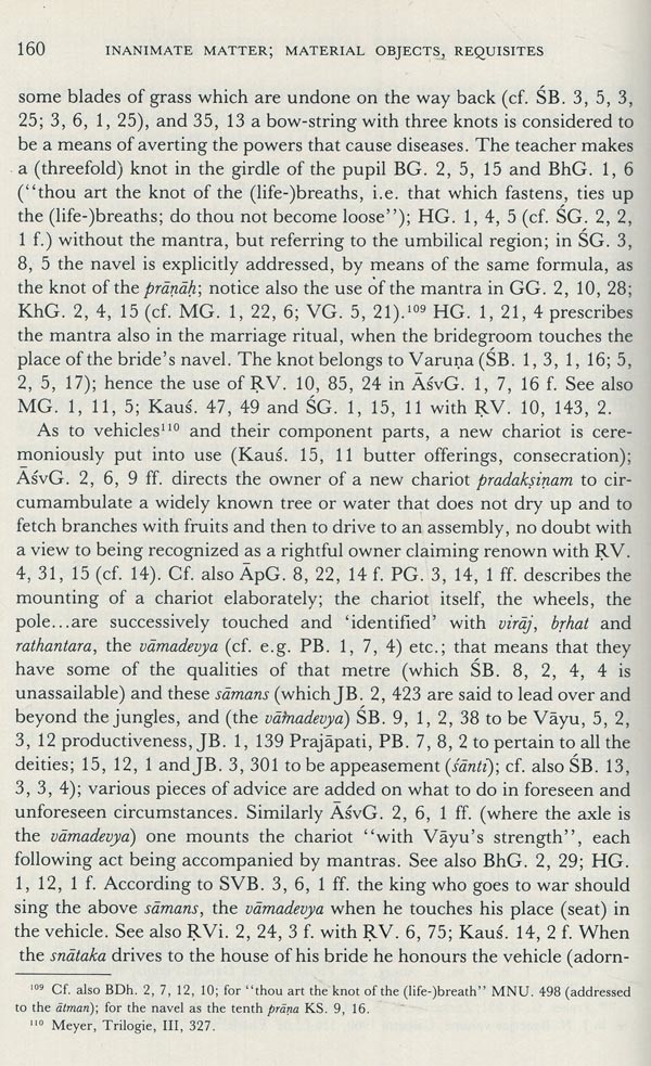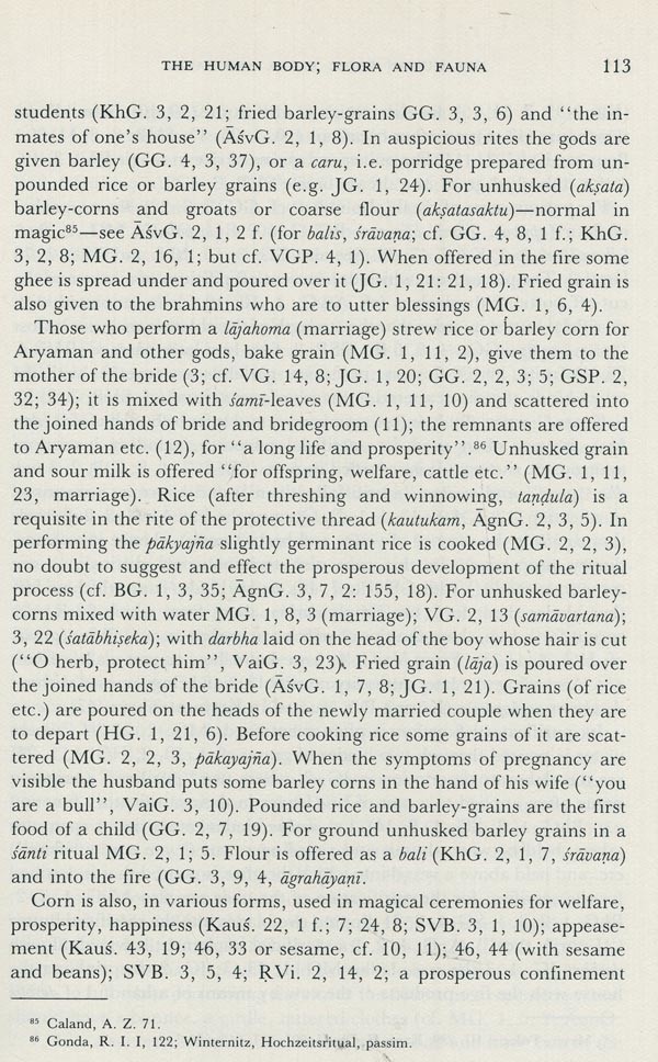 This book does not cover all aspects of Vedic ritualism. For information on its general religious context and background the reader may be referred to my Religionen Indians, I. The original sources and their chronology, literary aspects, etc. are discussed in my Ritual Sutras, which, being a volume of a History of Literature, should not have been expected thoroughly to deal with the intricacies and technicalities of the rituals, with their sociological background or with problems of the history of Indian civilization Questions regarding the relations between the Vedic ritual on the one hand and the prae- and non-Vedic rituals on the other have in all three books been designedly left out of consideration or only been touched upon in passing. The time is not yet ripe for an objective and comprehensive survey of the relevant problems. Moreover, reliable information on the historical facts and their significance for the Indians is in my opinion of greater interest and importance than our speculations on prehistoric origins. To sketch just yet all influences that the domestic rites might have undergone and exerted, all the relations which might have existed with customs, law and religions of Aryans and non-Aryans would have been to produce an encyclopaedia containing too many hypotheses. As mere assertion unconfirmed by textual evidence is extremely unsatisfactory I have made it a rule to support every statement by at least one text-place. While endeavouring to avoid any dominating and comprehensive theories I have, without aiming at completeness, not limited myself to systematically arranging the many data contained in the sutra texts and the related literature but also attempted to explain a considerable number of rites and ceremonies from the functional and historical points of view as well as from the angle of the comparative study of religions. If however some rite or ritual has already been satisfactorily explained by my predecessors a brief reference to their publications could in most cases suffice. The many references made to some modern works on other religions are mainly intended to add to the parallels and bibliographical notes found in two or three well-known handbooks on religious phenomena and so to illustrate the significance of the rites under discussion by some more specific examples.