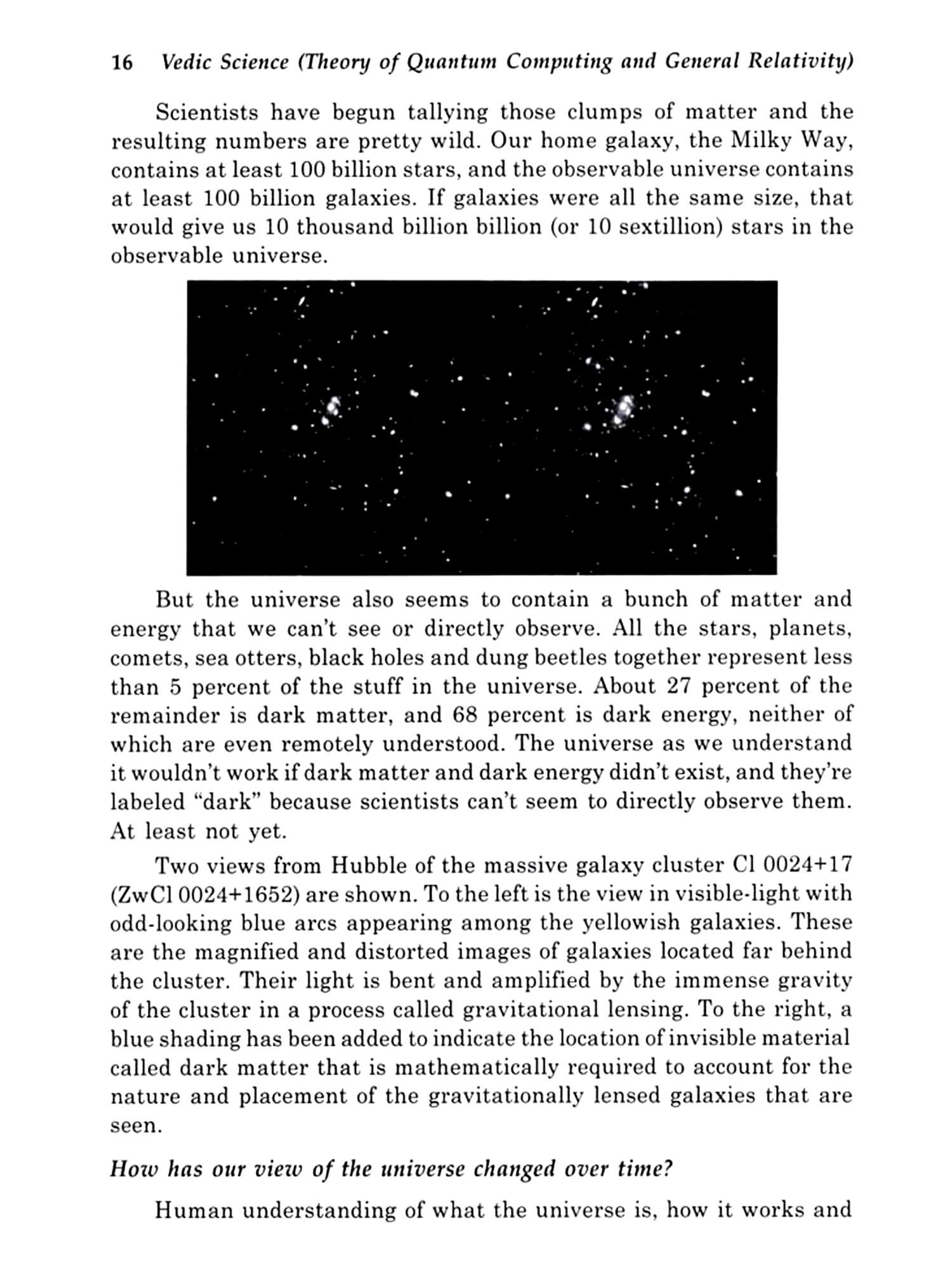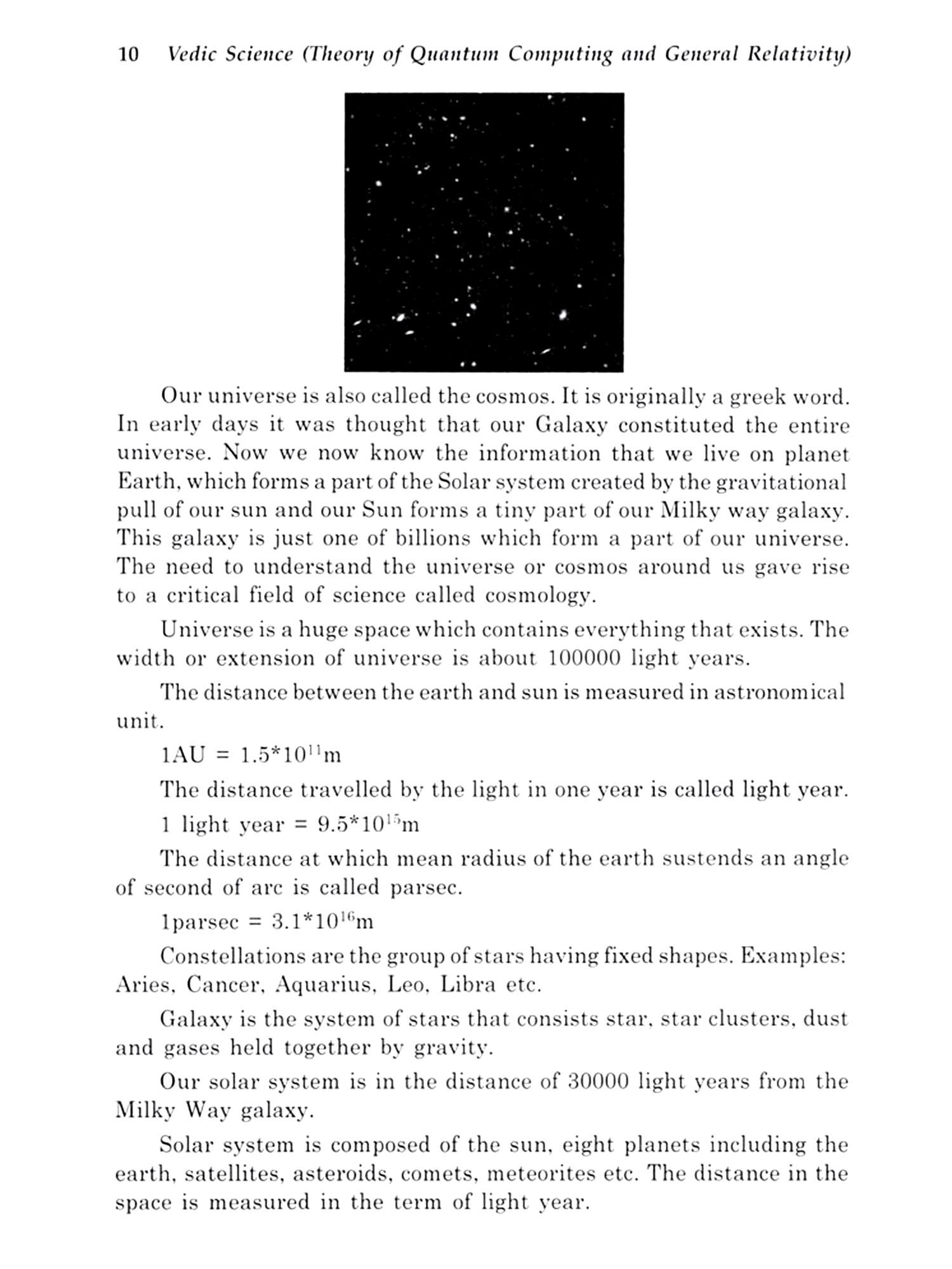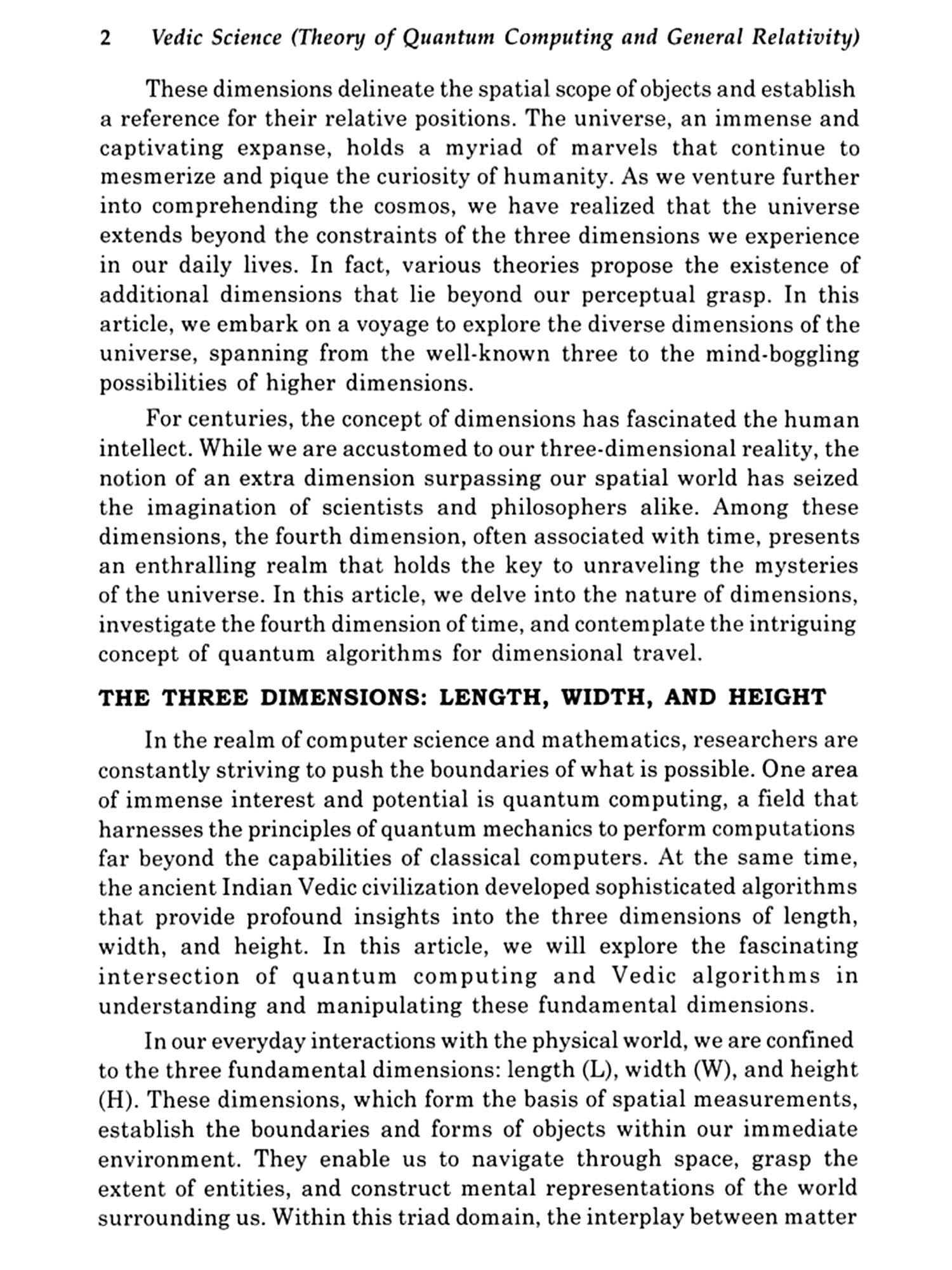 Vedic science, rooted in ancient Indian scriptures, offers profound insights into the nature of reality, time, and space. The philosophical and mathematical principles found in the Vedas, Upanishads, and texts like the Surya Siddhanta and Nasadiya Sukta align with modern scientific discoveries, including quantum computing and general relativity. These ancient texts describe cosmic structures, the concept of interconnected consciousness, and the fundamental nature of existence, resembling ideas in contemporary physics. The Nasadiya Sukta, also known as the Hymn of Creation, presents a strikingly similar concept to quantum mechanics. It speaks of an undefined, fluctuating state before creation, which aligns with quantum superposition, where particles exist in multiple states simultaneously. Additionally, the interconnected nature of all things described in Advaita Vedanta resembles quantum entanglement, where particles share an intrinsic link regardless of distance. General relativity, formulated by Albert Einstein, describes the warping of space-time due to gravity. Ancient Vedic texts discuss Akasha (ether) and Kala (time) as fundamental elements governing cosmic order. The Surya Siddhanta, an ancient Indian astronomical text, contains precise calculations about planetary motion, which eerily predate Newtonian and Einsteinian gravitational theories. The concept of Maya (illusion) in Vedic philosophy suggests that realit is not as fixed as it appears, much like the probabilistic nature of quantu mechanics. Quantum physics challenges classical notions of reality, suggestin that particles behave differently when observed. This aligns with the ic that consciousness plays a role in shaping reality, a concept deeply embede in Vedic metaphysics. In quantum computing, the use of qubits-which exist in multiple st at once can be linked to the Vedic concept of multiple realities coexist Ancient sages speculated about parallel dimensions and higher state consciousness, resembling modern discussions on quantum parallelisn multiverse theories. The fusion of Vedic logic with quantum principles may provide new avenues for advancing artificial intelligence and computational models. Time, a crucial aspect of general relativity, is deeply explored in Vedic traditions. The concept of Cyclic Time (Kala Chakra) in Hindu cosmology suggests that time is non-linear, with repeating cycles of creation and destruction. This aligns with Einstein's theory of relativity, which suggests that time is not absolute but rather dependent on the observer's frame of reference. By integrating Vedic insights with modern physics, researchers can explore alternative perspectives on space, time, and the nature of reality. The convergence of ancient wisdom with advanced science opens doors to groundbreaking discoveries in computing, cosmology, and our understanding of the universe. Ancient Vedic texts contain profound insights into the nature of reality, space, and time, which intriguingly align with modern theories of quantum mechanics and relativity-this book aims to bridge these realms of knowledge.