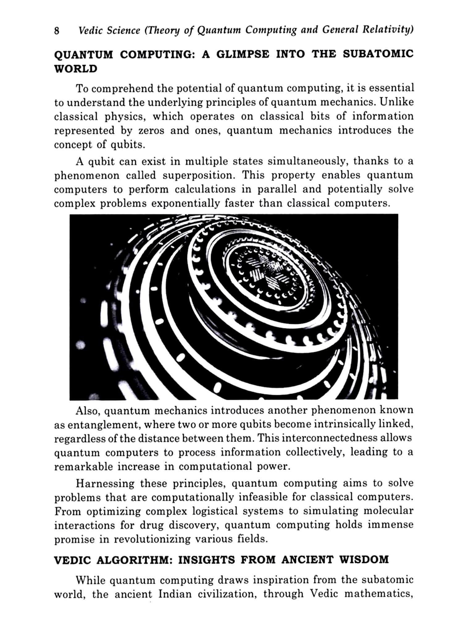 Vedic science, rooted in ancient Indian philosophy, has profound connections to modern scientific concepts, including quantum computing and general relativity. The Vedas, Upanishads, and ancient Sanskrit texts explore cosmic principles, consciousness, and the nature of reality, which align with modern scientific theories. Quantum computing, based on the principles of superposition and entanglement, finds parallels in Vedic thought. The concept of interconnectedness, as described in Advaita Vedanta, resembles the idea of quantum entanglement, where particles remam connected regardless of distance. The Nasadiya Sukta in the Rigveda describes a formless, fluctuating universe, similar to quantum field theory General relativity, formulated by Albert Einstein, describes how gravity affects space-time, Ancient texts discuss Akasha (ether) and Kala (time) as fundamental aspects of cosmic structure, resembling Einstein's space-time continuum. The Surya Siddhanta, an ancient astronomical treatise, contains insights into planetary motion and gravitational forces, foreshadowing Newtonian and Einsteinian physics. The fusion of Vedic philosophy with quantum mechanics and relativity suggests a deeper understanding of the universe. As scientific research advances, exploring these ancient insights may provide new perspectives on consciousness, time, and the fabric of reality, bridging ancient wisdom with modern technological advancements. This book explores the fascinating intersections between Vedic science, quantum computing, and general relativity, revealing ancient wisdom's relevance to modern physics.