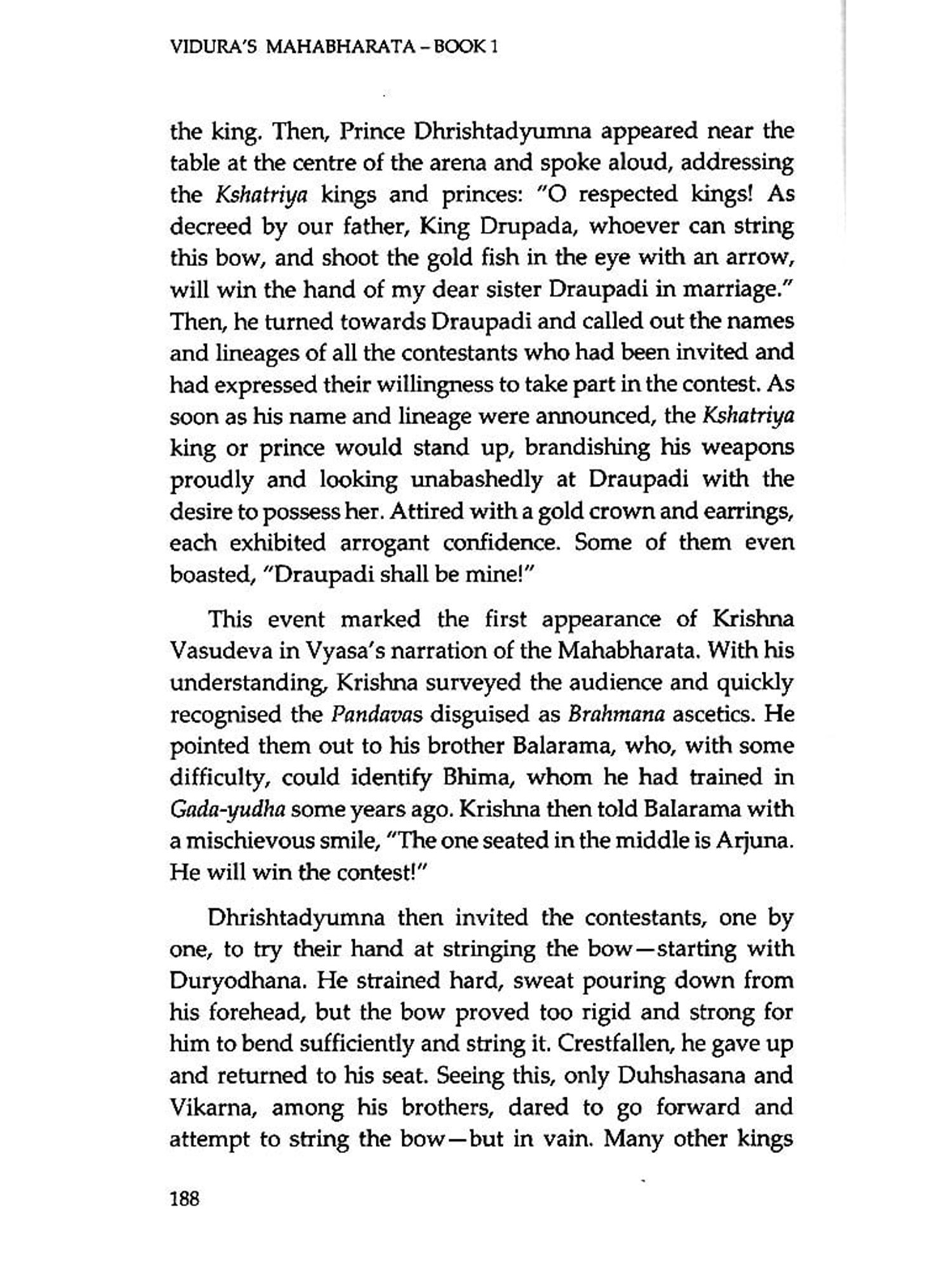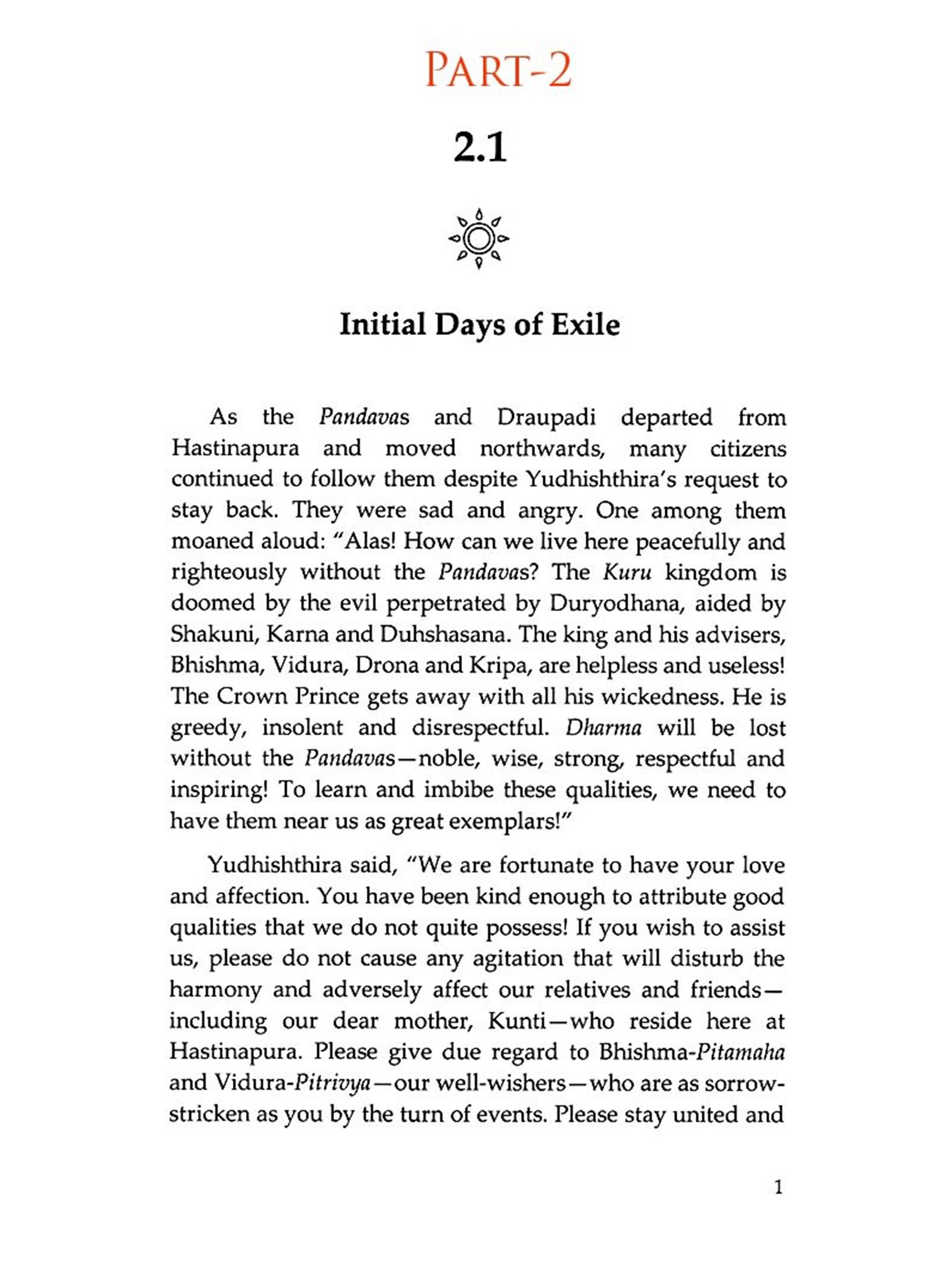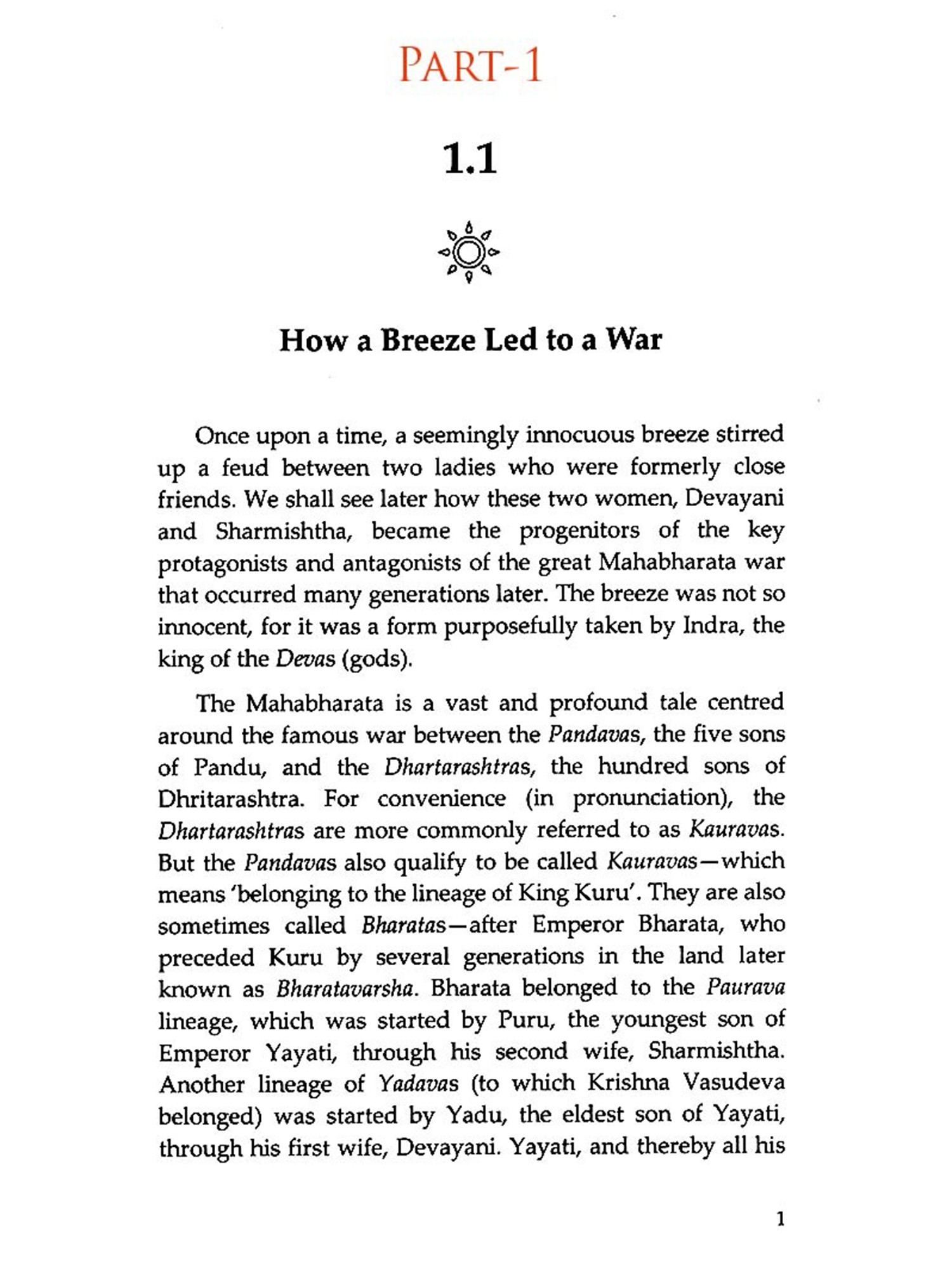 In many depictions, such stories are often sanitised to portray characters as wholly 'good' and noble or 'bad' and evil. This simplistic approach may be meaningful while narrating these stories to little children. Still, it turns out to be untrue when encountering real people especially in the coming Kali-yuga. This retelling of the Mahabharata attempts to stay true to Vyasa's original rendering-in which all possible shades of good and evil are reflected.