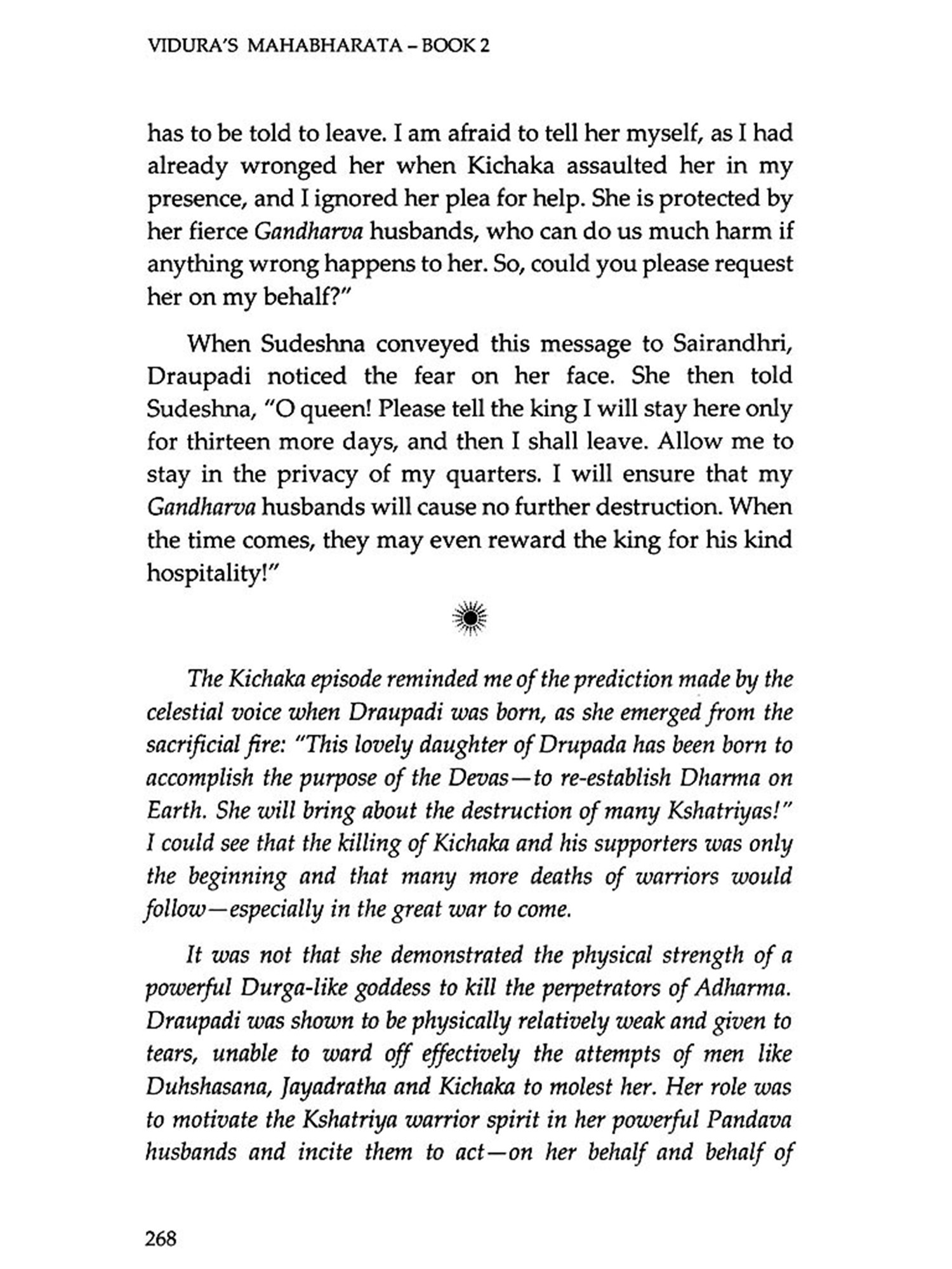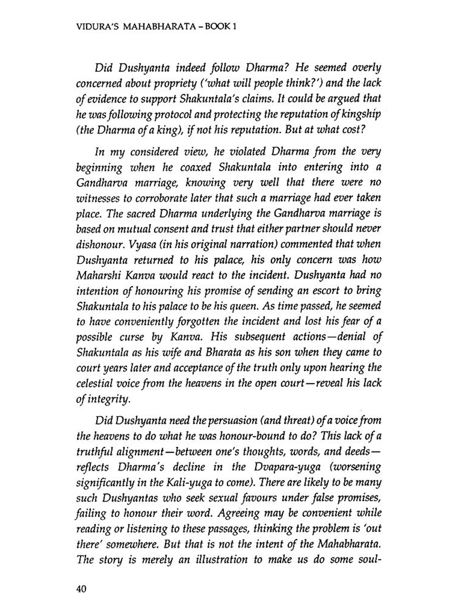 However, in this retelling of Vyasa's Mahabharata, I have taken the liberty to intersperse the narration of the key events with my commentary (narrated in first person¹)-for whatever it is worth. As you know, I have always been obsessed with discerning right from wrong and understanding and establishing Dharma. And I have felt shocked at seeing even the noblest beings (including the gods or Devas) sometimes resorting to unrighteous (Adharmic) means to achieve their ends.