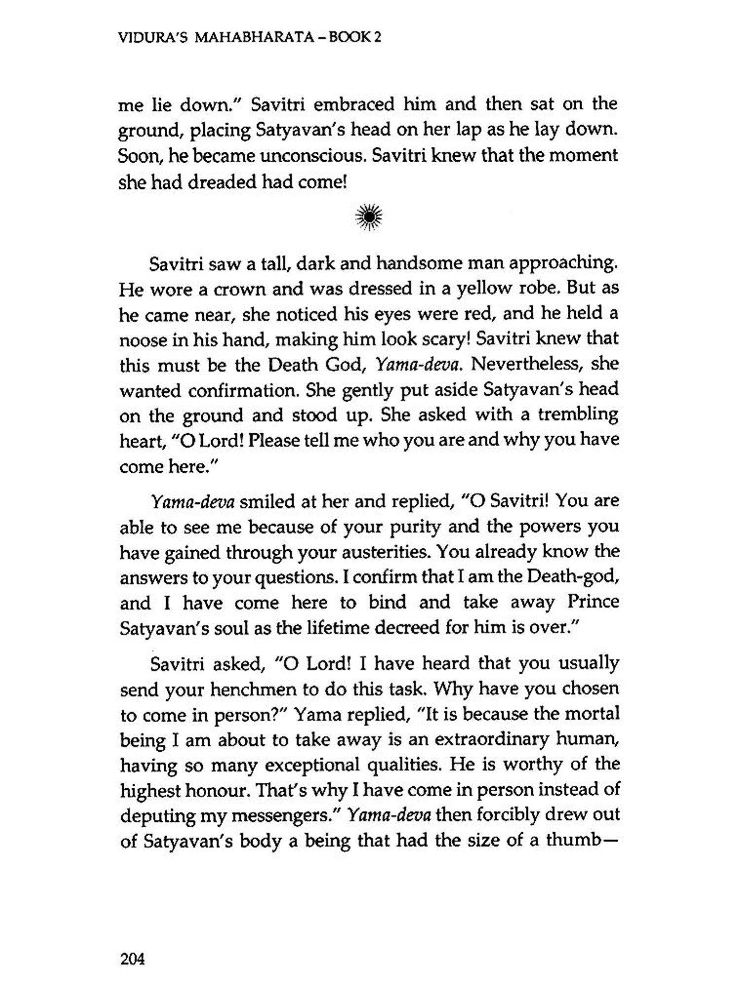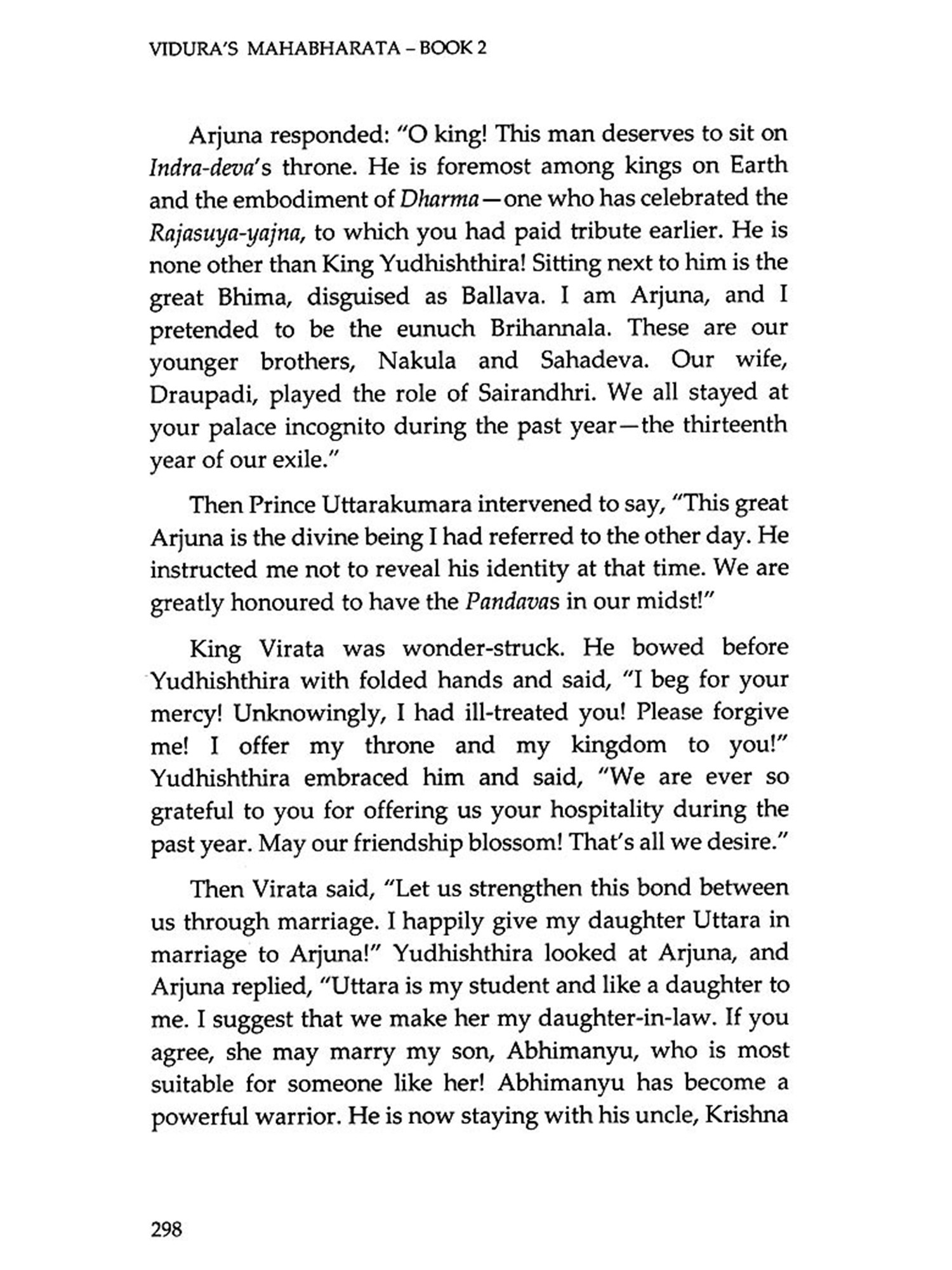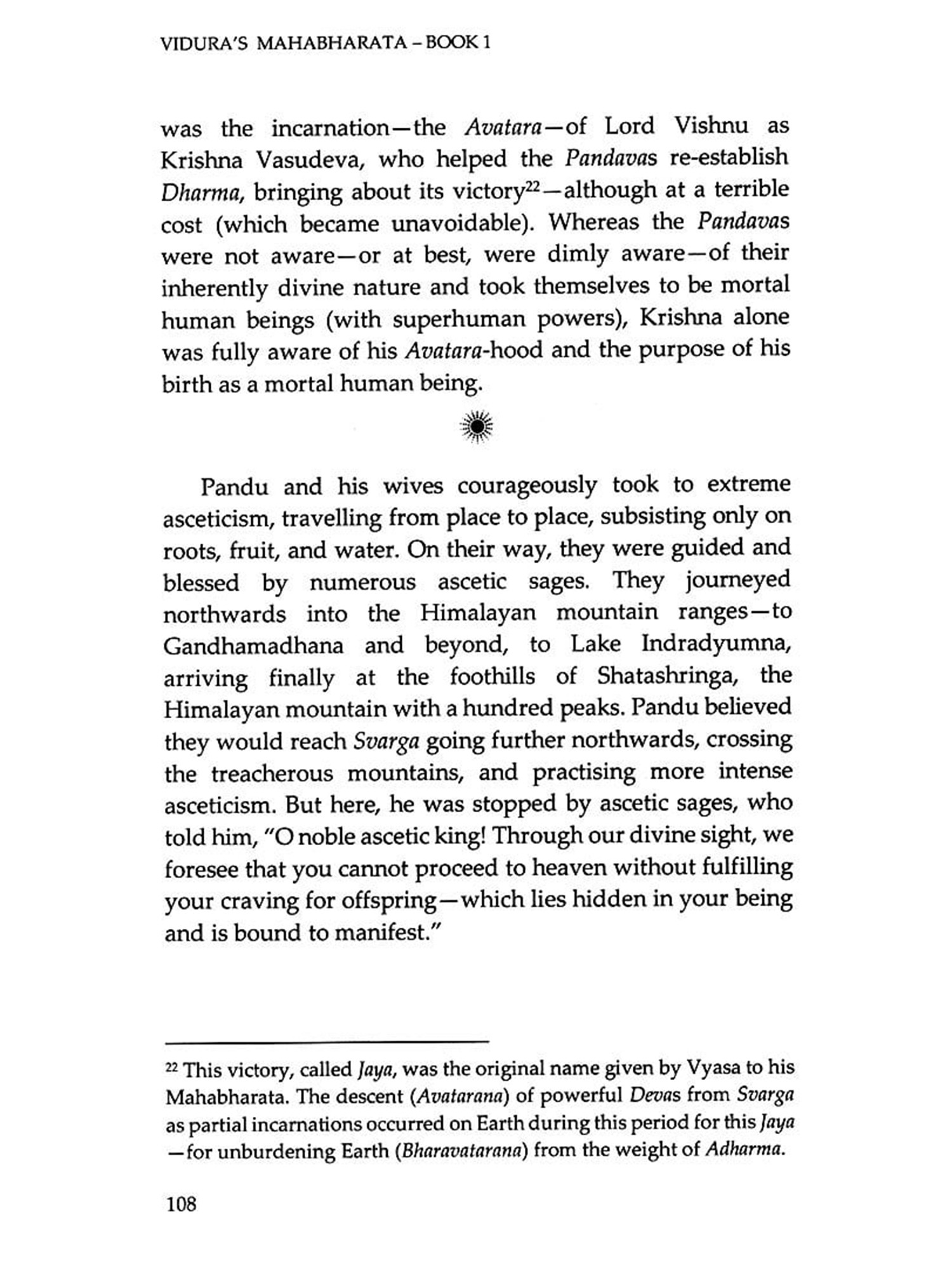 You have finally come, dear Yudhishthira! I have been waiting for this moment. My role as the character Vidura in this earthly lifetime is now ending. I feel a deep urge to share some of the lessons I have learnt before shedding this body. It is providential that you have come on time to see me in this wilderness, where I have been living as a renunciate. I can barely speak, so I am telepathically conveying the text of 'Vidura's Mahabharata' with the aid of the Yogic powers that have come naturally to me from my austerities.