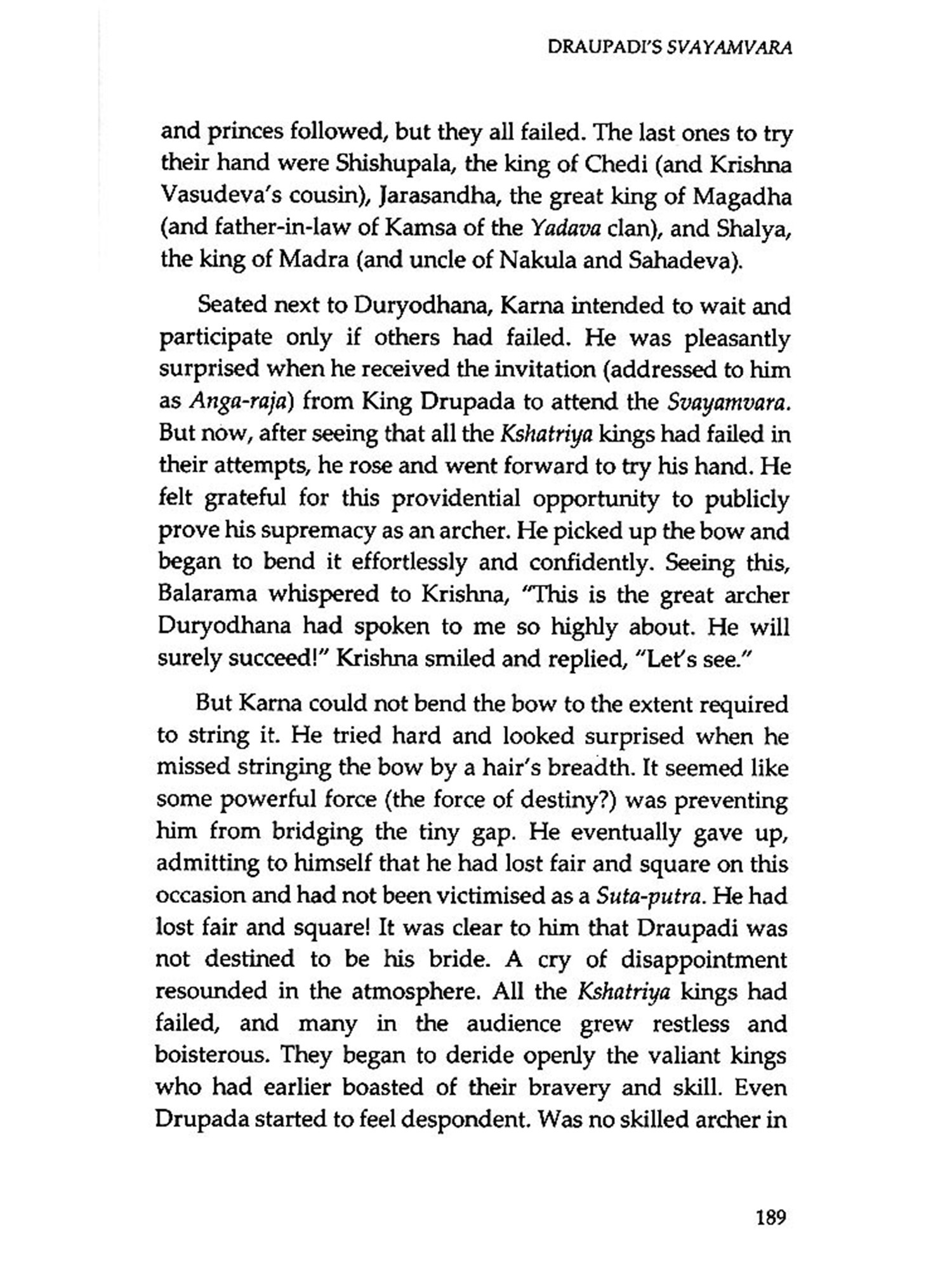 We need not worry about whether this epic work will ever see the light of day and reach those it is intended for in the years to come. If it is meant to happen, it will! This work in prose-is inspired by the great epic poem called 'Jaya' or 'Mahabharata', composed by Krishna Dvaipayana-popularly known as Maharshi Vyasa-who compiled the four Vedas. He also happens to be my dear father, whose wise counsel I have invoked repeatedly-taking advantage of a secret blessing he had bestowed upon me, "If you ever need my counsel, all you have to do is to think of me."