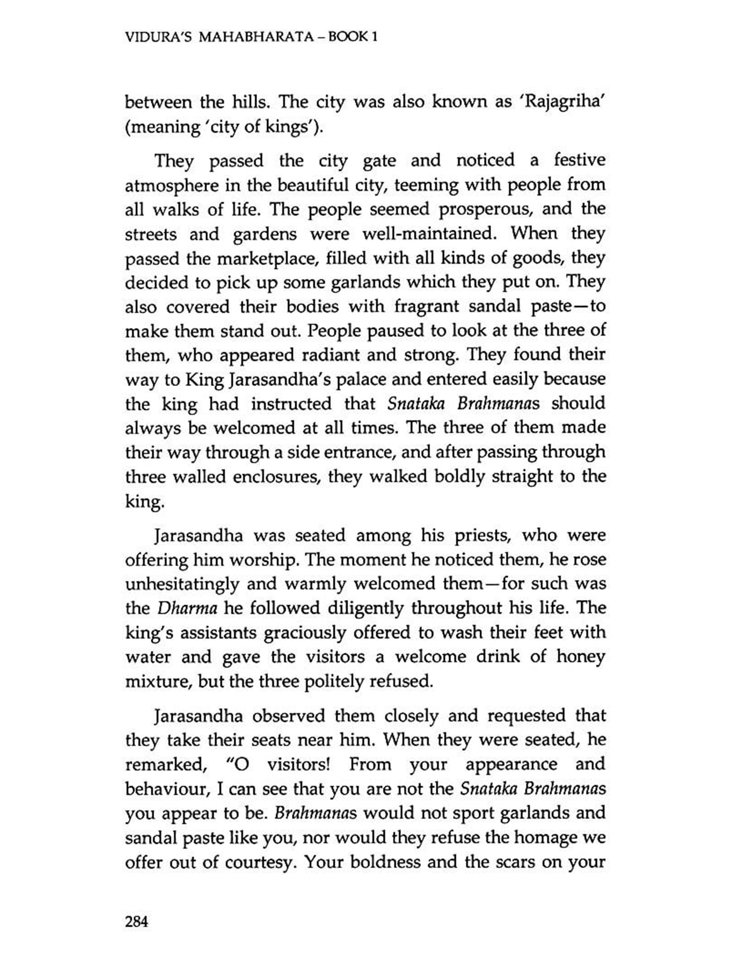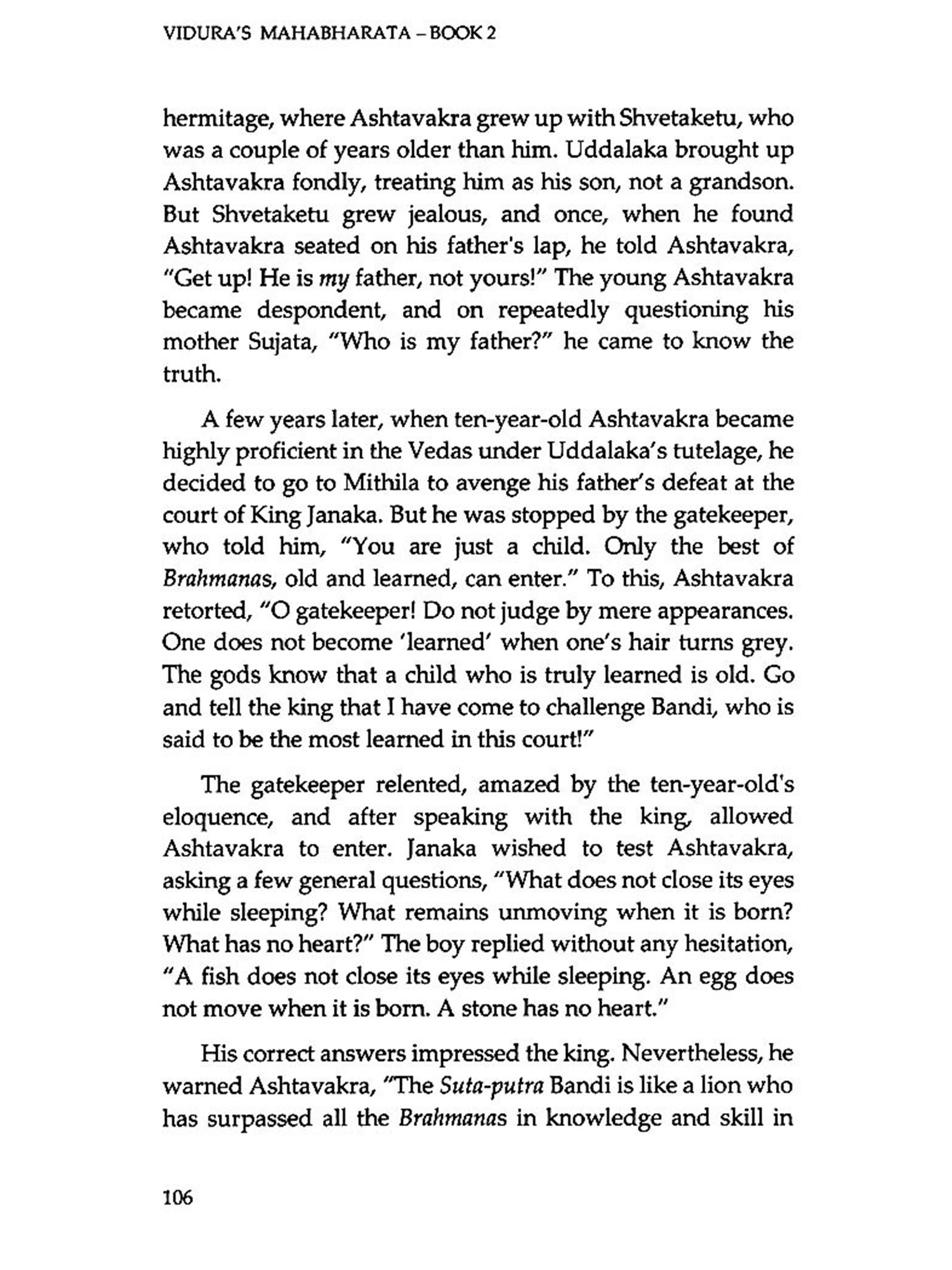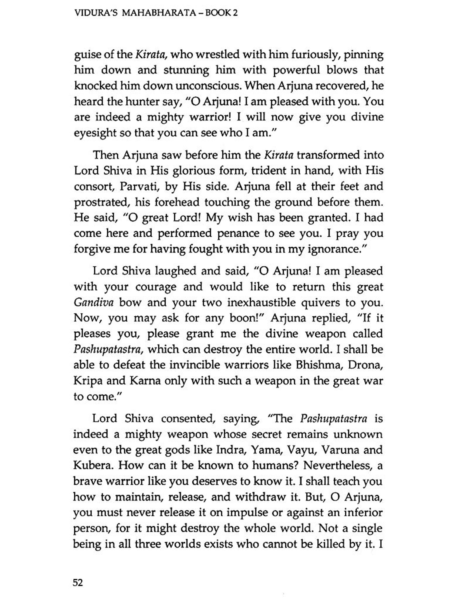 The text is a creative and concise translation of Vyasa's Mahabharata (Critical Edition). The author narrates the epic story through the perspective of Vidura (Vyasa's son). The main narrative, presented in the third person, is interspersed with Vidura's first-person commentary on the various characters and events, adding a distinctive touch to this retelling of the timeless tale of the Mahabharata. The lucid prose effortlessly guides readers through this epic journey, while Vidura's reflections encourage pauses to ponder moral dilemmas that remain as relevant and thought-provoking today as they were in ancient India.