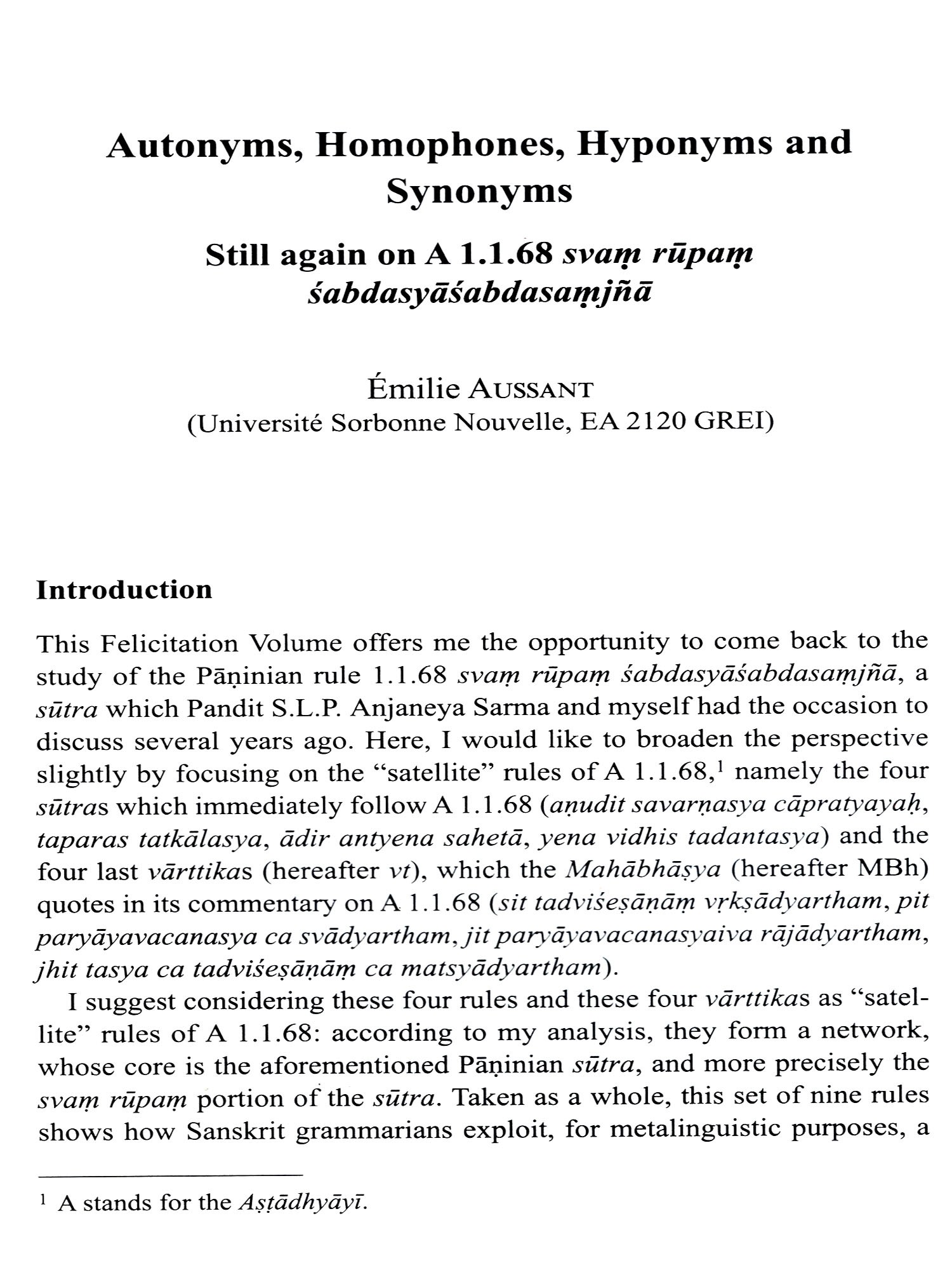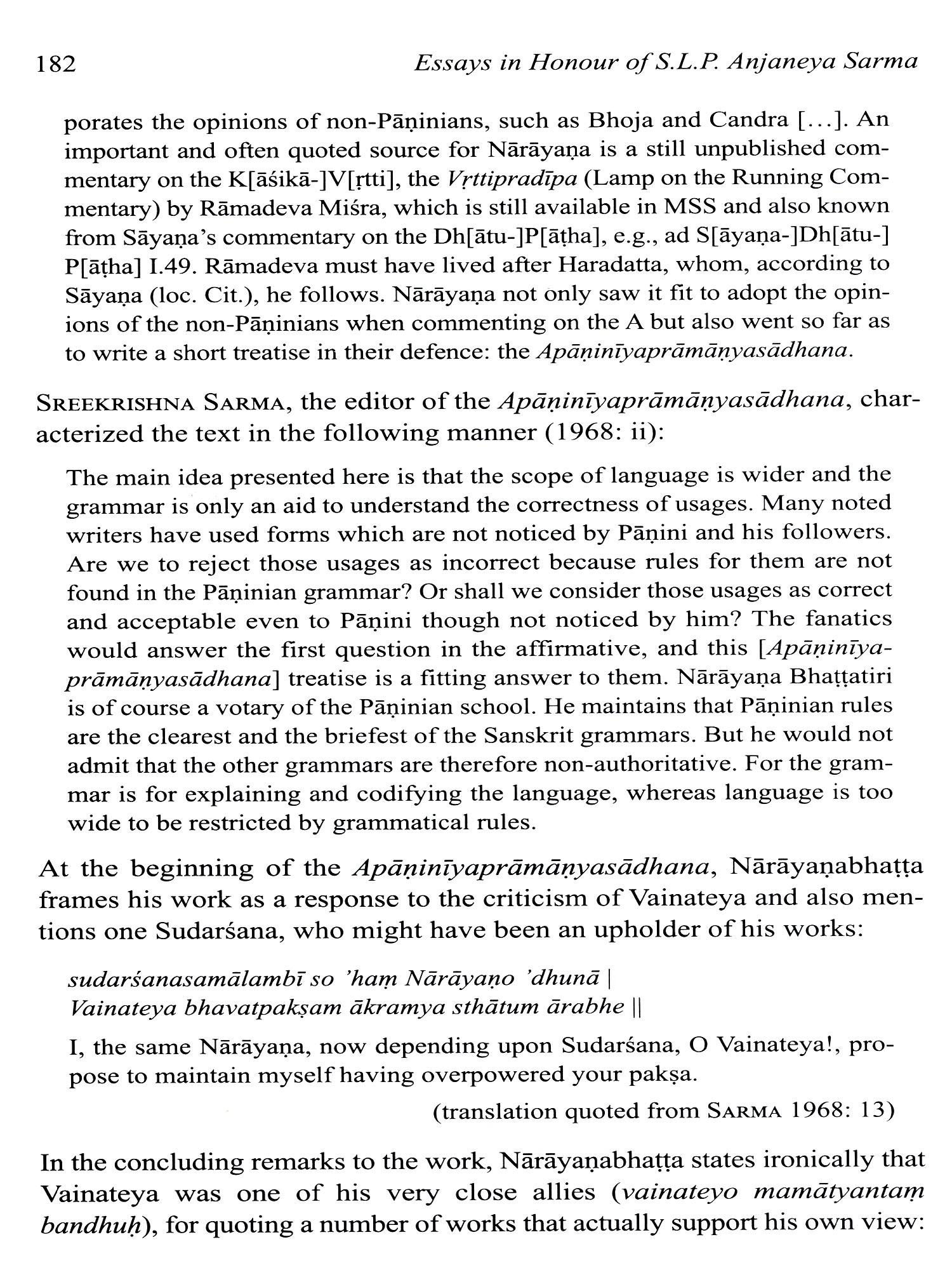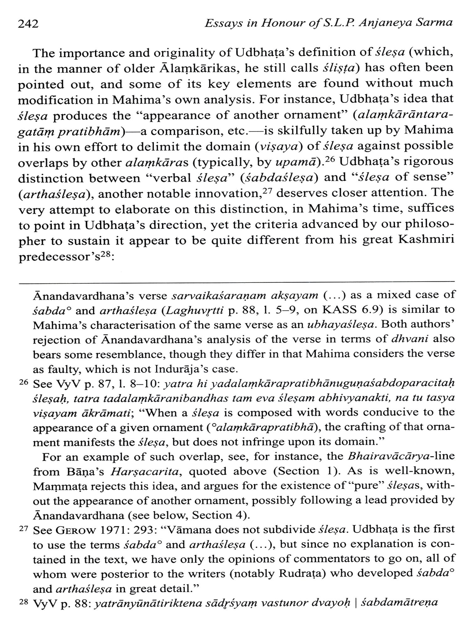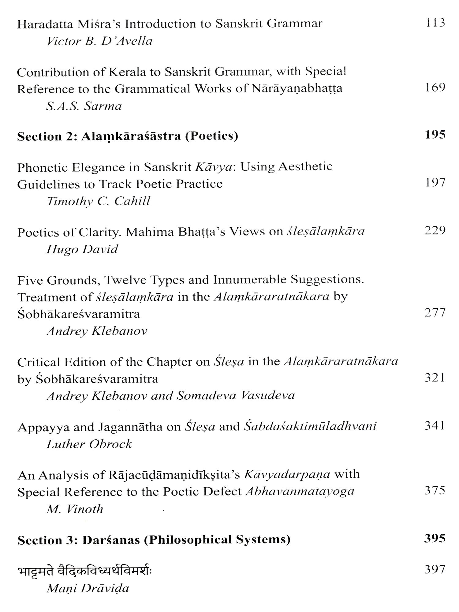 This collection of essays honours the significant contribution of Pandit S.L.P. Anjaneya Sarma to Indological Studies during the nearly forty years he spent at the Centre of the École francaise d'Extreme-Orient in Pondicherry. An accomplished scholar of traditional grammar (Vyakarana) and Advaita-Vedanta in his own right, with unquenchable intellectual curiosity and a true love for Sanskrit and Telugu, Anjaneya Sarma worked on many ambitious research projects pertaining to Indian belles-lettres and technical literature, while generously guiding researchers and students from all around the world in their own endeavours in the field of Sanskrit. The twenty-one essays by world-renowned researchers, who are all his students or colleagues, present recent advances in research in the four major fields he most passionately engaged in, namely Sanskrit grammar, poetics, philosophy and literary studies. All of them strive to echo the richness and depth of their authors' interactions with Prof. Sarma over the years, and are presented to him as a token of gratitude. They are preceded by a biography (in English and French), and by a complete bibliography of his published works.