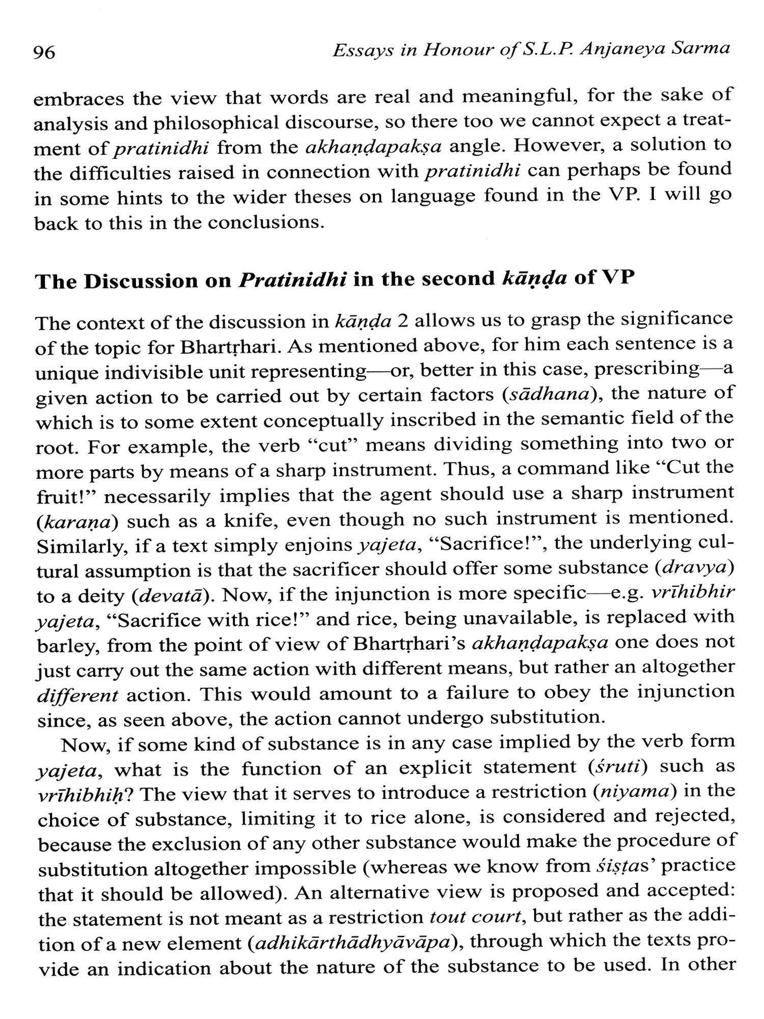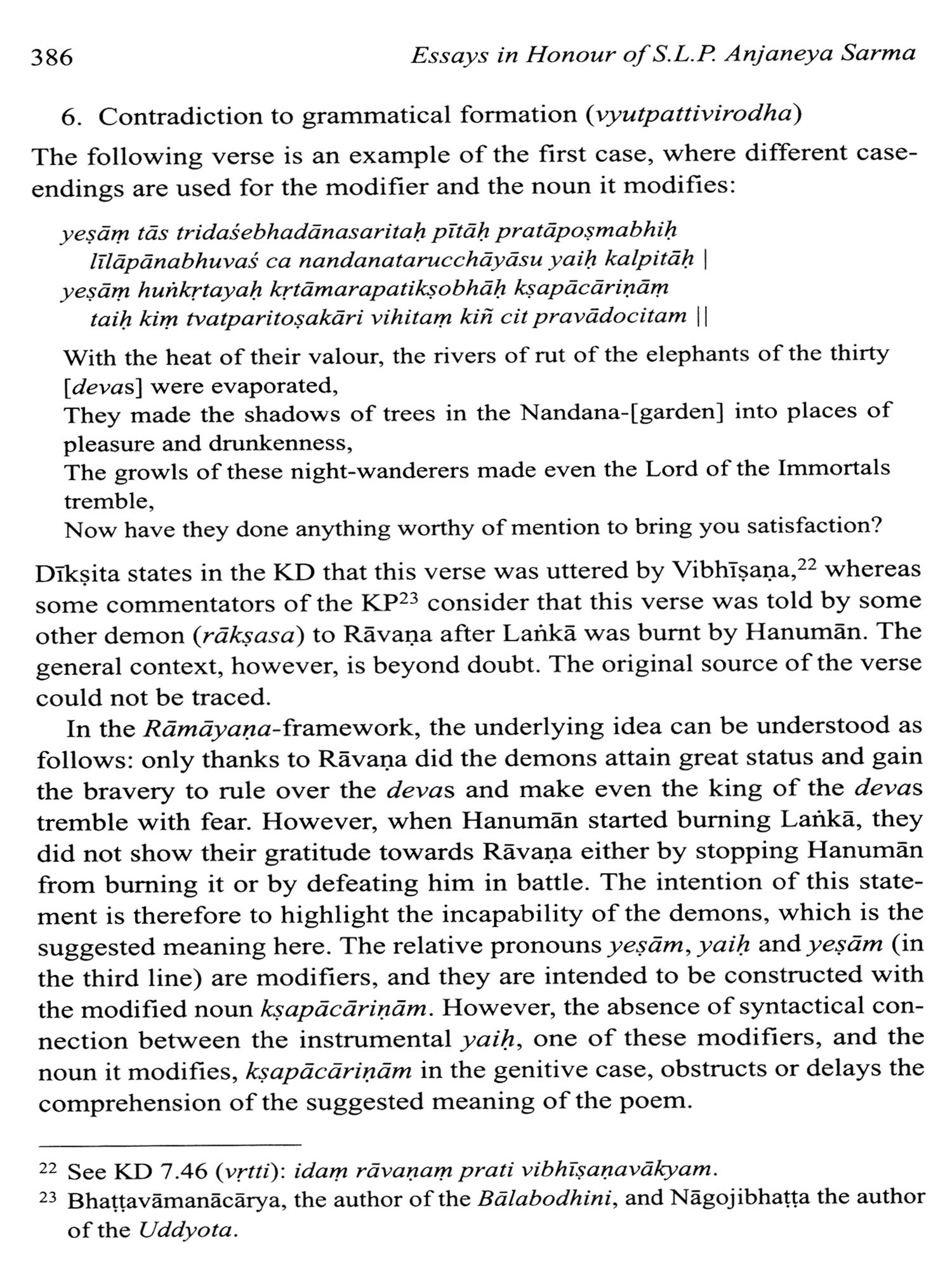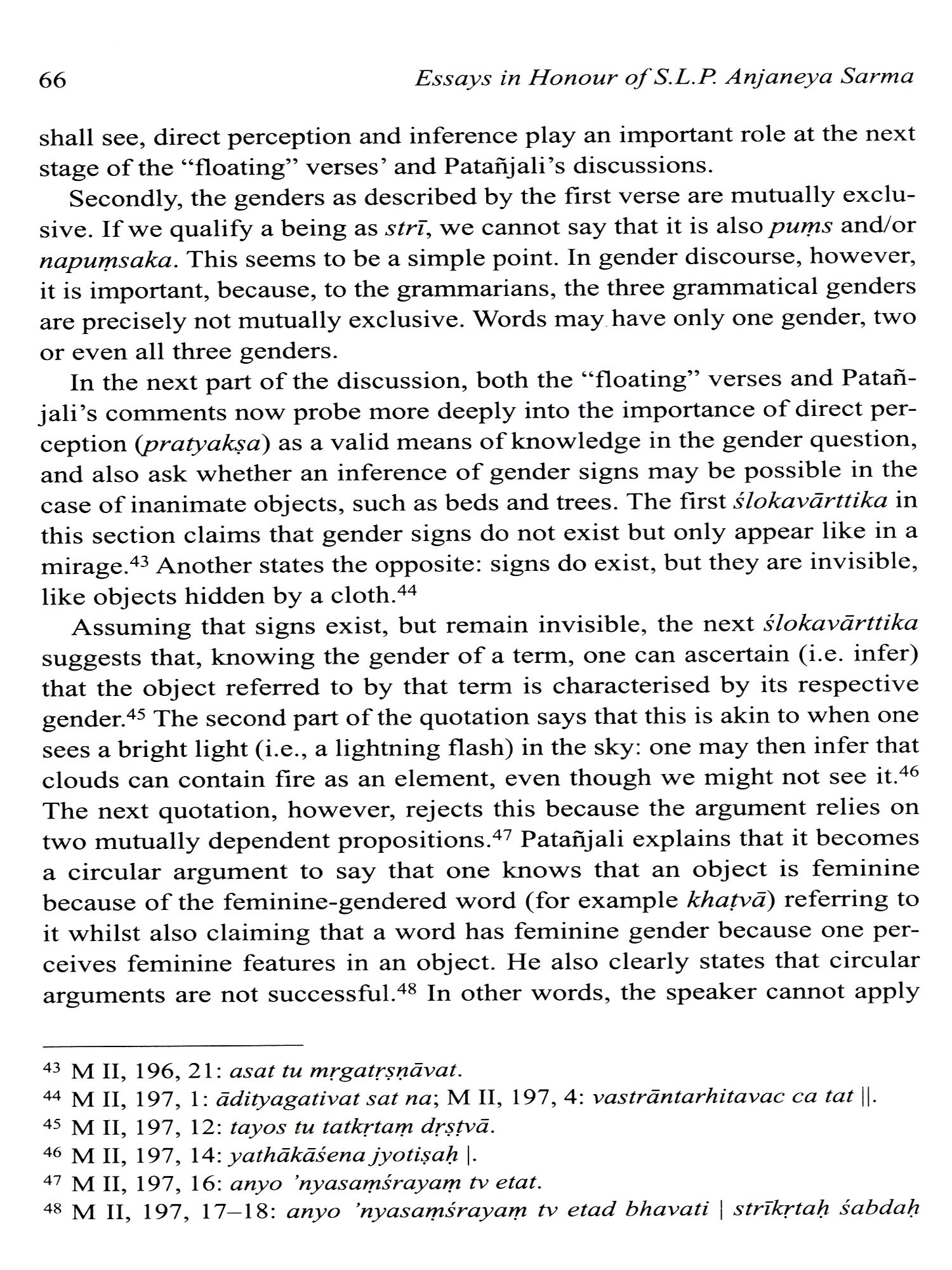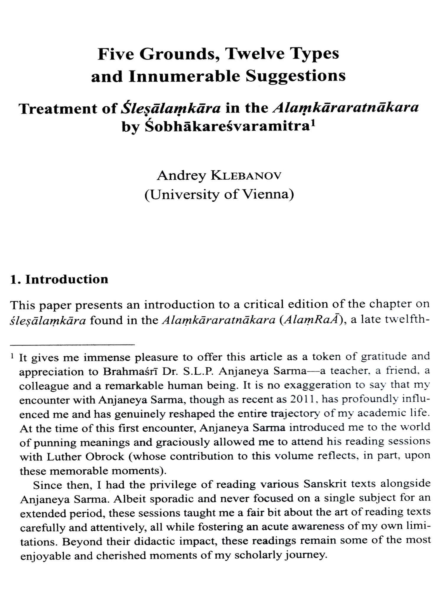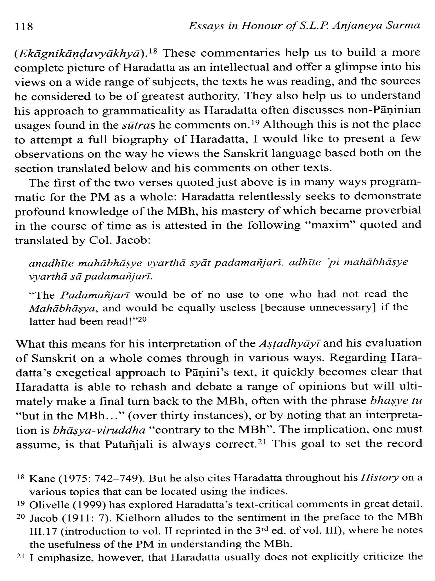 This collection of essays honours the significant contribution of Pandit S.L.P. Anjaneya Sarma to Indological Studies during the nearly forty years he spent at the Centre of the École francaise d'Extreme-Orient in Pondicherry. An accomplished scholar of traditional grammar (Vyakarana) and Advaita-Vedanta in his own right, with unquenchable intellectual curiosity and a true love for Sanskrit and Telugu, Anjaneya Sarma worked on many ambitious research projects pertaining to Indian belles-lettres and technical literature, while generously guiding researchers and students from all around the world in their own endeavours in the field of Sanskrit. The twenty-one essays by world-renowned researchers, who are all his students or colleagues, present recent advances in research in the four major fields he most passionately engaged in, namely Sanskrit grammar, poetics, philosophy and literary studies. All of them strive to echo the richness and depth of their authors' interactions with Prof. Sarma over the years, and are presented to him as a token of gratitude. They are preceded by a biography (in English and French), and by a complete bibliography of his published works.