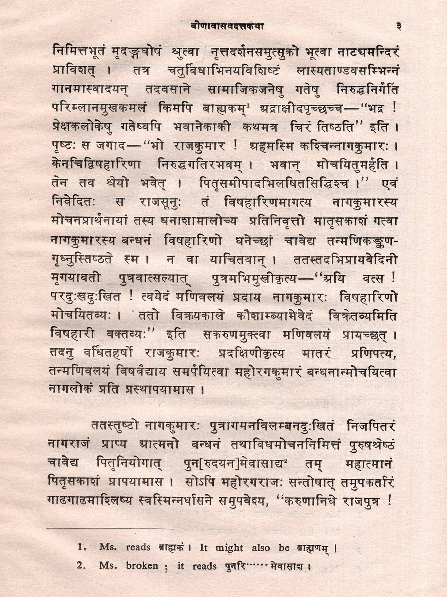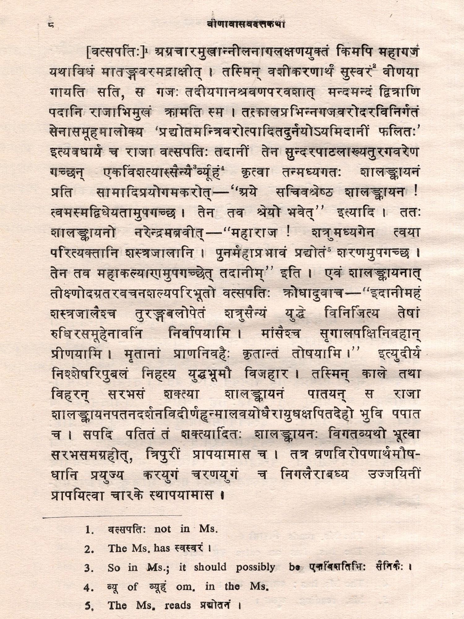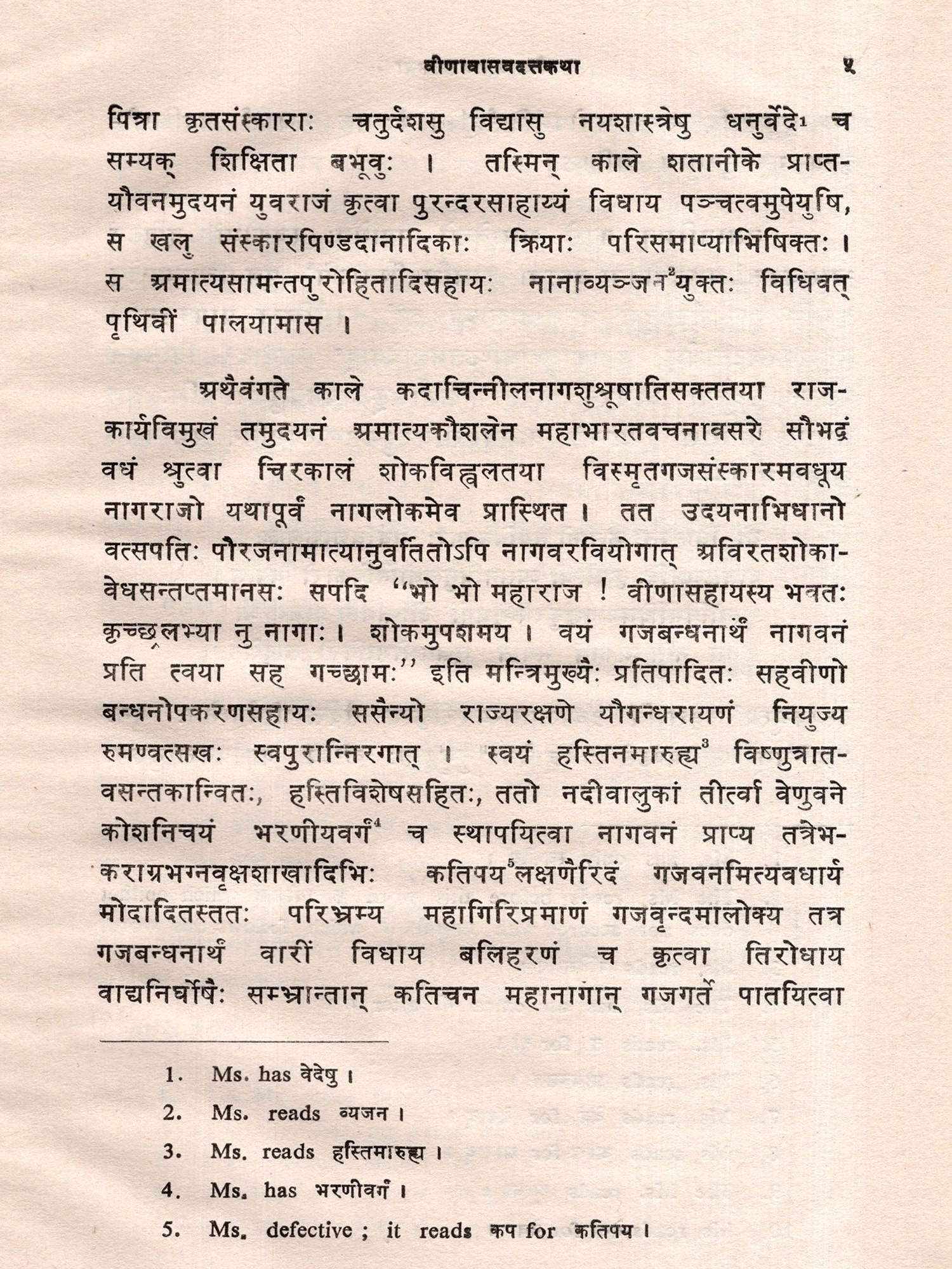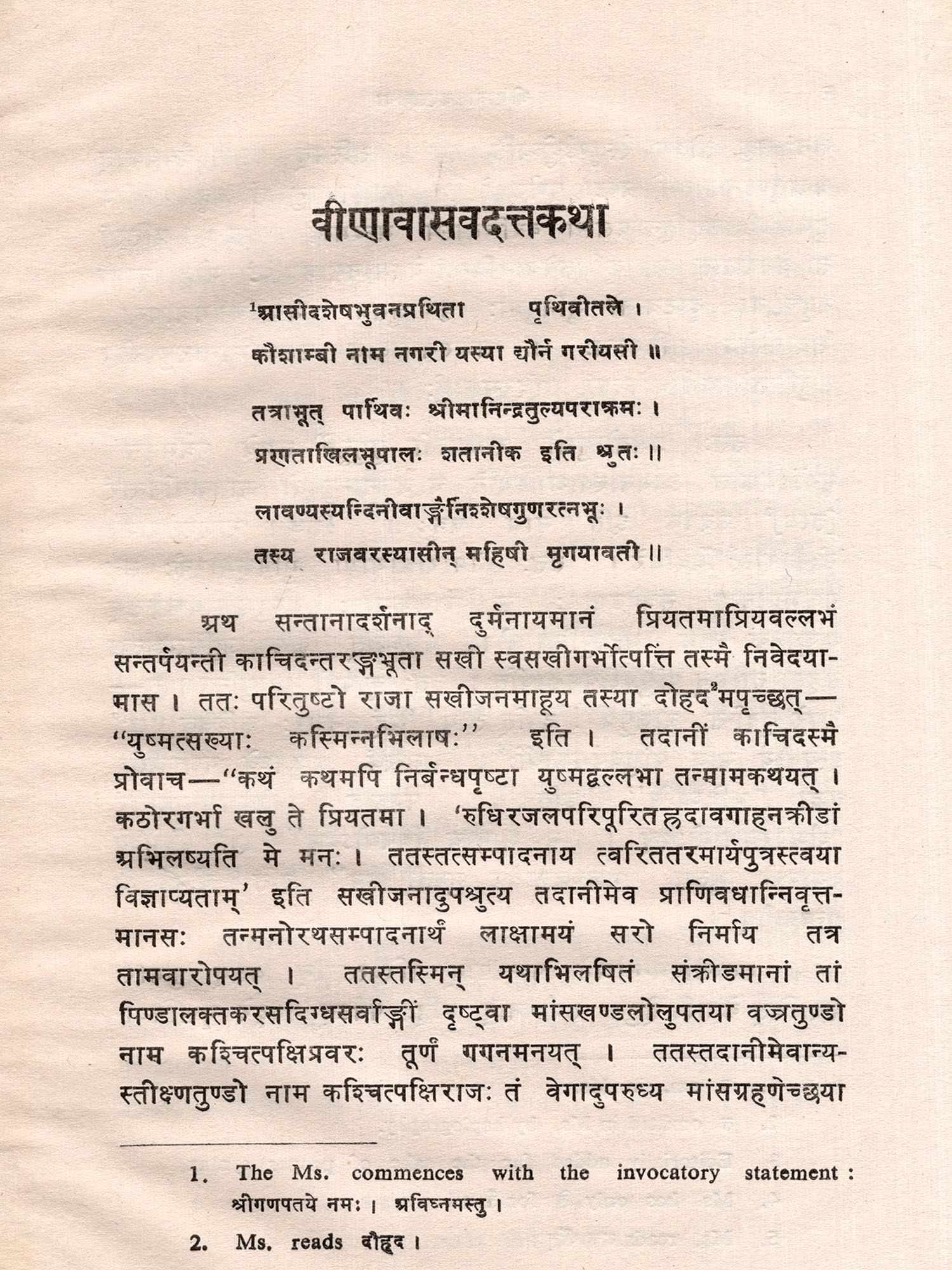 The Vinavasavadatta (Vina.) has, at least, two resumes, one in prose, being the Vinavasavadatta-katha, being edited here, and the other in verse, the Vatsarajacarita (-prabandha) available in the form of independent manuscripts¹¹ or included in collections of similar resumes entitled Slokavali. The latter resume is couched in different metres and begins with the verse: