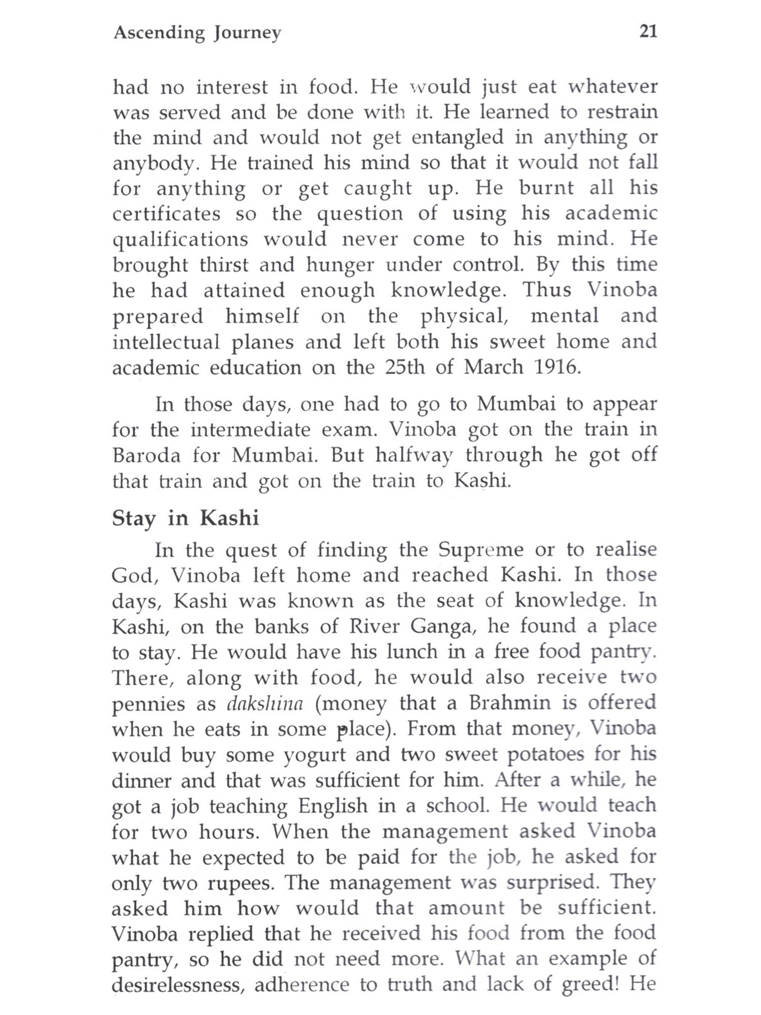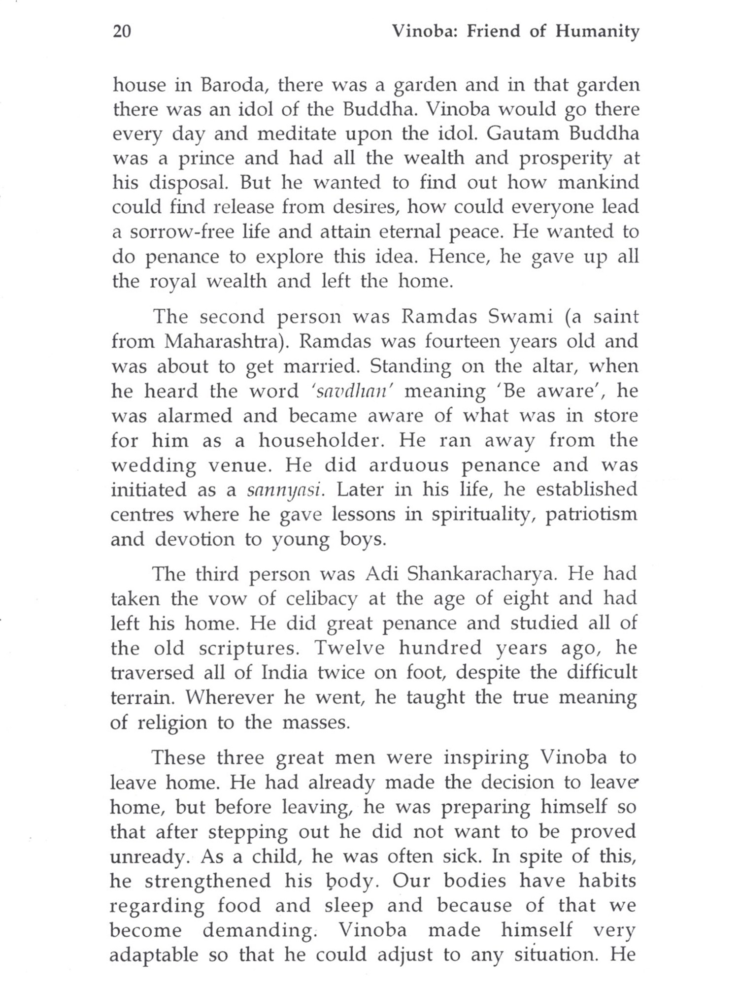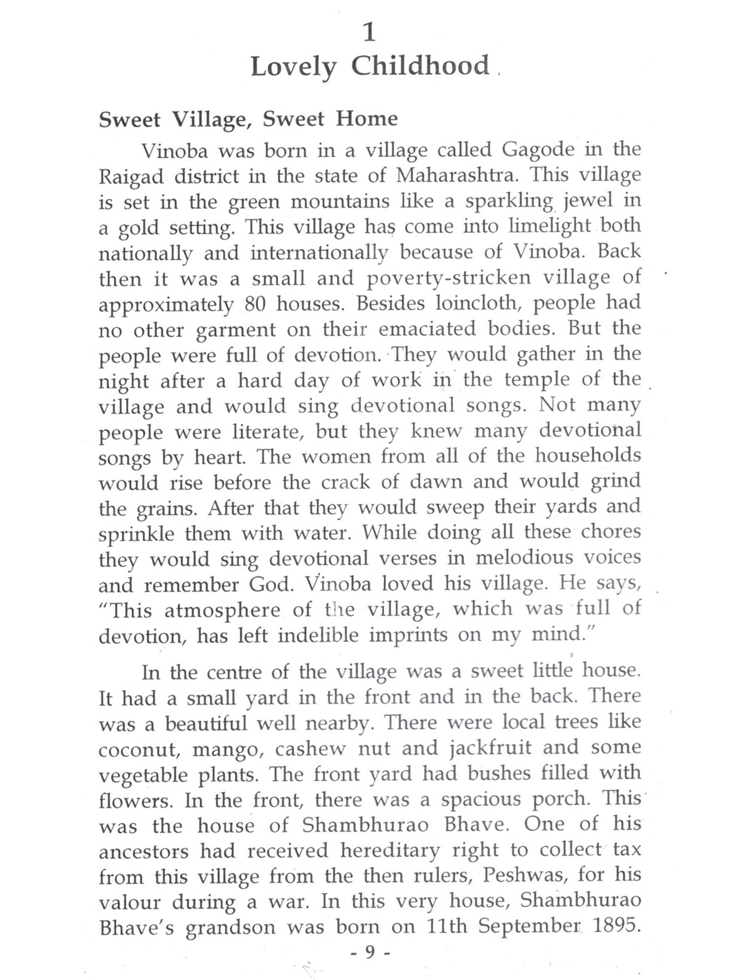 Vinoba was known as 'the man of the land-gift movement amongst the masses. Often, during Vinoba's walk, as he approached a village, young children would come running towards him and start to walk with him. Vinoba would hold their hands and then start running with the children. There would be a boy on each side of Vinoba holding his hand and the other boys would hold those boys' hands. This would create a row of runners. Eventually, all the people walking with Vinoba would start running. It would look like a marathon. Upon arrival into the village, a welcoming meeting would begin, and the children would sit by Vinoba's feet in a group. Sometimes Vinoba would start chatting with the children. There was a time when the children played a major role. This is what happened: Vinoba: "Do you know why we have come to your village?" Children: "Yes, yes we know. You have come to ask for land." Vinoba: "What will we do with the land?" Children: (in chorus) "Distribute it amongst the poor. Give the land to those people who don't have it." Vinoba: "So, now go home and tell your parents that Vinoba is asking for land for the poor and that you must give land to him. But remember one thing, your parents will say, "Son, we are keeping the land for you, how can we donate that?" Then tell your parents, "Do not worry for us, we will do some other work and earn a living." All the children ran to their homes and in the sight. Some of the children had dragged their fathers with them and all those fathers were donating land to evening meeting, all the villagers saw an extraordinary fulfil their 'children's wish' . In the meeting. Vinoba said, "This is not an ordinary thing. God's will is expressed through the words of the children." There was a similar incident in Bettiah in the state of Bihar. Vinoba had to stay there for a month in the government rest house. People from various fields would visit him throughout the day. A twelve-year-old boy came there every day and sat quietly in a corner. Vinoba, who used to roam in the yard every evening, would see the boy. Once, at the beginning of his walk, Vinoba stopped next to the boy and asked him to stand up. The boy stood up and Vinoba held his hand and continued his walk. Vinoba asked him what his name was and he answered "Mohammed". Vinoba said, "Do you know who Mohammed was?" The boy felt embarrassed and kept quiet. Then Vinoba enquired as to where he lived. The house was close by. Vinoba said, "Let's go to your house". The boy was not too enthusiastic with the idea, but Vinoba had already started walking in that direction. His house was a very humble hut, which was covered with a cloth curtain. The door was closed. Upon arrival the boy loudly said, "Mother, open the door; Vinoba has come." The mother, speaking from inside, said that since the boy's father was not at home she could not open the door. Vinoba turned back. Seeing this, the boy started to cry uncontrollably. Everyone around tried to console him, saying that Vinoba would come back when his father came home. The next day at noon Mohammed brought his father, his burqa-clad mother and baby sister to Vinoba. His father told Vinoba that Mohammed had kept crying the whole time and had even refused to have his meal. Even this morning he would not eat anything. "So then I told him, let all of us go to meet Vinoba Mohammed's face was gleaming with happiness. It was very natural for Vinoba to be friends with children. Today's children can also become friends of Vinoba. But in order to create friendship, we must be introduced and that can be easily done. 11 September 1895 is Vinoba's birthday. This year is his 125th birth anniversary year. The whole year is being celebrated all over India. People from all the provinces of India feel a close affinity towards Vinoba because he traversed on foot the whole of India from Kanyakumari (the southernmost tip of India) to Kashmir (the northernmost part of India) and from Dwarka (on the west coast of India) to Assam (the easternmost region in India). He visited many villages in all the provinces. Not only did he learn the local languages of all the regions but also studied the classical literature of those languages in depth. He knew many verses of the saints from various regions by heart. Everyone felt a close connection with him as he beautifully explained the meanings of those verses. His heart was full of love for all the people of the entire world. His love knew no discrimination of any kind such as religion, caste, language, gender, social status etc. Though he was born in a learned upper caste Brahmin family, his heart knew no discrimination. He did all types of manual labour. He would spend hours digging in the field. There was no device to draw the water or a water pump, so with his colleagues he drew water from the well with a Persian wheel and watered the fields.