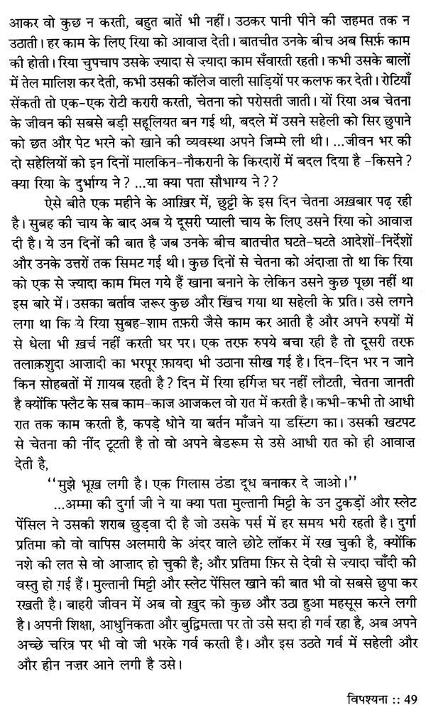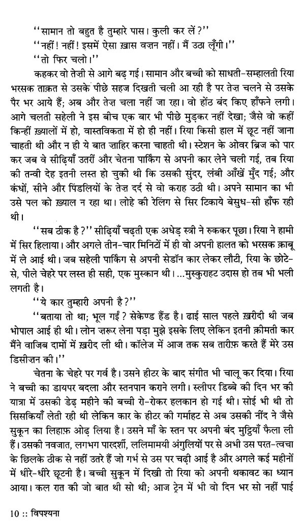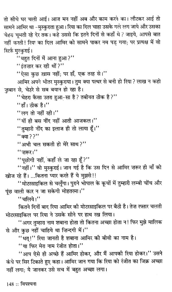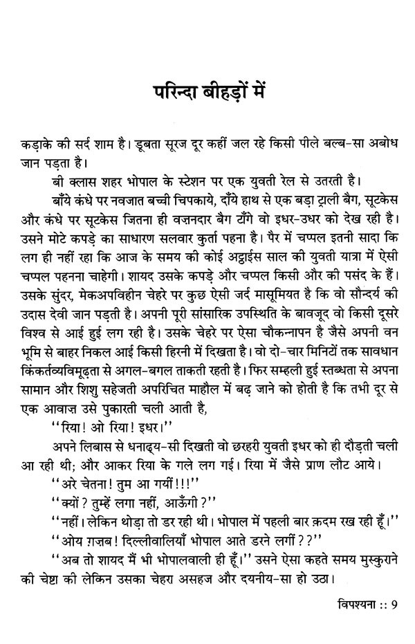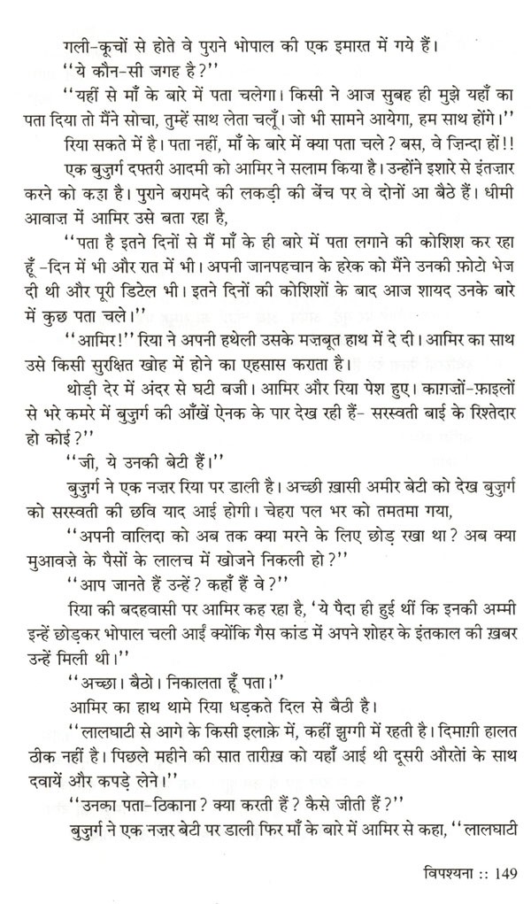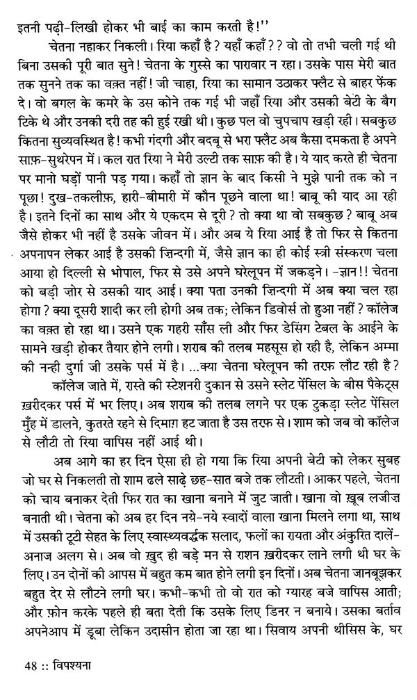 कौन हूँ? क्यों हूँ? मुझे क्या चाहिए ? जीवन में सुख की परिभाषा क्या है ? विपश्यना अपने भीतर के प्रकाश में बाहर के विश्व को देखना है- ये विशेष प्रकार से देखना, ये जीना, ये सत्य के अभ्यास; यही उपन्यास की तलाश है, यही तलाश लेखिका की भी! उपन्यास में दो नायिकाएं हैं- दोनों ही अपने को नये सिरे से खोजने निकली हैं। एक को अपने को पाना है तो दूसरी को भी आख़िर अपने तक ही पहुँचना है, भले ही रास्ता माँ को खोजने का हो। पूरा उपन्यास, माँ के लिए तरसता एक मन है; क्या कीजिये कि जहाँ सबसे ज्यादा कुछ निजी था, कुछ बहुत गोपनीय, वहीं से उपन्यास आरंभ हुआ। लिखते समय, लेखिका पात्रों के साथ इस कथा यात्रा में सहयात्री बनती है, मार्गदर्शक नहीं। इस उपन्यास में भोपाल गैस त्रासदी जितना कुछ है; उतनी विराट मानवीय त्रासदी को महसूस करना, अपने मनुष्य होने को फिर से महसूस करने के जैसा है। जो जीवन बोध था, जो दुःख था, जो प्रश्न थे-अब 'विपश्यना' आपके हाथों में है।