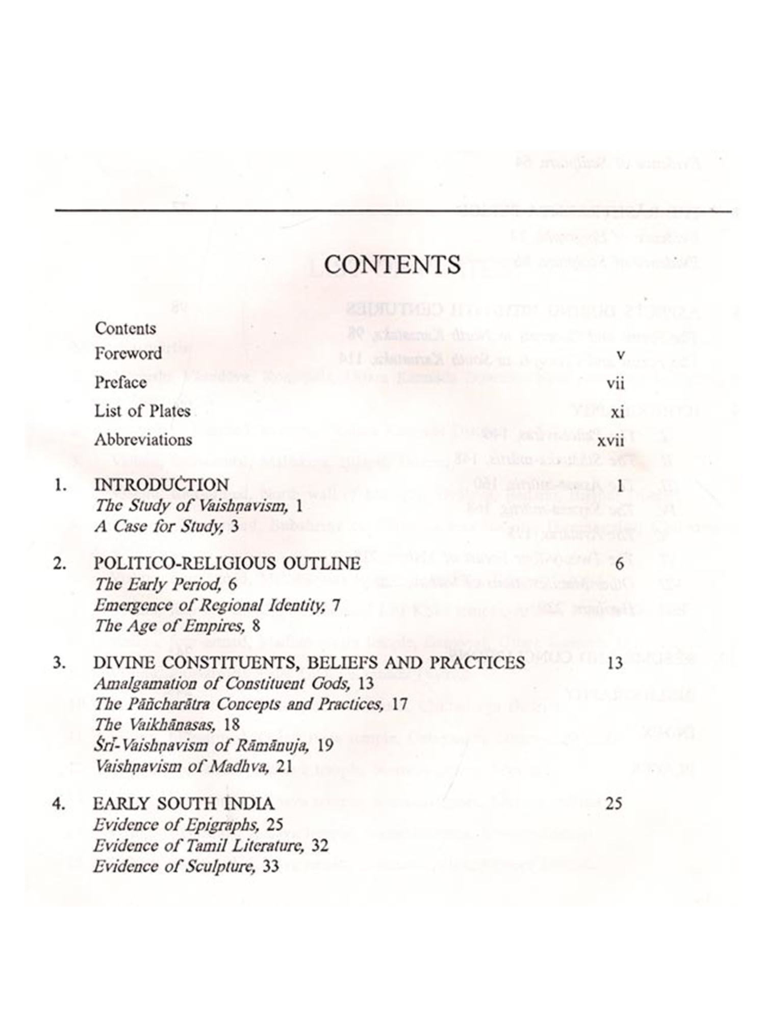 In this work, Dr. S.V. Padigar has subjected the sumptuous epigraphical and sculptural wealth of Karnataka to an in-depth analytical investigation for reconstructing the nature and form of Vaishnavism in several distinct phases. He first makes a critical survey of the studies relating to Vaishnavism, and provides a brief account of historical, theological and philosophical aspects of Vaishnava subsects as a background. Then he proceeds to inquire into the archaeological and, to same extent, literary data with an emphasis on identifying the factors that have contributed to theological changes in the beliefs of Vishņu-Văsudēva worshippers in the region of Karnataka. He has also dealt with the iconographic aspects of Vaishnava sculptural themes, with appropriate illustrations, to show the evolution towards standard iconic forms. His conclusions, which are summarised in the last chapter, are indeed interesting and revealing. After going through this book, it will not be surprising if one feels the need for similar studies in respect of the other religious systems in Karnataka.