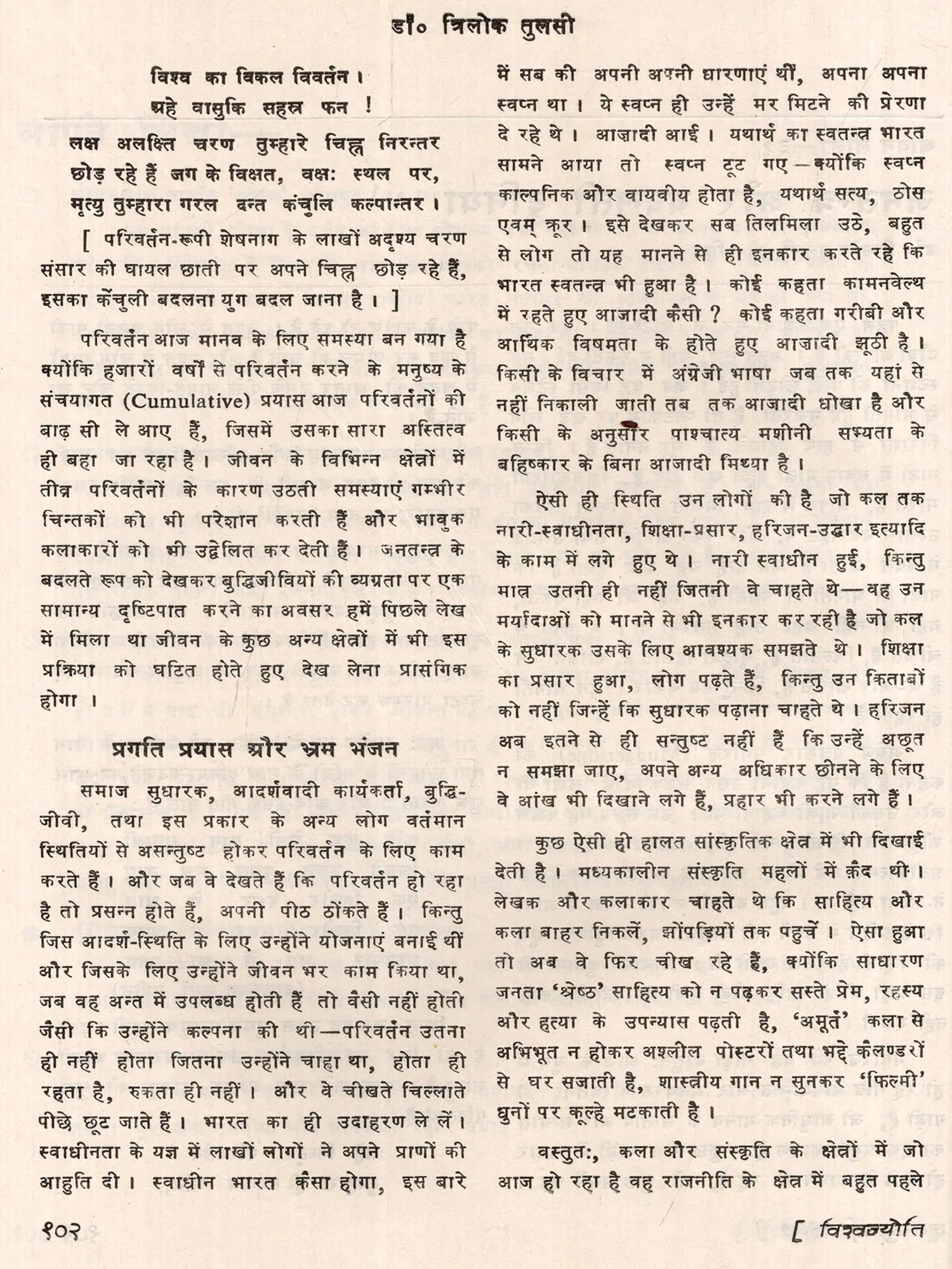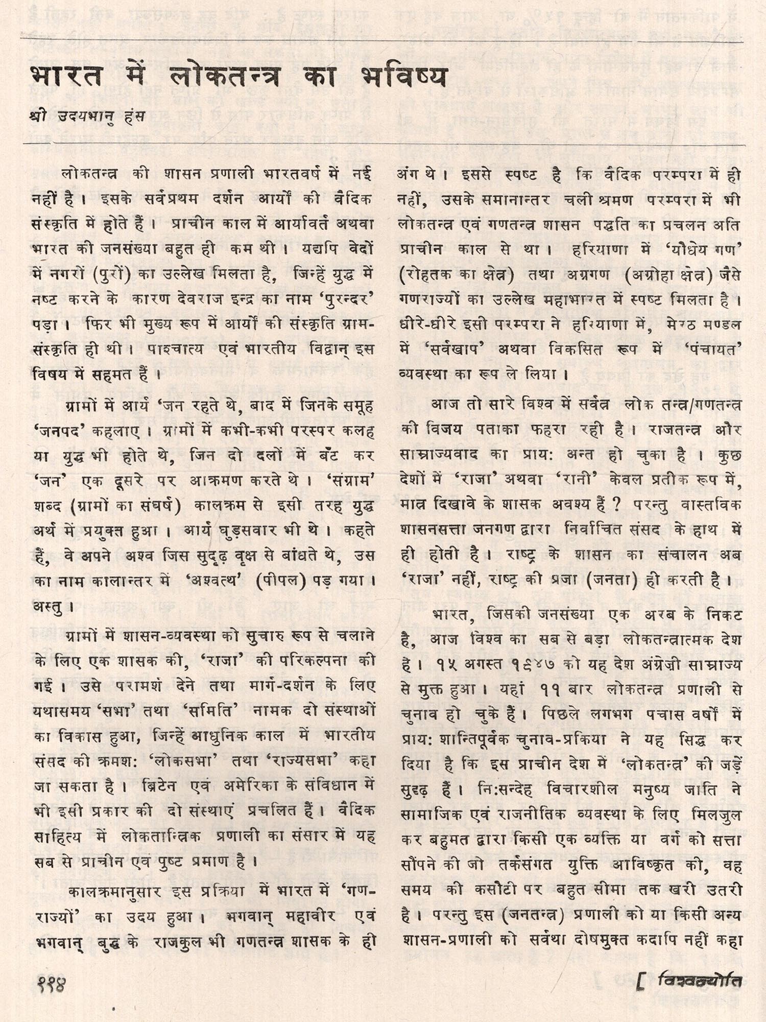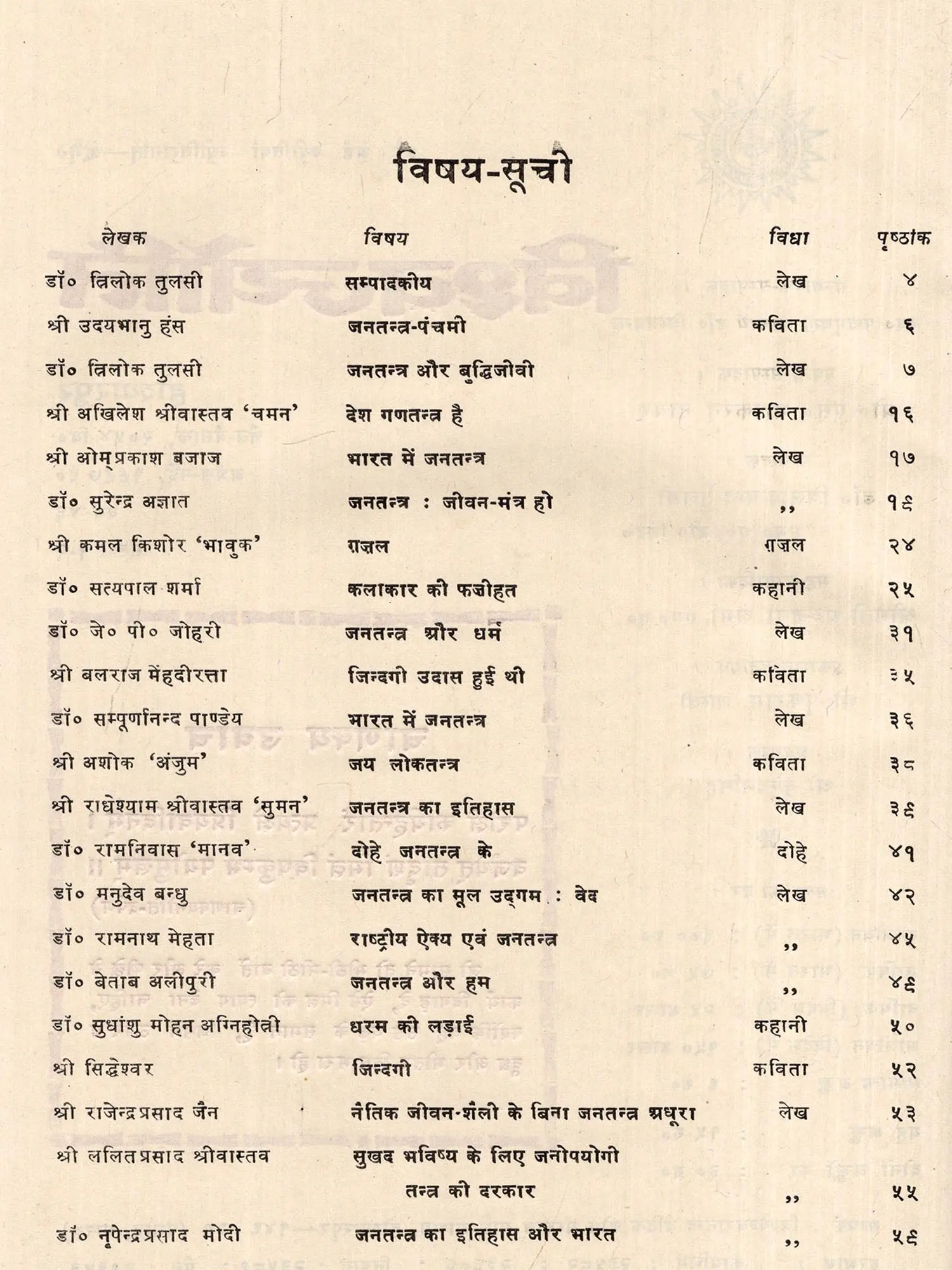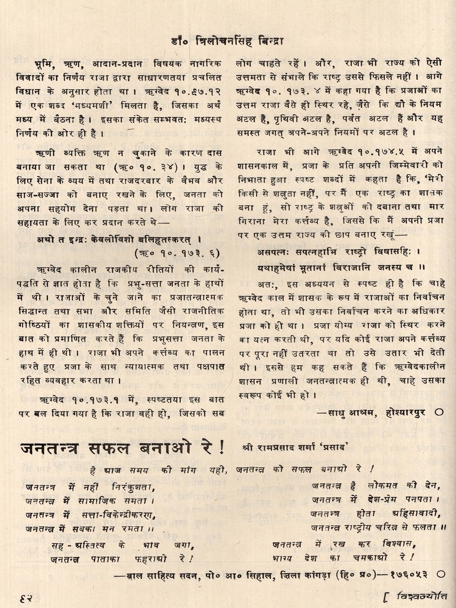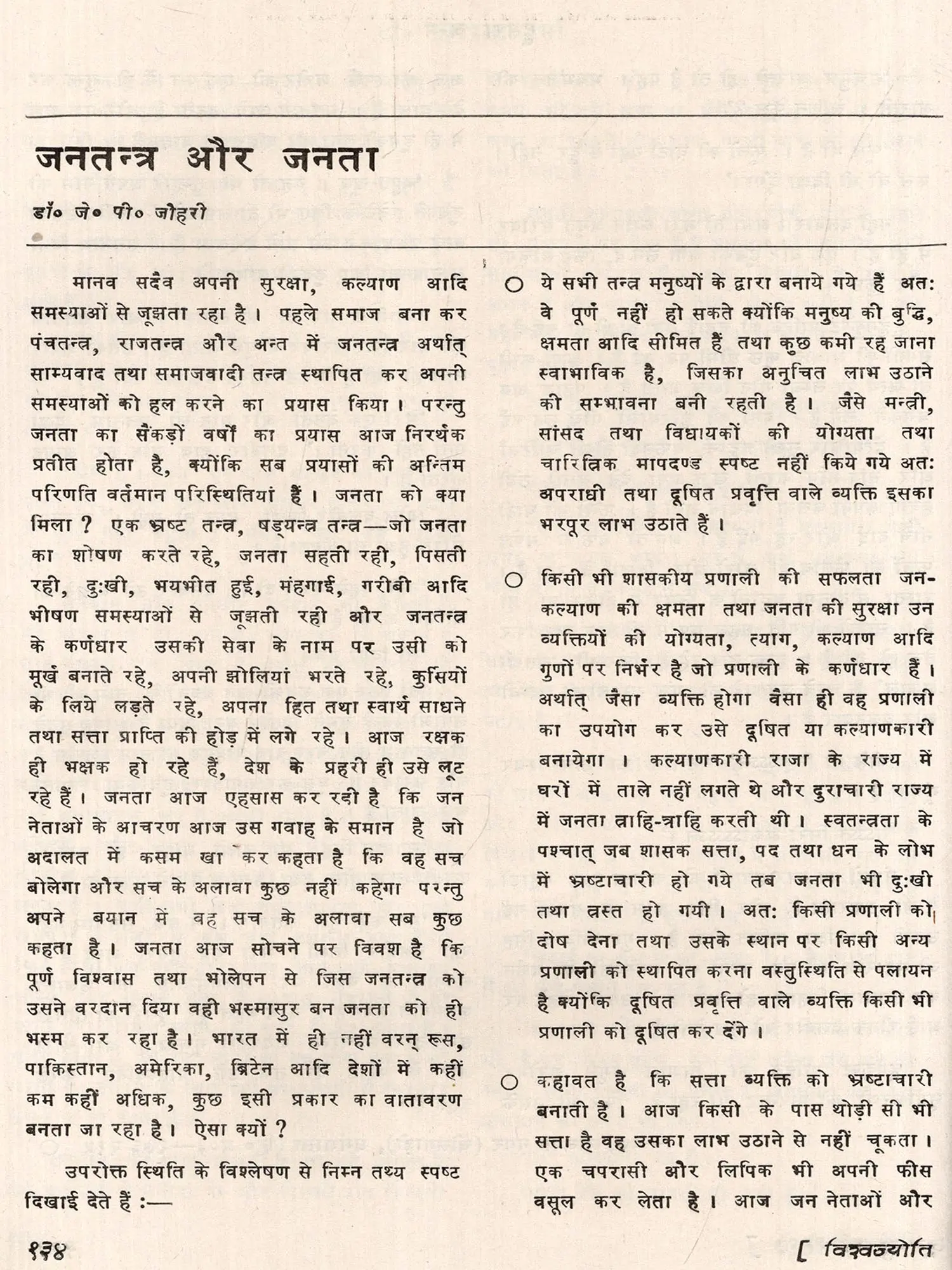 - इस अंक के साथ आपको यह रही है। बऔर प्रत्येक वर्ष की भान्ति विश्वज्योति अपनी द्यायु के ४६वें वर्ष में प्रवेश कर इस बार भी इसके नव वर्ष का प्रारम्भ दो विशेषांकों के साथ हो रहा है। इस बार इन का विषय 'जनतन्व' चुना गया है।