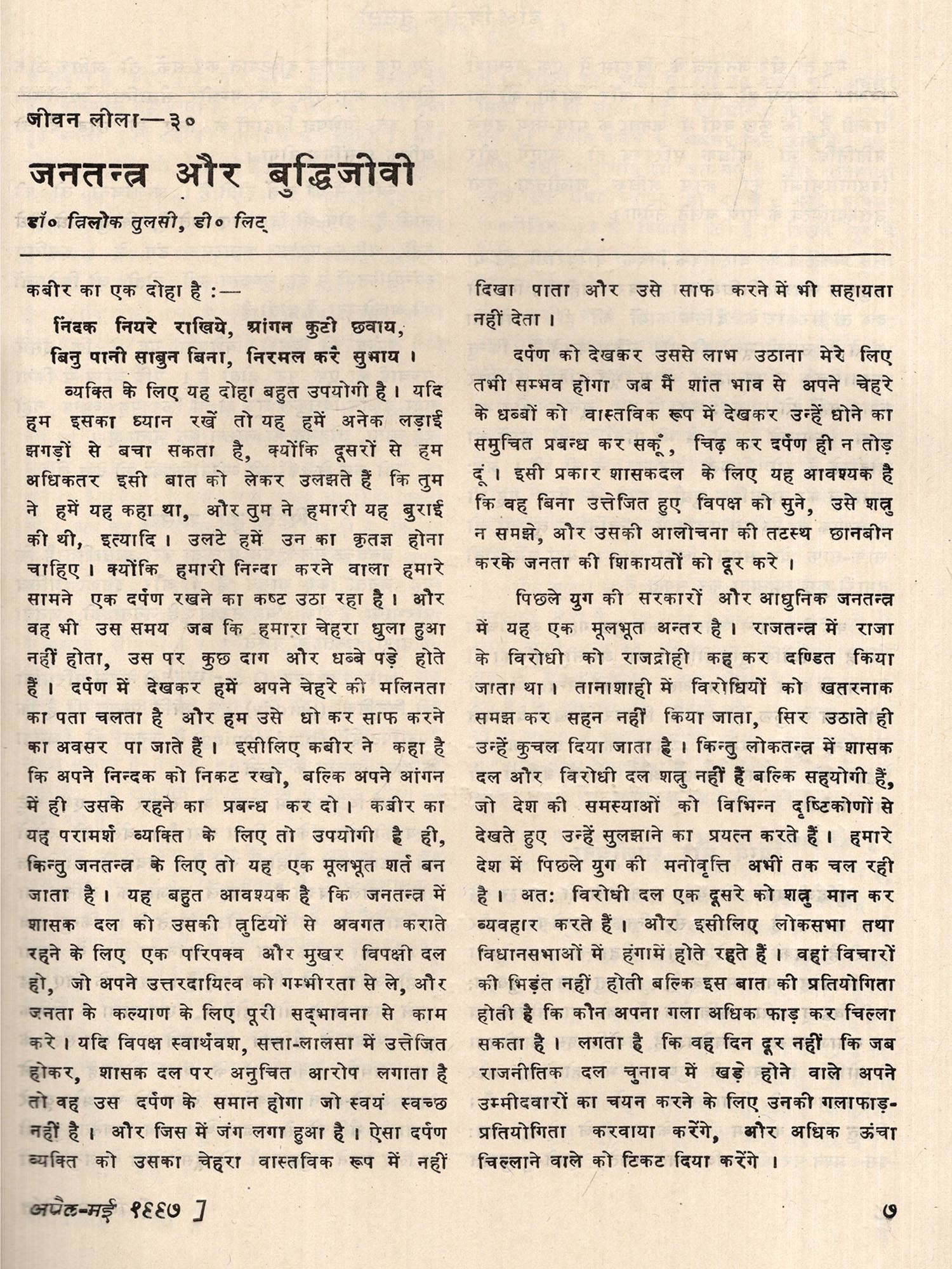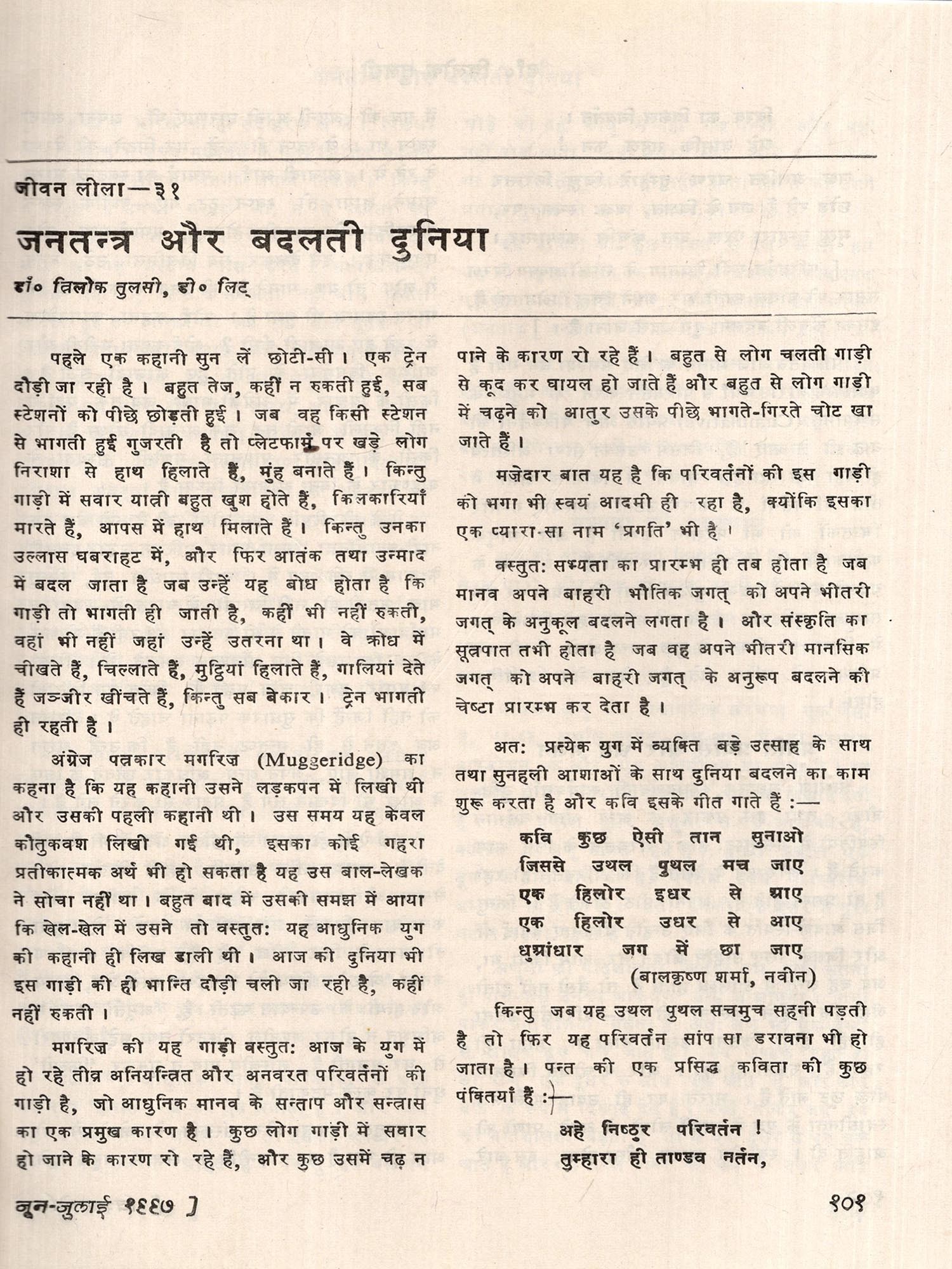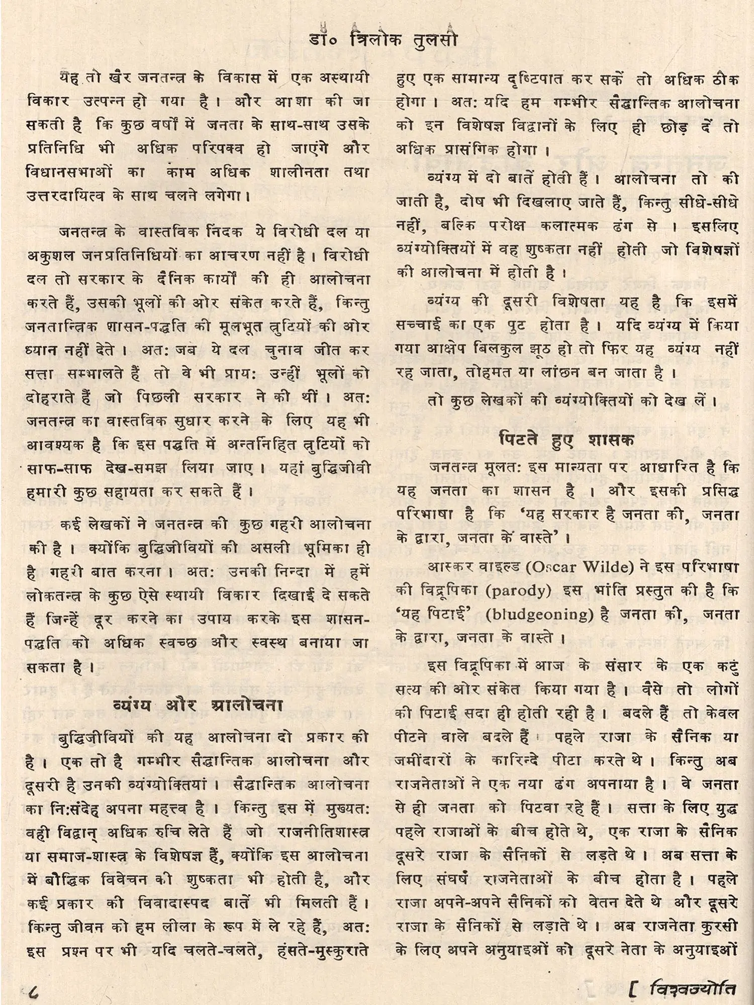 जनतन्व की प्रसिद्ध परिभाषा है कि 'यह सरकार है लोगों की, लोगों के द्वारा, नोगों के वास्ते। किन्तु पिछले ५० वर्षों में जनतन्त्र का यहां जो विकास हुआ है और इस समय इसका जो रूप दिखाई दे रहा है उसे देखकर तो लोग इस परिभाषा पर केवल व्यंग्य से हंस ही सकते हैं। वे इसे कुछ यूं बदल देना चाहेंगे, "जनतन्त्र सरकार है राज-नेतालों को, अफसरशाही के द्वारा, नेताओं, अफसरों तथा उनके सगे सम्बन्धियों के वास्ते ।