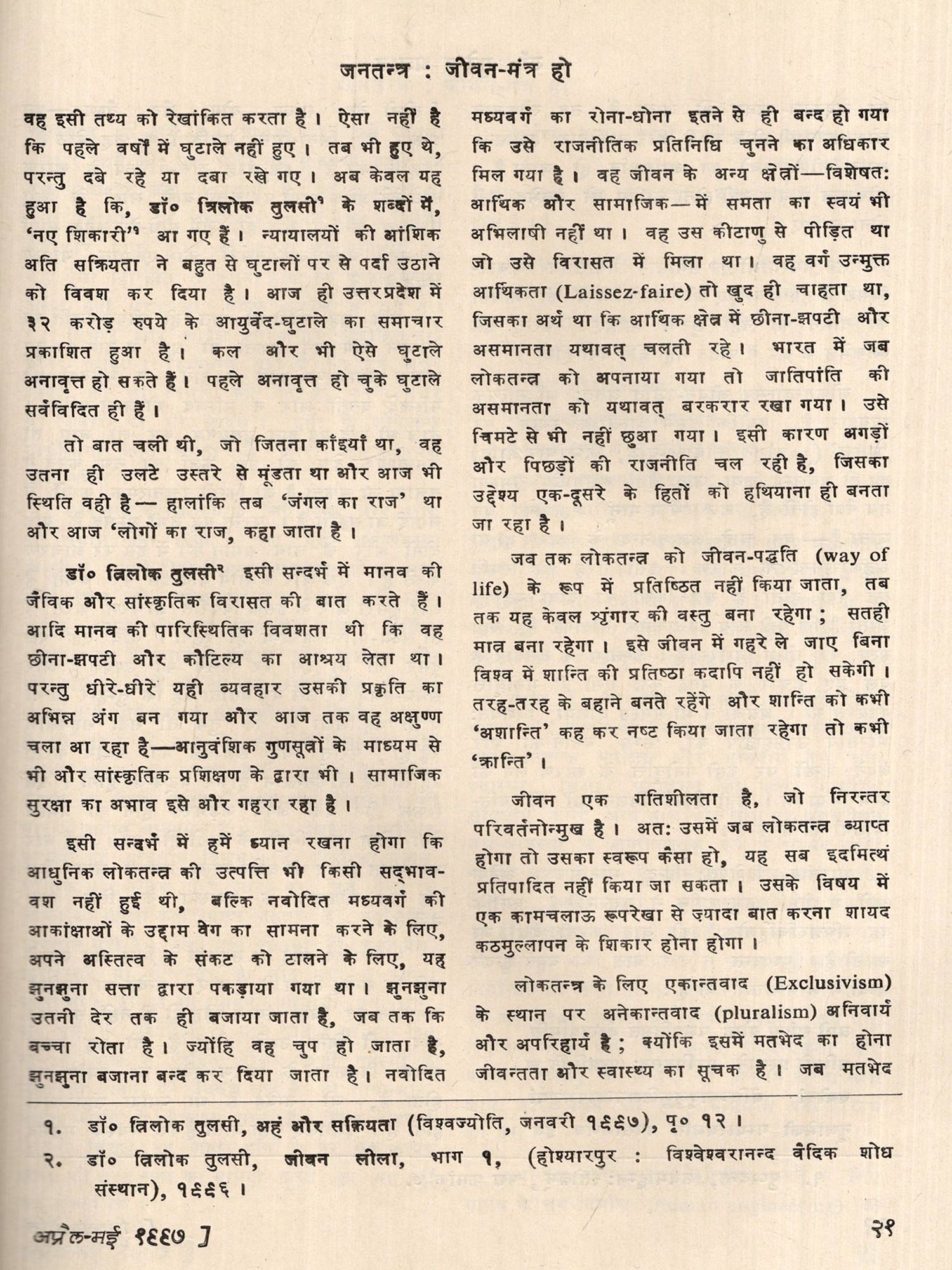 कुछ ऐसे ही प्रश्न थे जिन्होंने हमें स्वाधीनता के इस स्वर्ण जयन्ति वर्ष में विश्व-ज्योति के ये विशेषांक जनतन्त्र को समर्पित करने की प्रेरणा दी। विद्वान् लेखकों ने जनतन्त्र के कई पक्षों पर प्रकाश डालने की चेष्टा की है। आजा है हमारे सुधी पाठकों को ये विशेषांक कुछ नए सुझाव देंगे और विश्व तथा राष्ट्र की समस्याओं पर एक नए ढंग से देखने और सोचने की प्रेरणा देंगे ।