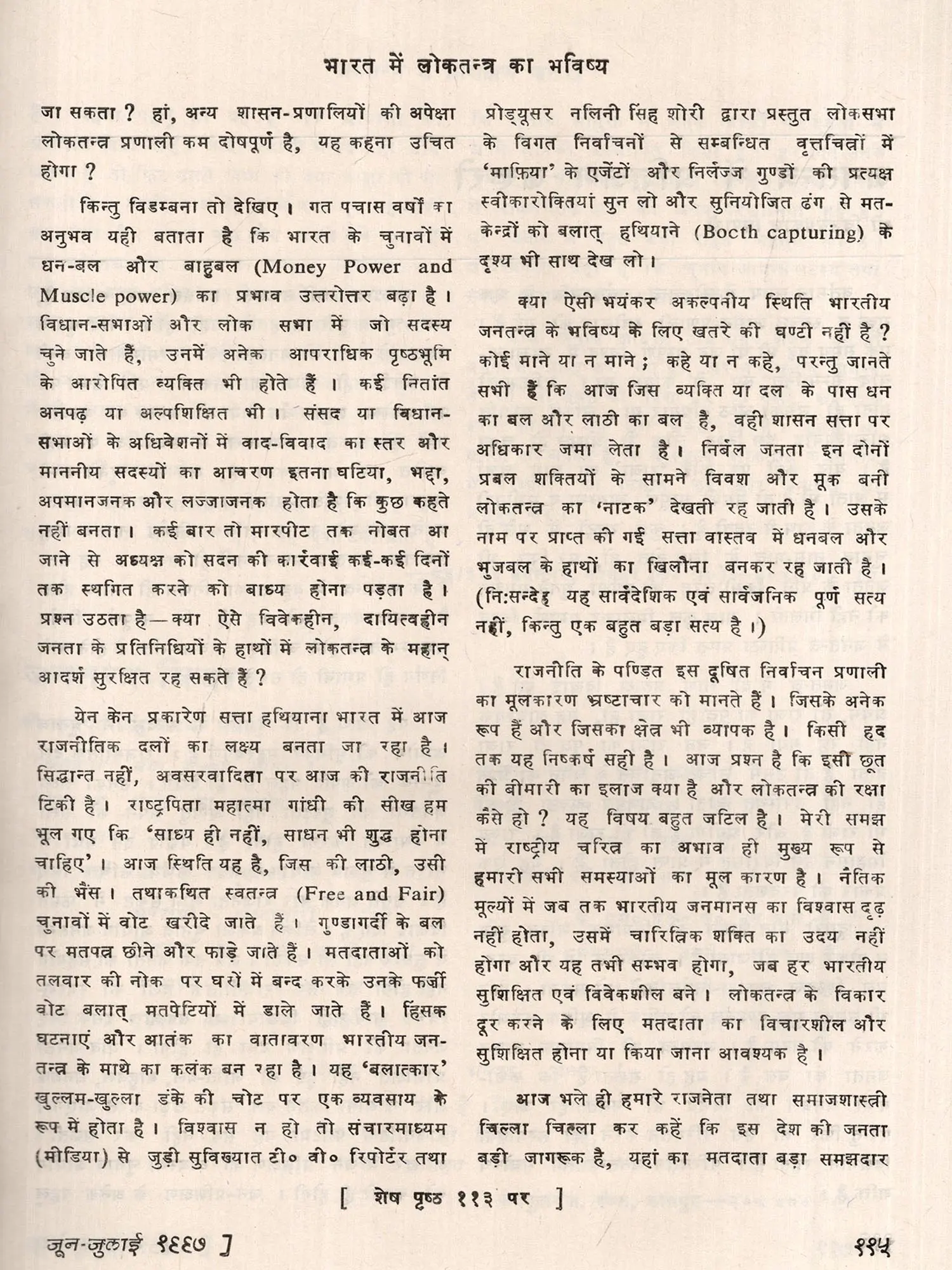 यह ठीक है कि इन वर्षों में देश ने कई क्षेत्रों में बहुत प्रगति की है। किन्तु शासनव्यवस्था का जो रूप आज दिखाई दे रहा है, घोटालों में फंसे राजनेता जिस प्रकार नगे हो रहे हैं, लोकसभा और विधानसभाओं में जनता के चुने हुए प्रतिनिधि जिस प्रकार हंगामा कर रहे हैं, राजनीति का जिस प्रकार अपराधीकरण हो गया है, वह सब देख कर पूछने को जी चाहता है कि क्या यही जनतान्त्रिक शासन पद्धति है? क्या पिछली पीढ़ियों के स्वतन्त्रता-संग्रामियों ने इसी भारत के लिए संघर्ष किया था ?