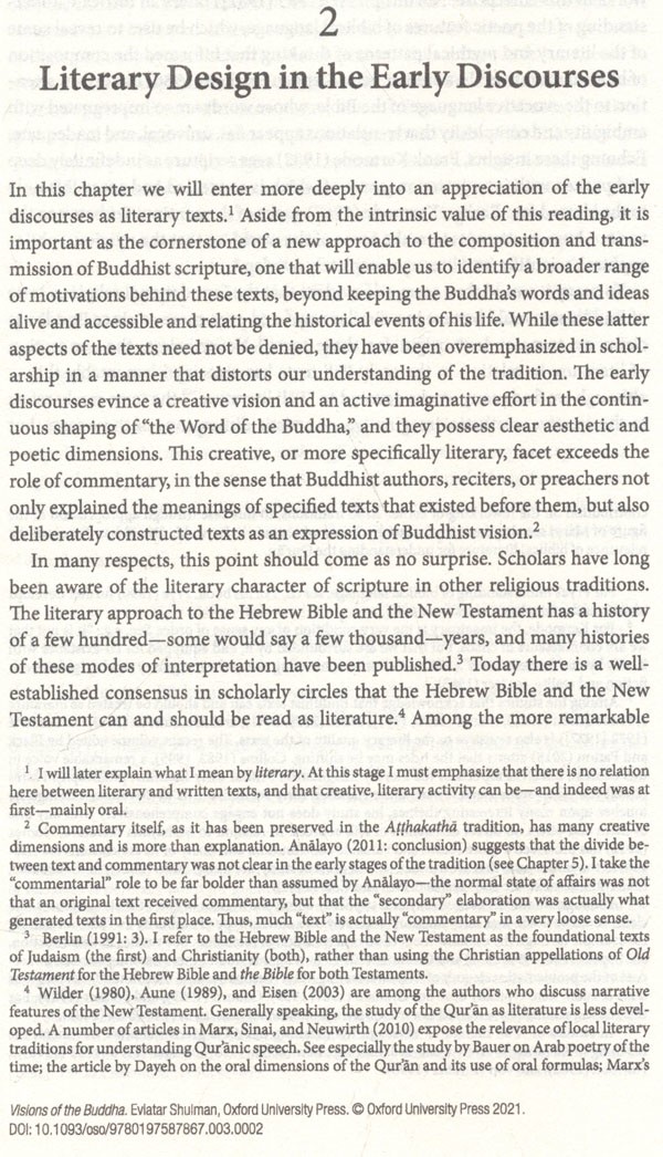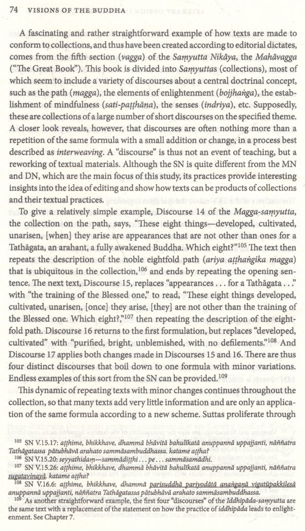 The main idea raised in this book is quite simple that the early discourses attributed by tradition to the historical Buddha, the texts that purport to reveal his words, ideas, and instructions, are no less a creative act of the Buddhist textual tradition and imagination than an attempt to preserve his words or to relate the historical events of his life. This understanding of the texts is quite different from the one that is common both in popular perception and in scholarly under- standing, in the Buddhist world and in the modern West alike. Even if some of us have learned to be suspicious of our intellectual tendency to take scripture as an immediate and self-evident source of authority, scripture has a special power, and it speaks authority effortlessly; there still, we may admit, lurks in our minds an underlying security-that the texts offer an epistemological foundation, that somewhere in their midst can be found the truth, so that if we clear away the right kinds of debris, we will know what underlies the later accumulation of fantasy.