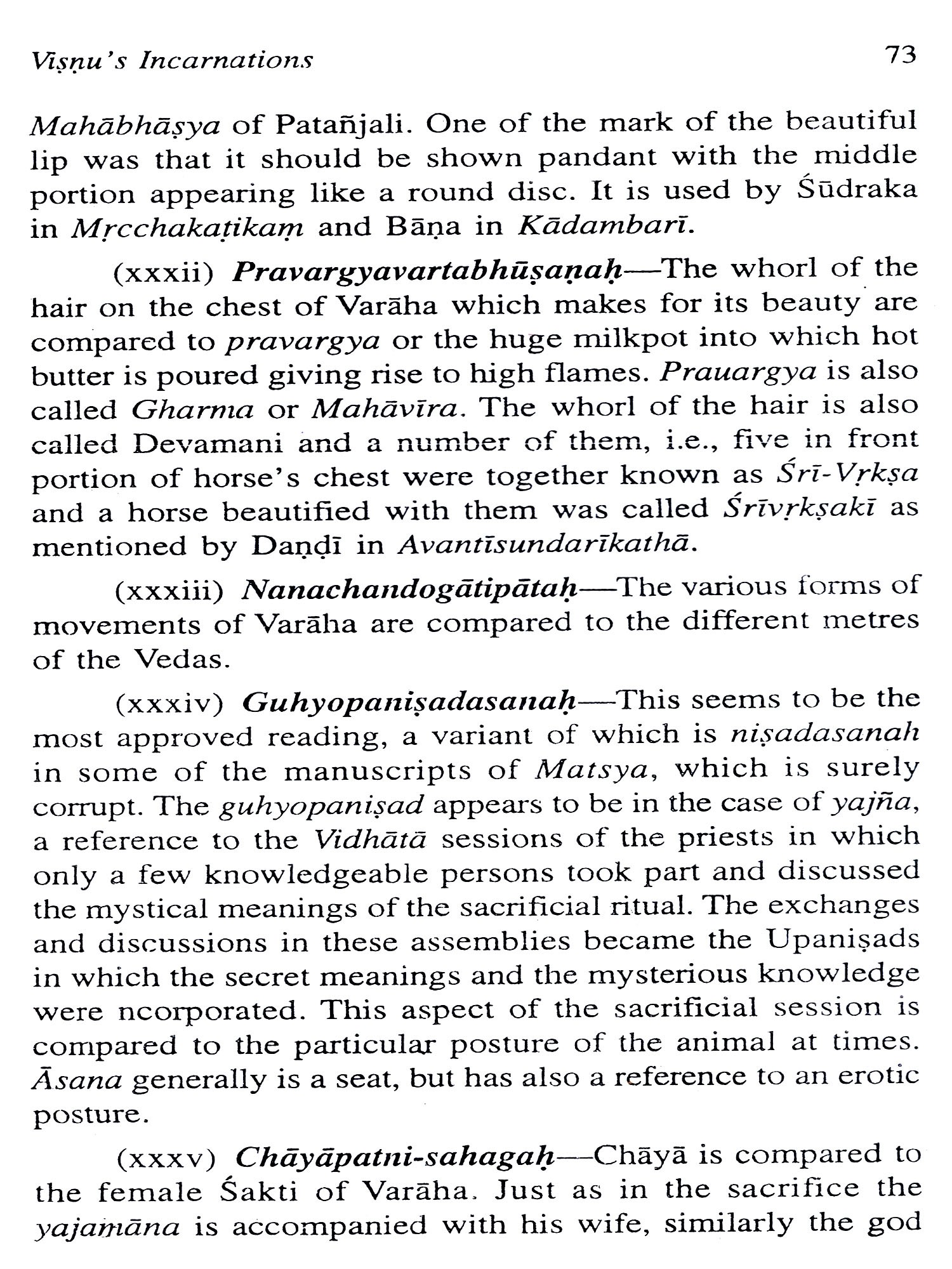 Visnu is one of the three important gods of Indian religious belief, others being Brahma and Siva. His presence is found in the Rgveda where he is conceived to be all pervading lord. But with the theory of his incarnations, his importance increased. The Puranas, more particularly the visnu and others, highlight his glory to a considerable extent. Some of the events like Samundramanthana (Churning of ocean), event of Gajendramoksa etc. are quite popular. One can find his temples throughout the country.