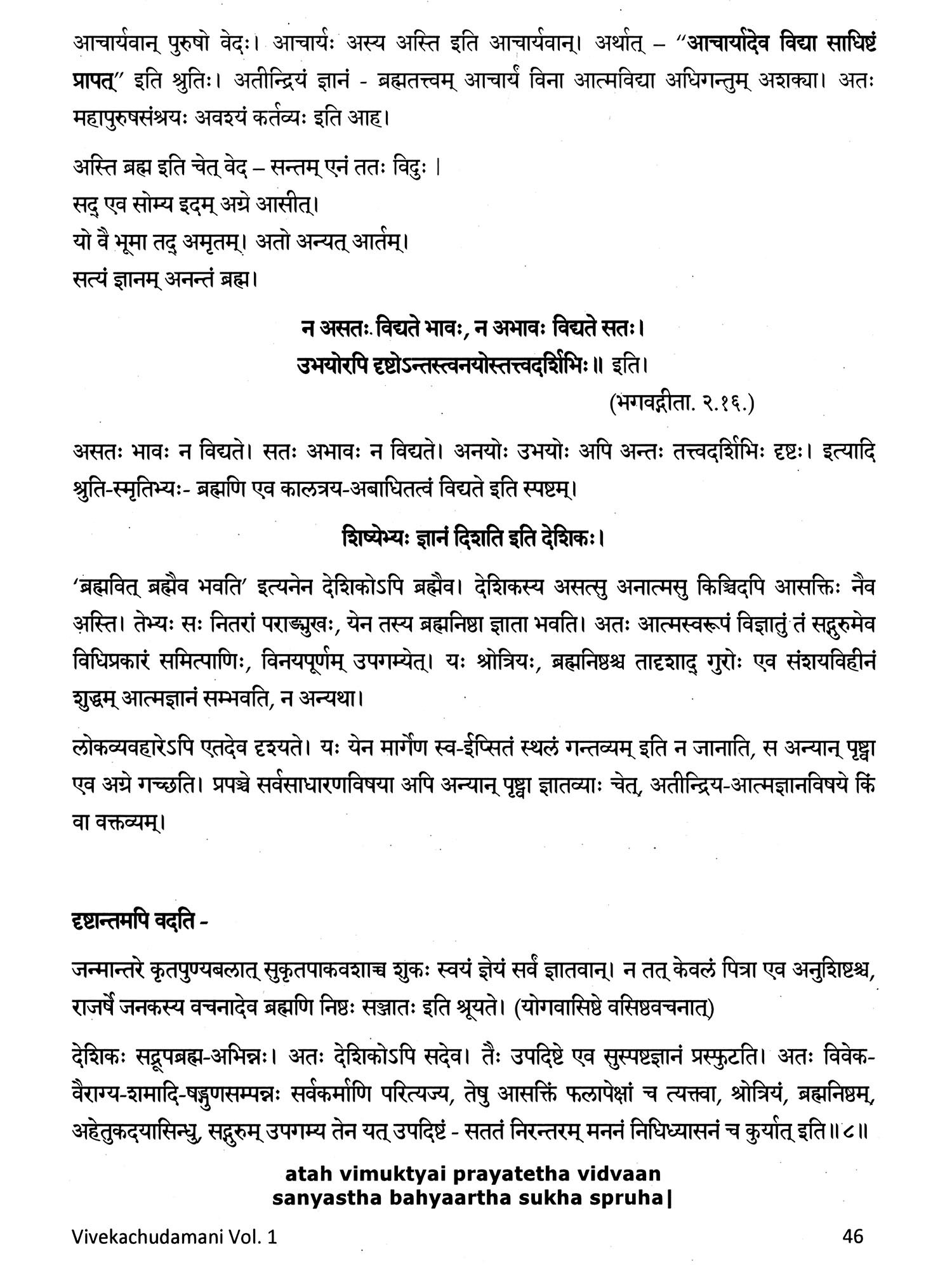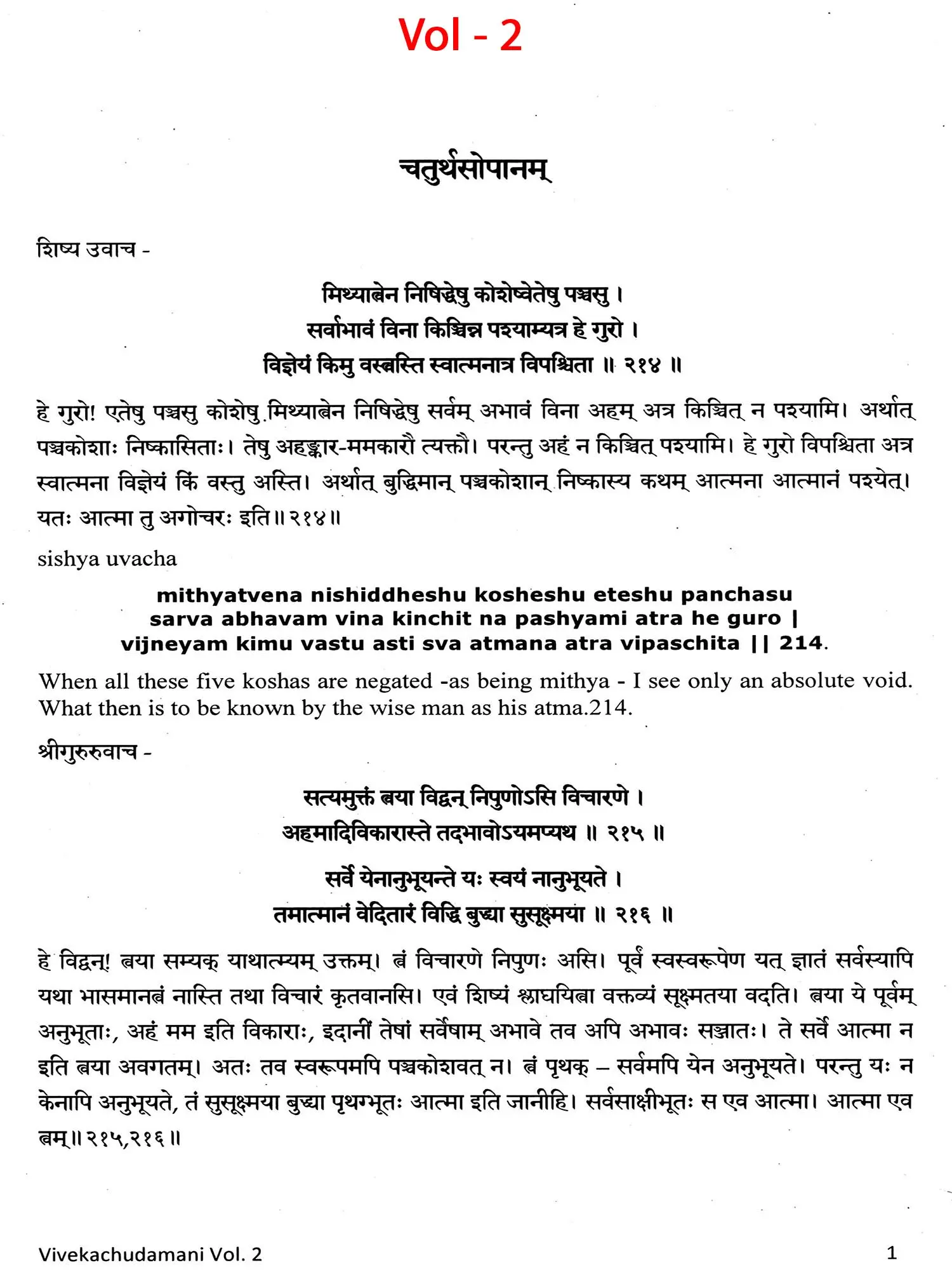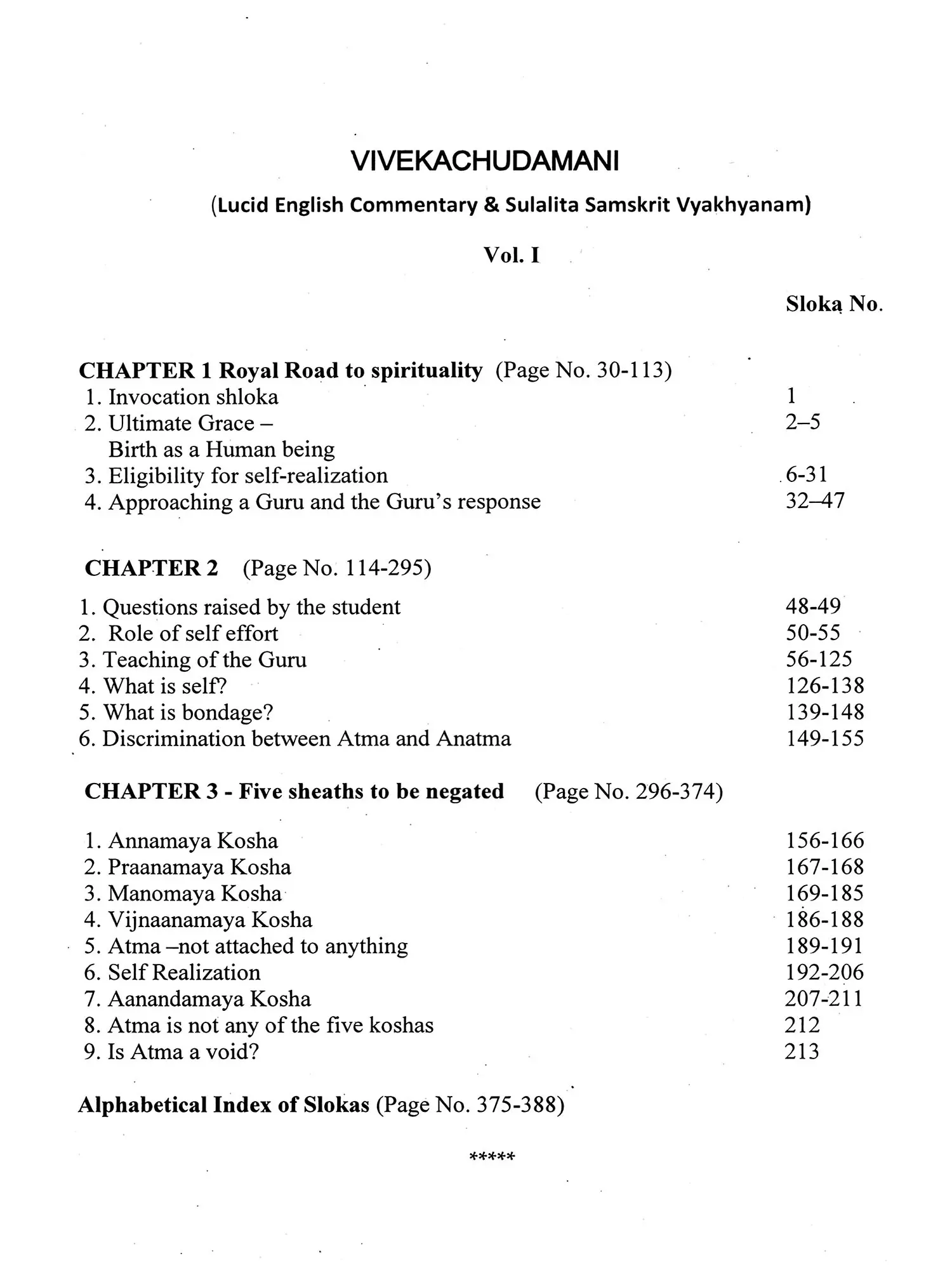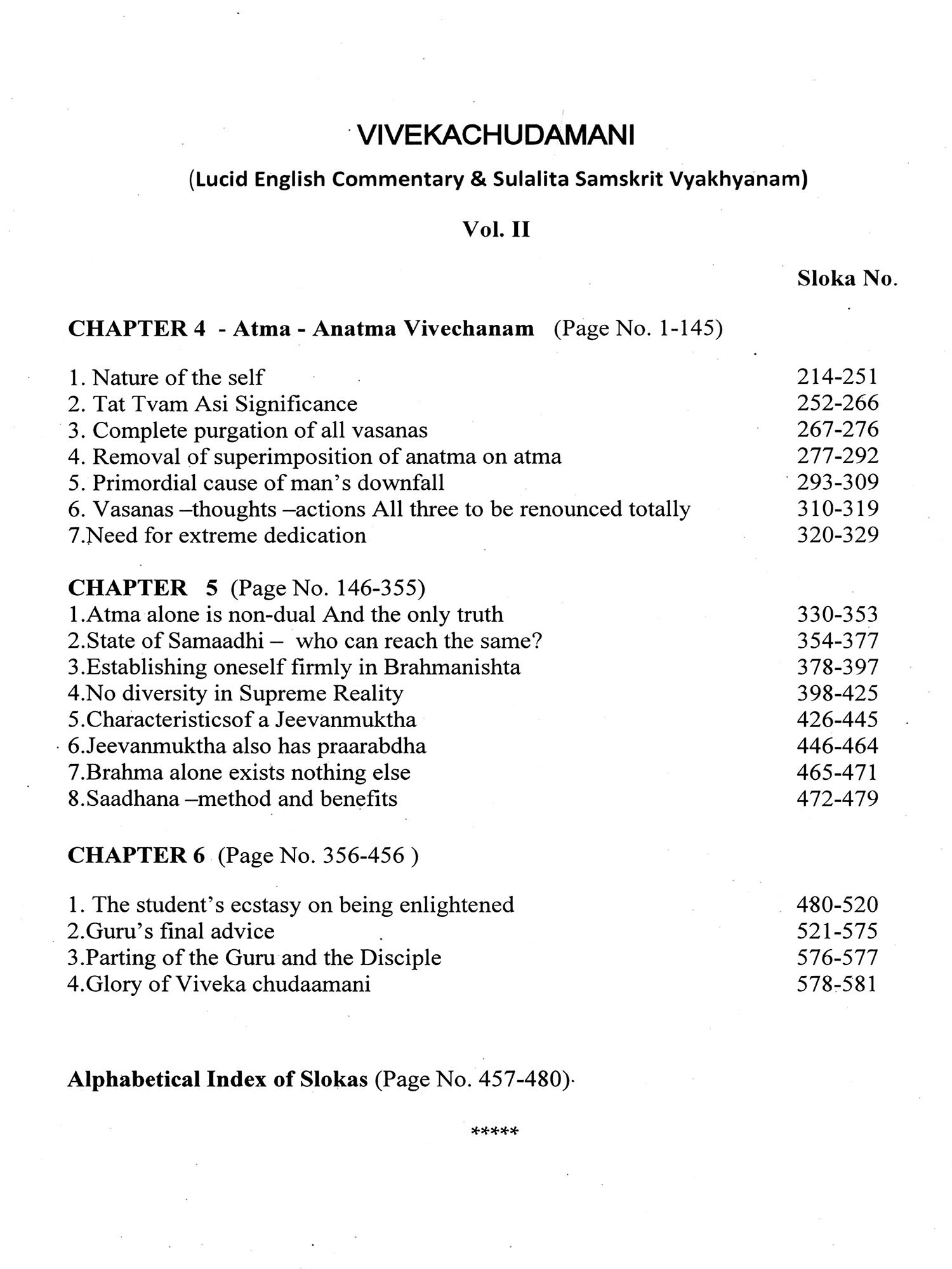 Viveka Chudamani consists of 580 verses in Sanskrit, but unlike other scriptures, it is not divided into chapters and sections. It has the form of dialogue between the master and the disciple, where the master explains to the disciple the nature of the Atman and the ways to research and know the Atman. The book takes the disciple on a step by step instructions to reach Brahman. It is not divided into chapters or sections. It is in the form of a dialogue between an ardent seeker and his Guru.