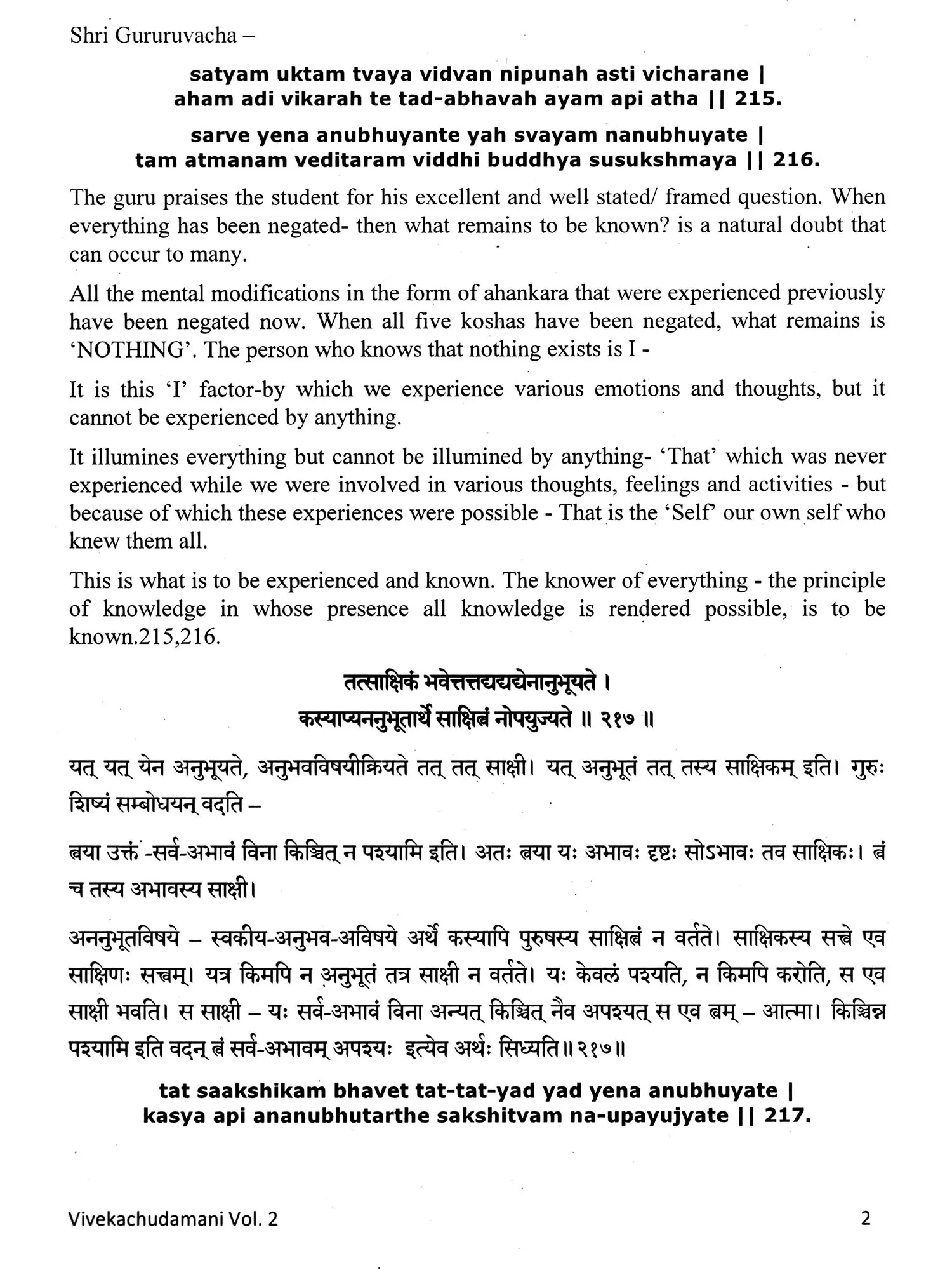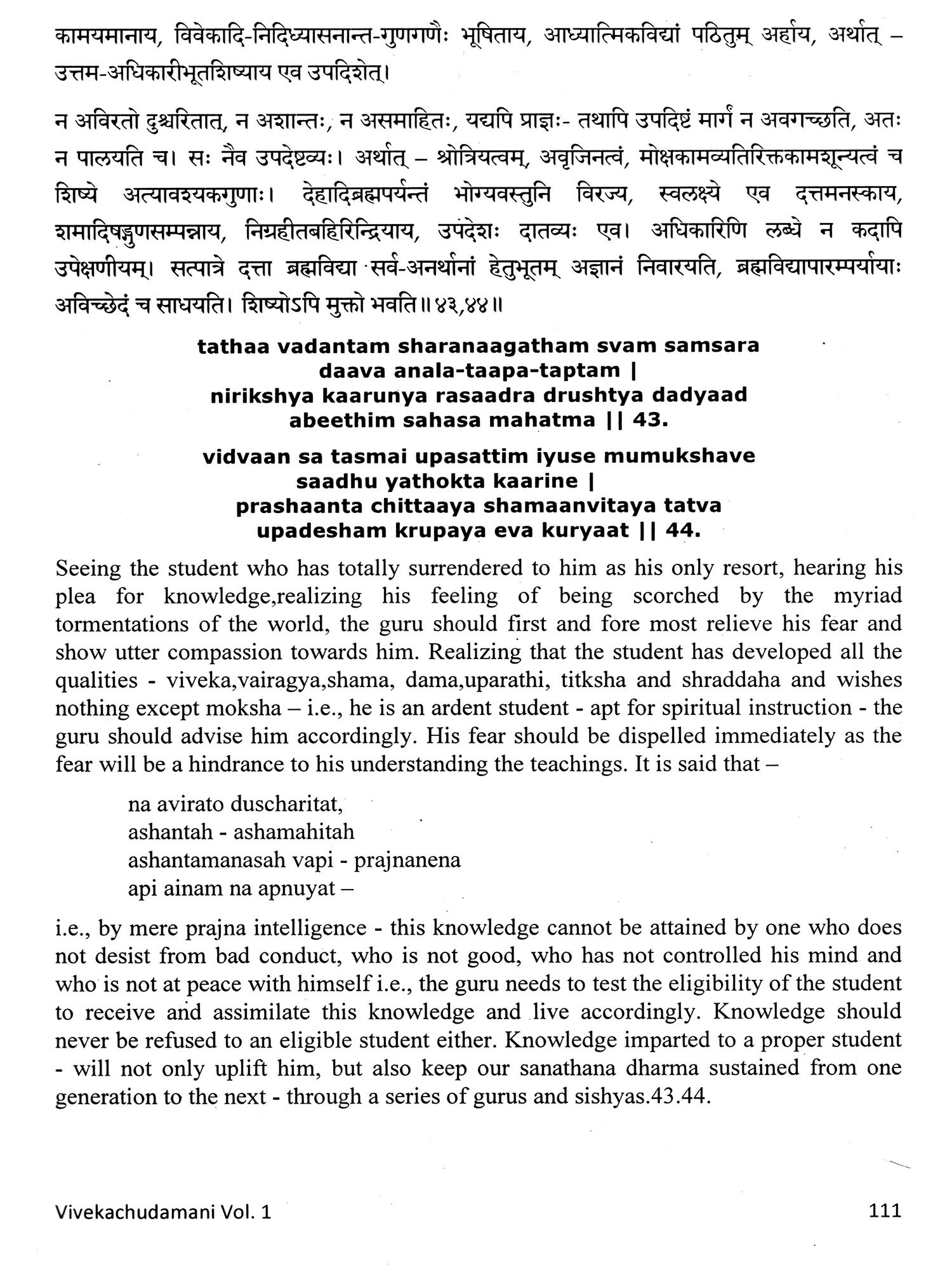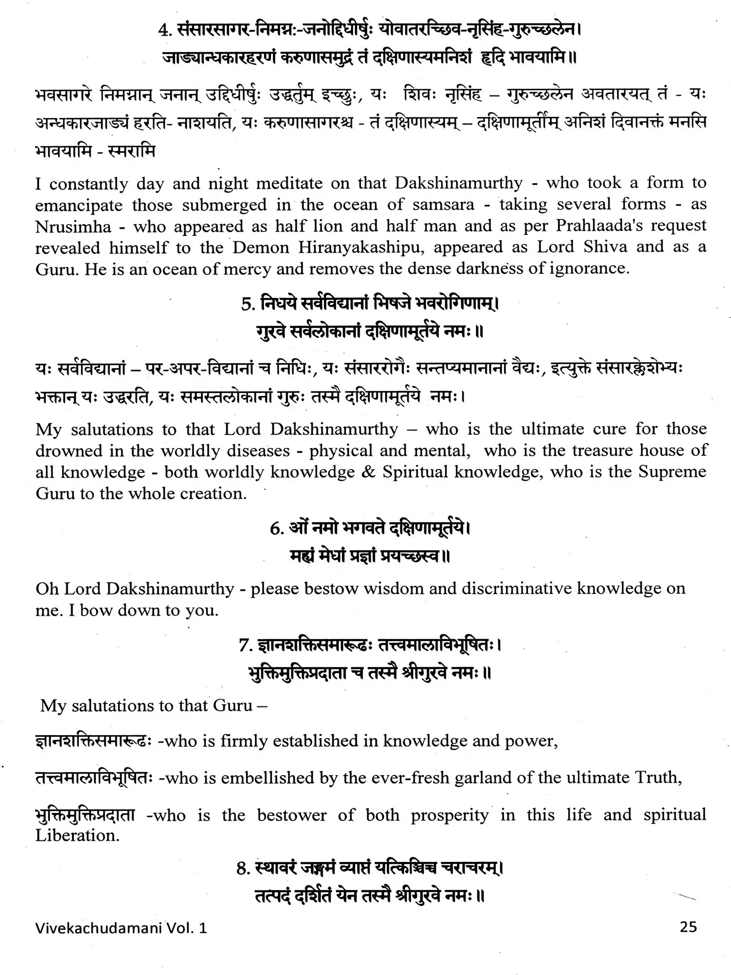 Viveka Chudamani consists of 580 verses in Sanskrit, but unlike other scriptures, it is not divided into chapters and sections. It has the form of dialogue between the master and the disciple, where the master explains to the disciple the nature of the Atman and the ways to research and know the Atman. The book takes the disciple on a step by step instructions to reach Brahman. It is not divided into chapters or sections. It is in the form of a dialogue between an ardent seeker and his Guru.