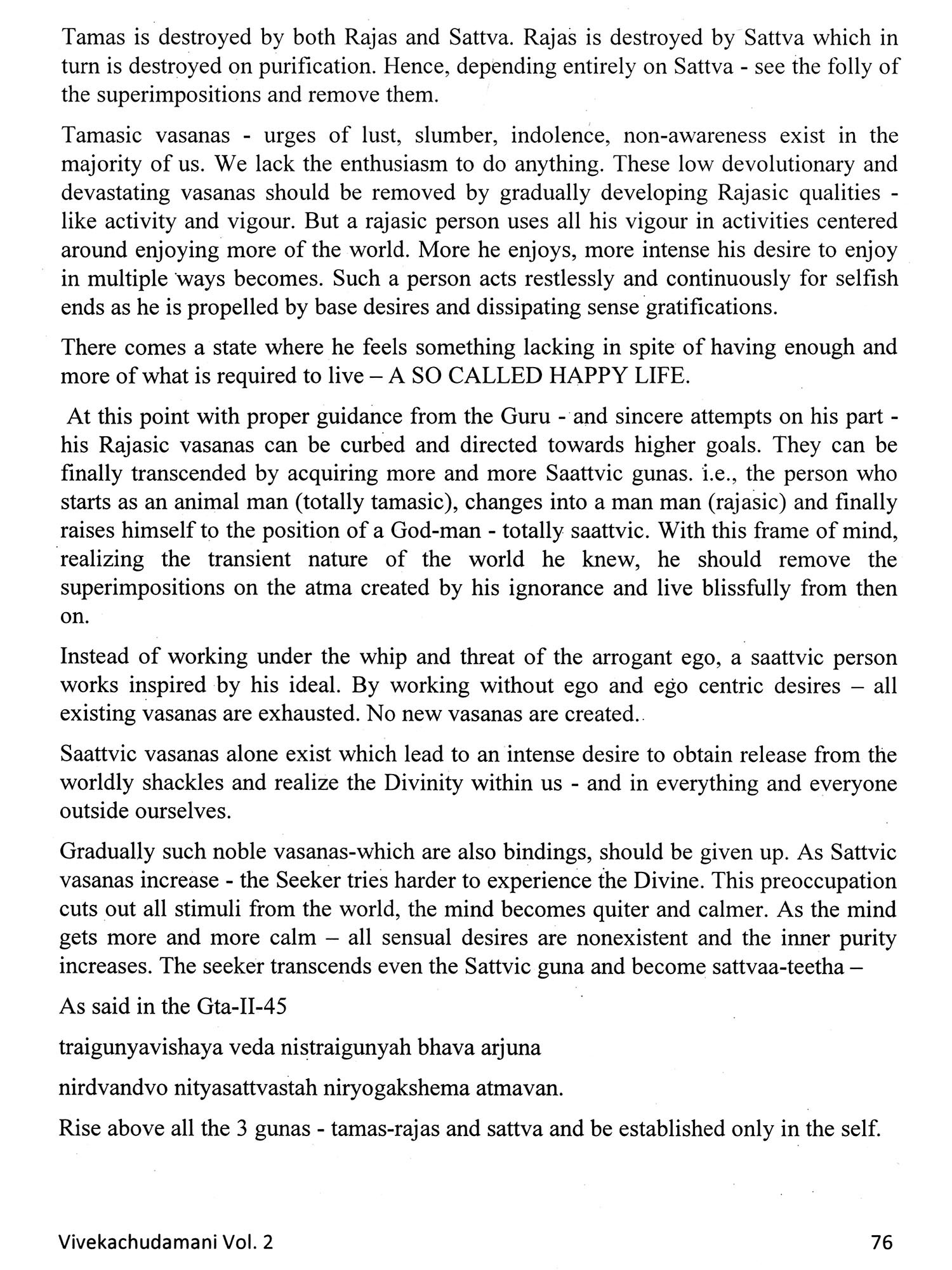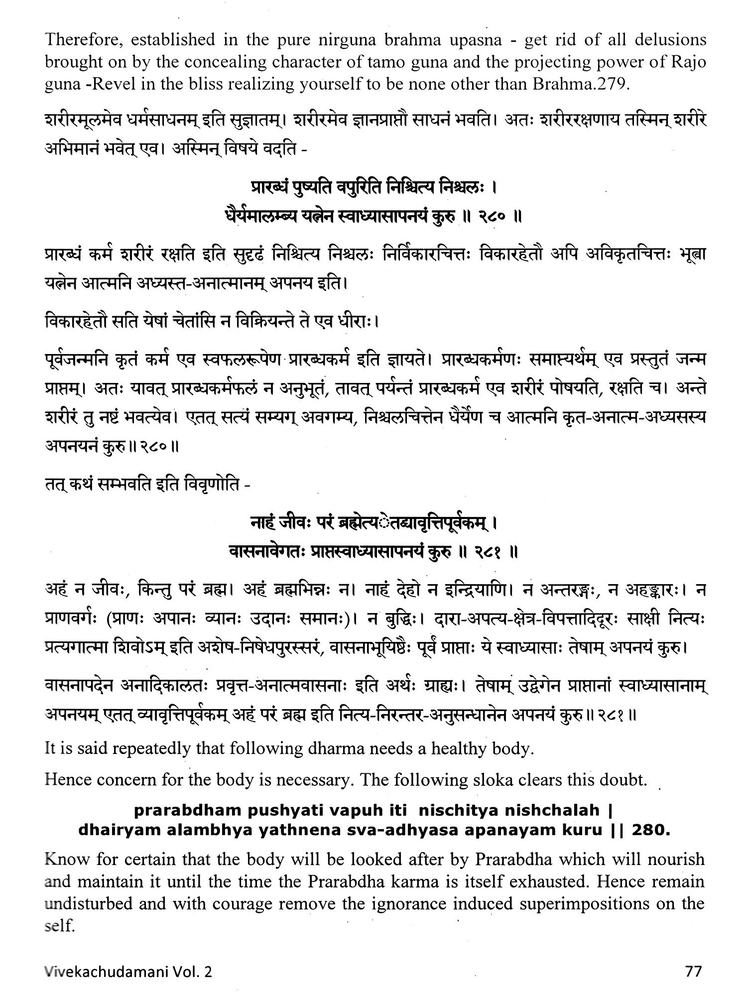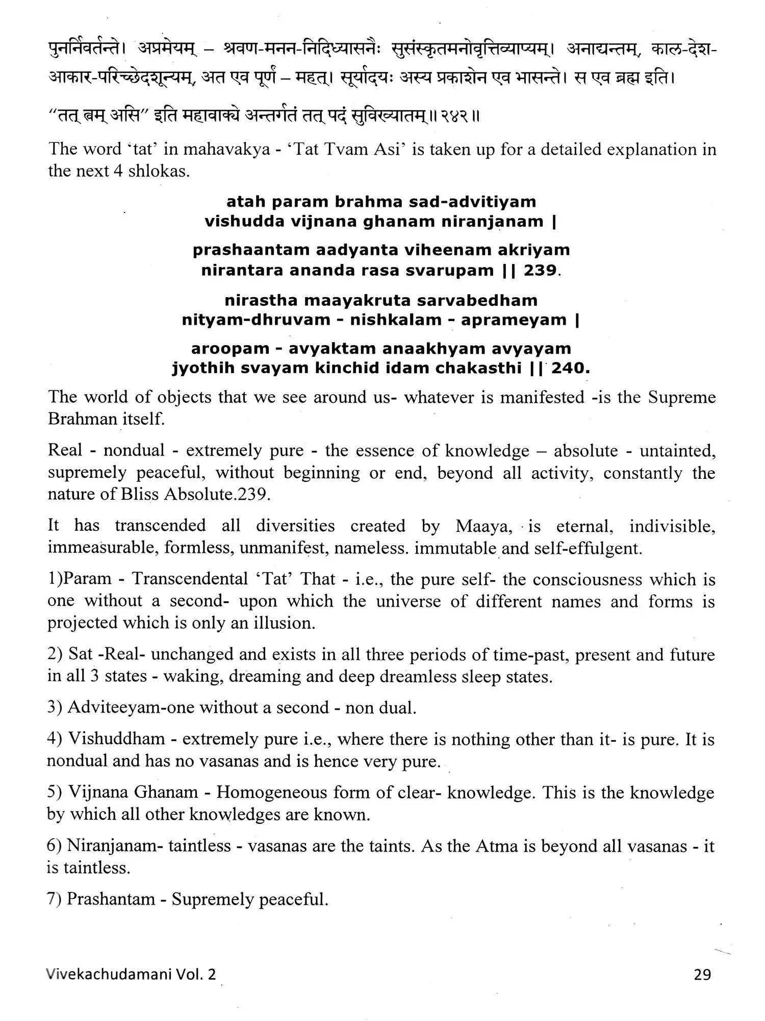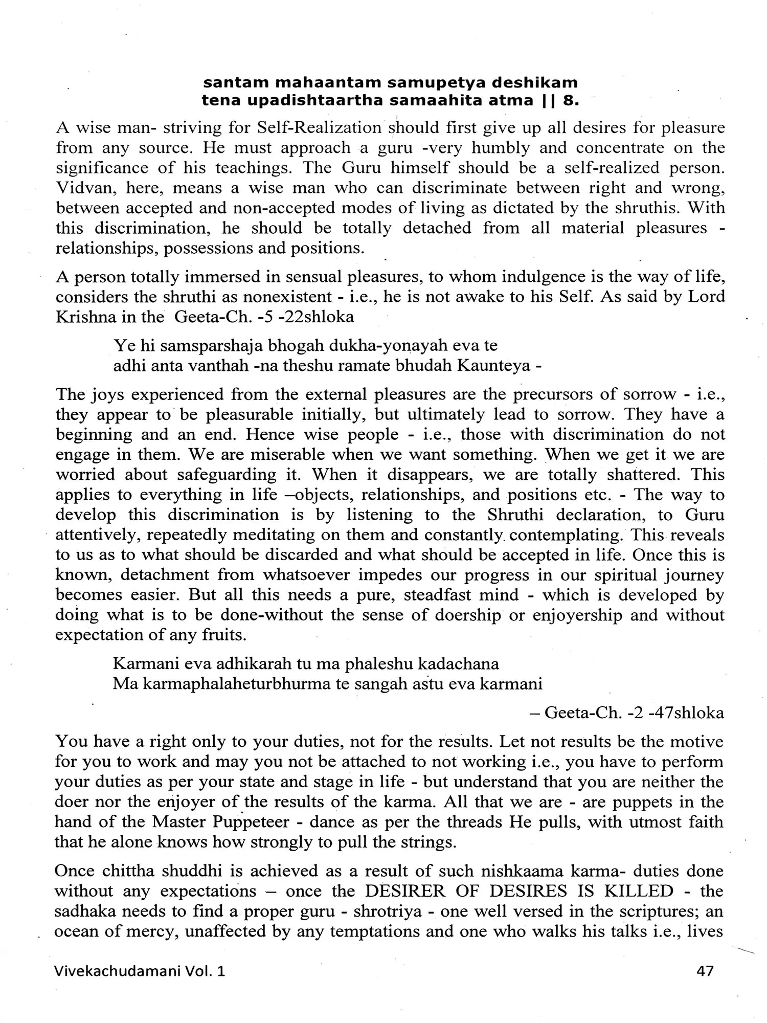 Viveka Chudamani consists of 580 verses in Sanskrit, but unlike other scriptures, it is not divided into chapters and sections. It has the form of dialogue between the master and the disciple, where the master explains to the disciple the nature of the Atman and the ways to research and know the Atman. The book takes the disciple on a step by step instructions to reach Brahman. It is not divided into chapters or sections. It is in the form of a dialogue between an ardent seeker and his Guru.