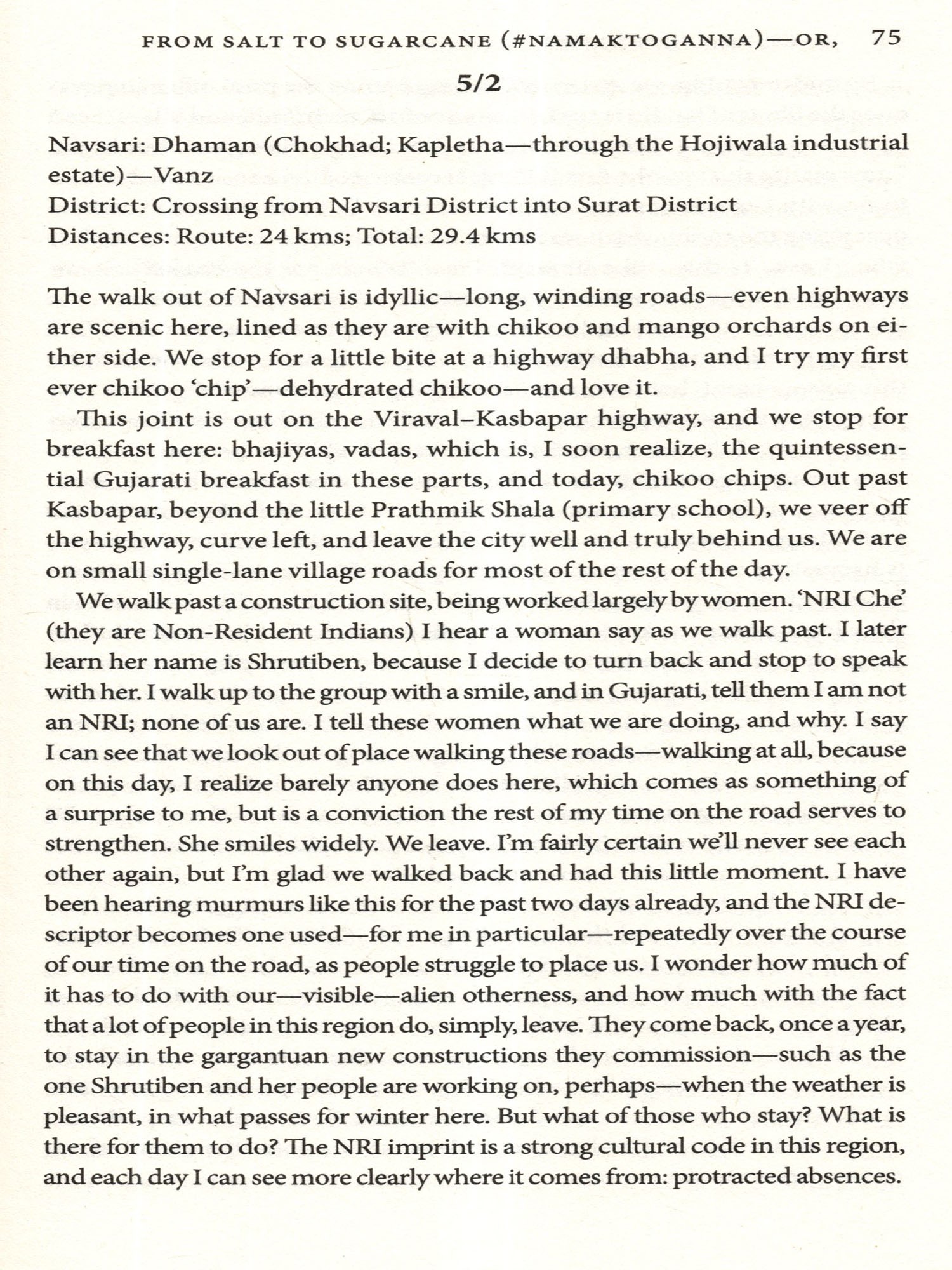As alluded to above, my intention was to explore two main themes: to see what (if anything) remained of the Salt March in cultural memory and oral history; and perhaps even more importantly, to attempt to discern the shape of this Gujarat I now inhabit but have little access to the rich lived inner realities of, owing to my multiple positions-along religious/caste/class/educational/urban-location lines of privilege. This made my endeavour one which forced upon me simultaneously and competingly insider and outsider-what ethnography would call emic and etic-positionalities. As Kottak defines it, 'the emic approach invesigates how local people think'; how communities make sense of their world from inside-out (2006: 47). The etic or 'scientist-oriented' approach on the other hand shifts the focus from 'local observations, categories, explanations, and interpretations to those of the anthropologist (or specialist)' (2006: 47). I was born in Gujarat, speak Gujarati, and have lived in this State for most of my life: this makes me an insider. However, since I am not Hindu (and therefore caste-bound), not male, and an English-speaking, urban location based academic to boot, this makes me an outsider, constantly forced to account for my 'self' in the place I have for so long called home. The number of times en route people began con-versations assuming I was a Non-Resident Indian (NRI) attests to this othering. I would proceed to disabuse them of this fallacy in chaste Gujarati, only to have them insist it simply had to be true: by day twenty-two on the road, it may as well have been, because I stopped feeling the need to correct them or prove that I was, indeed, as much of Gujarat as anybody present there.