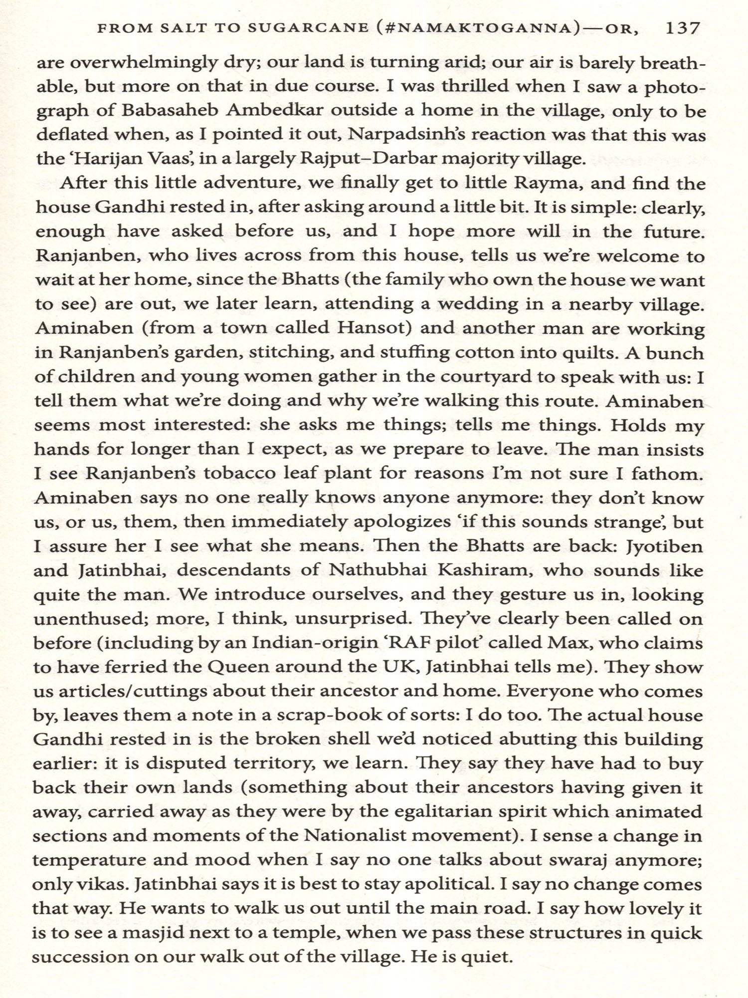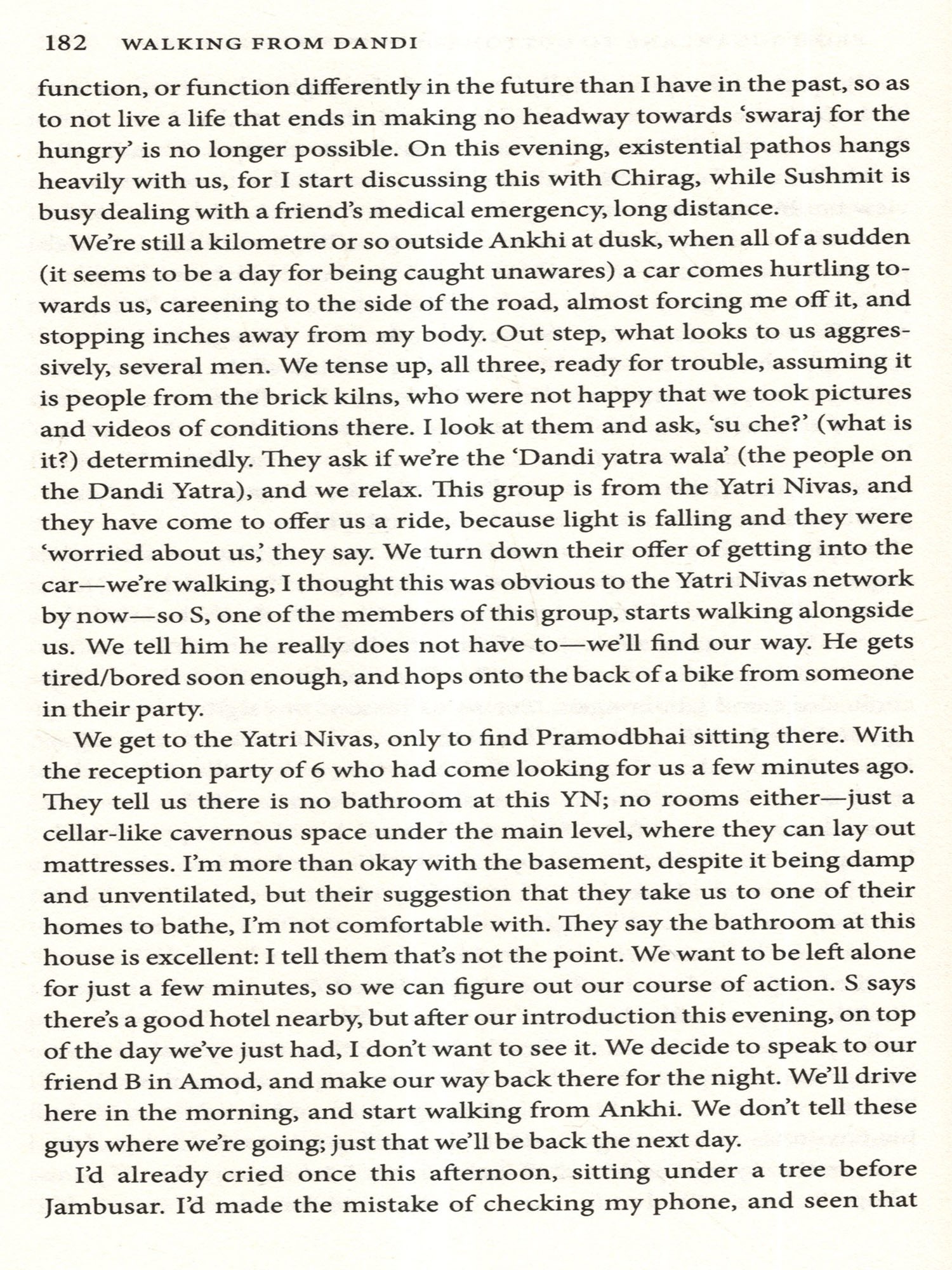 There were many who wanted to walk this road with us but could not: Anirban and Shormishtha Mukherjee, Dhananjai Sinha, Rishabh Mall, Anahita Ginwala, Mathangi Krishnamurthy, Naman Govil-carried you each with me all the same, promise. Tridip Suhrud, Megha Todi, Avanti, Tina, and Rusi Mehta, Marc Damania, Vispi and Nilu Siganporia: these were the sets of loving arms I got to fall into upon my return from Dandi-thank you for making the last stretch of the walk the most joyous one possible. Manik Acharya and the wonderful folks of E-57, upar and neechey: thank you for letting me talk your ears off for most of 2018, as this project slowly took possession of my being; thank you most of all for the love and the light that you continue to bring to my life.