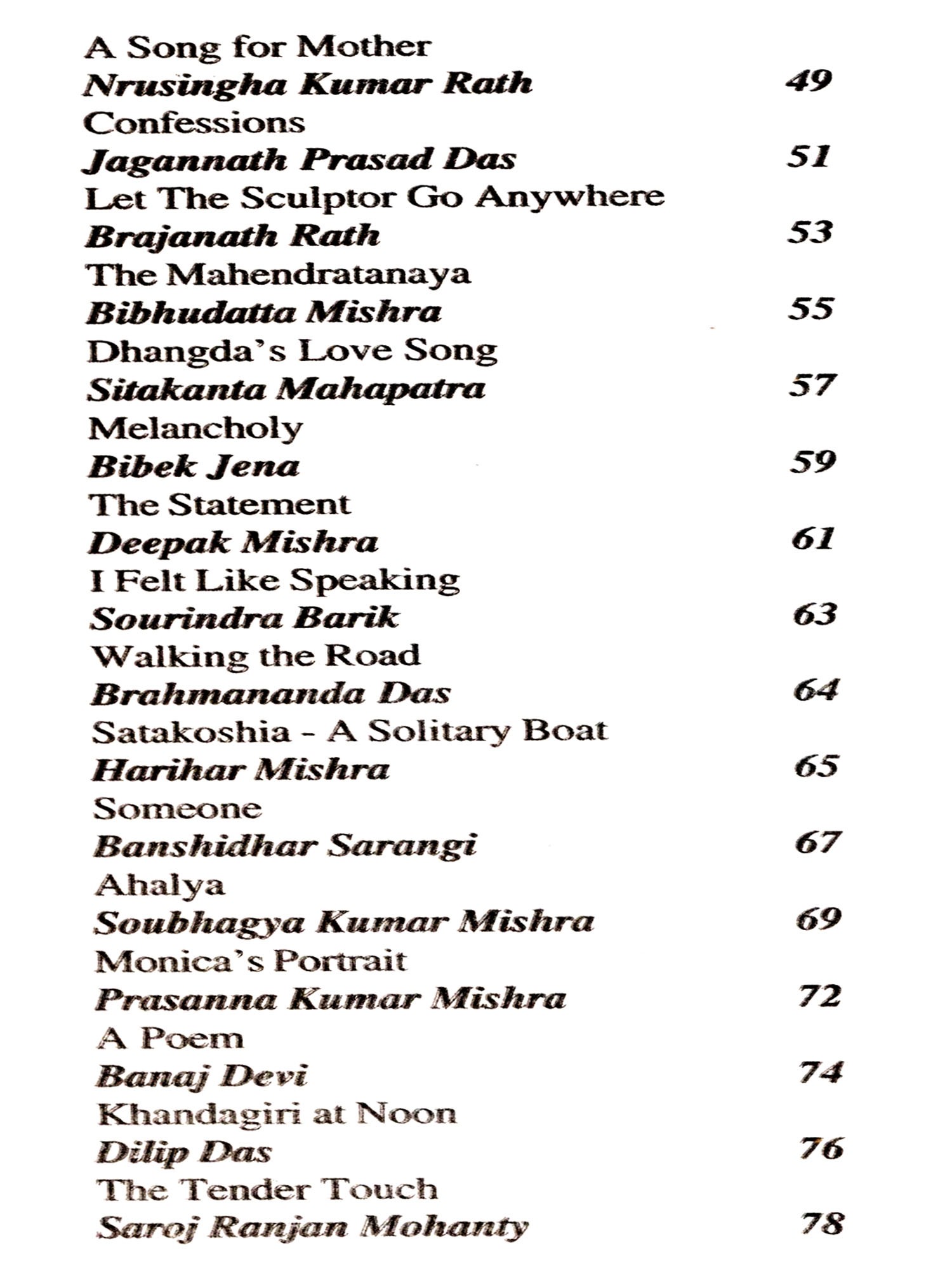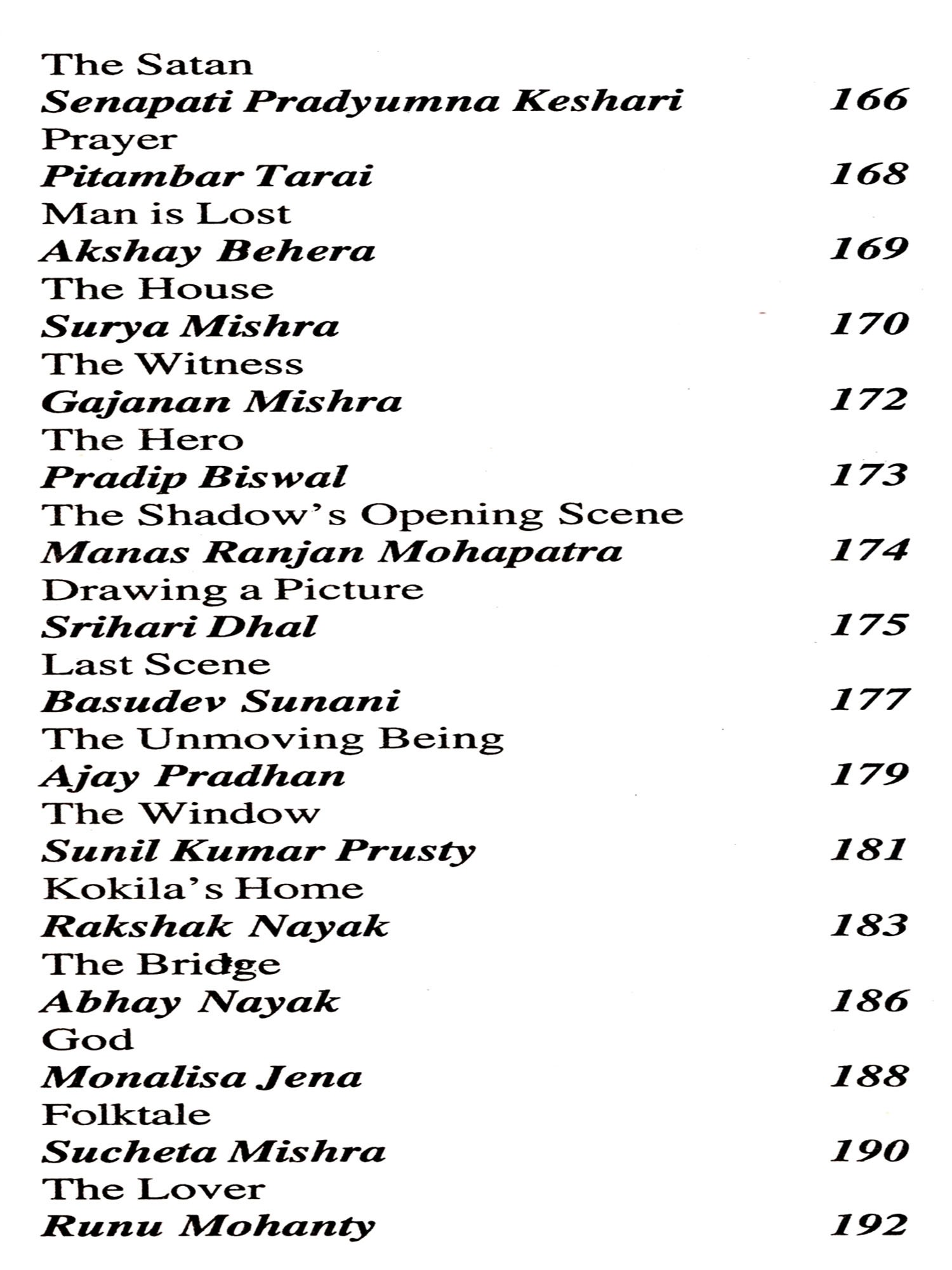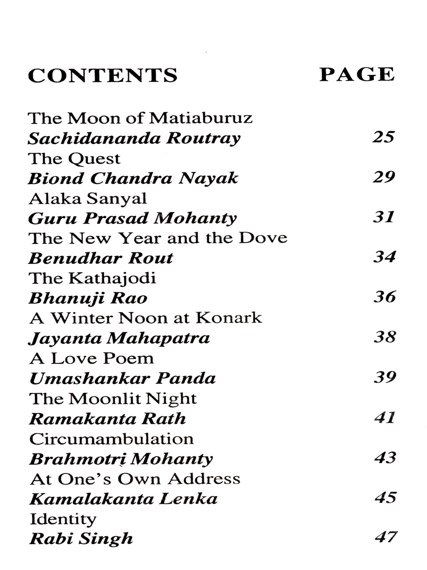 I express my sincere thanks to the translators for their judicious selection of representative modern Oriya poems. I am sure their lucid and sensitive translation of these will win for Oriya poetry a wider readership and a deeper understanding.