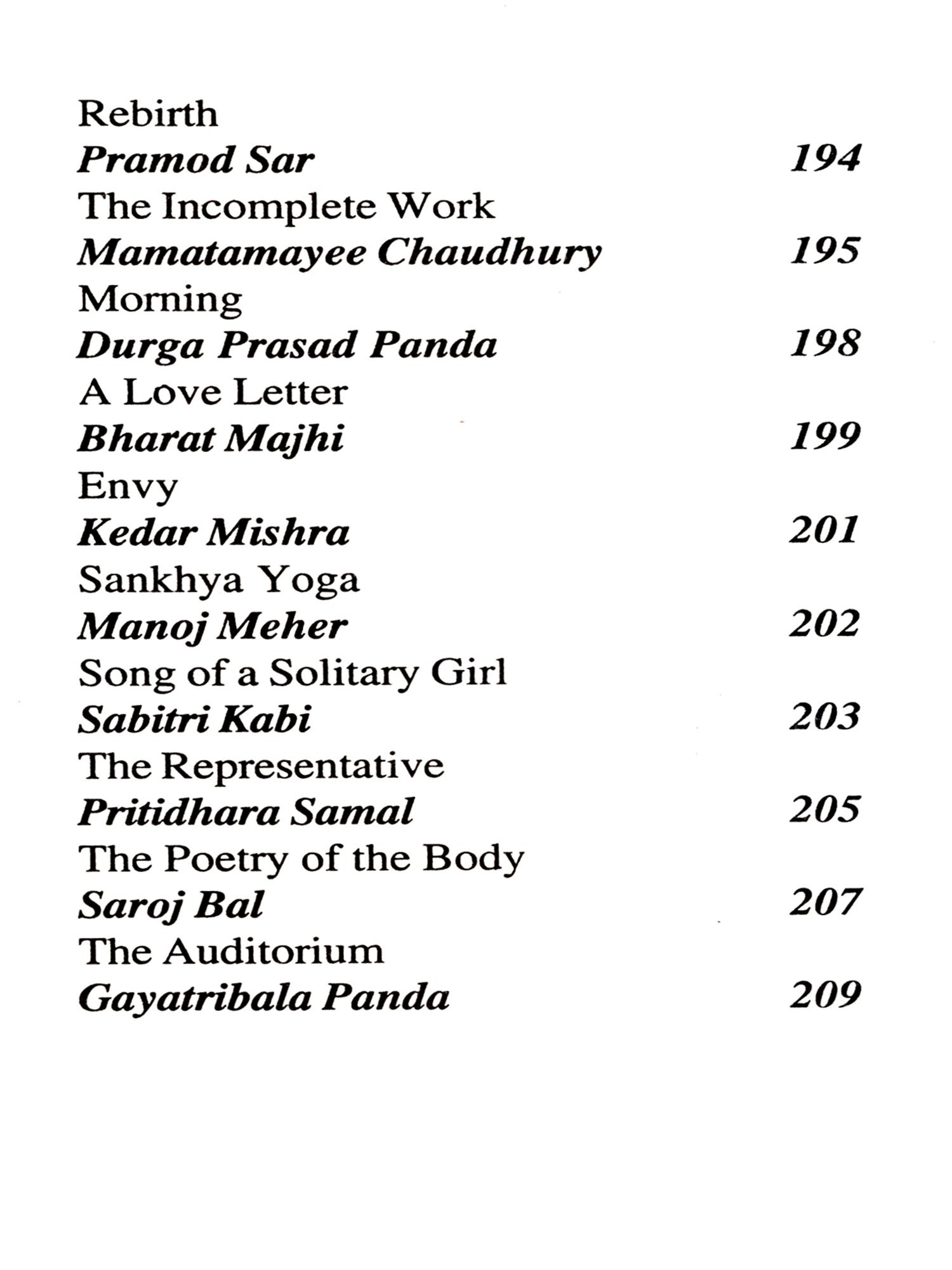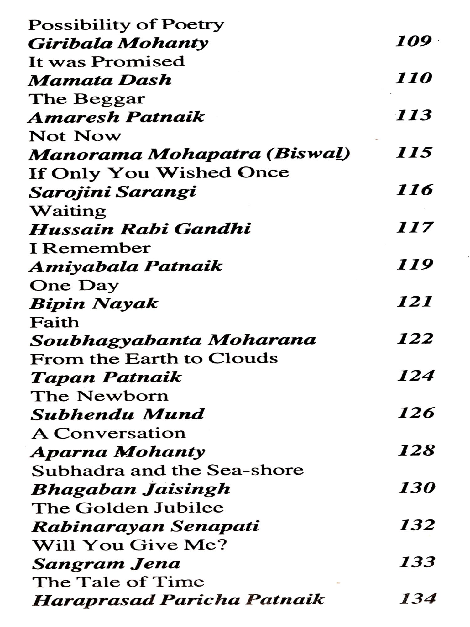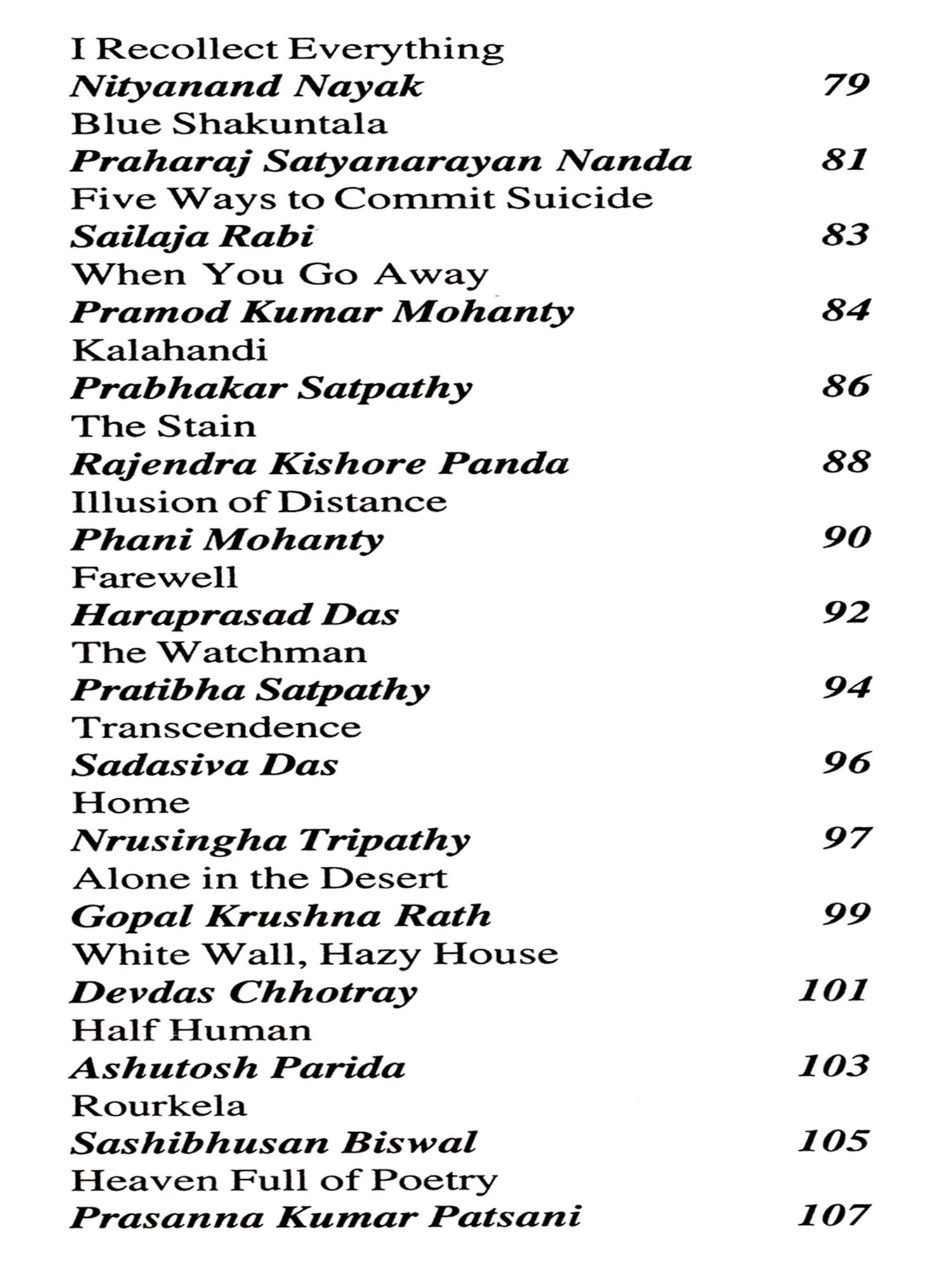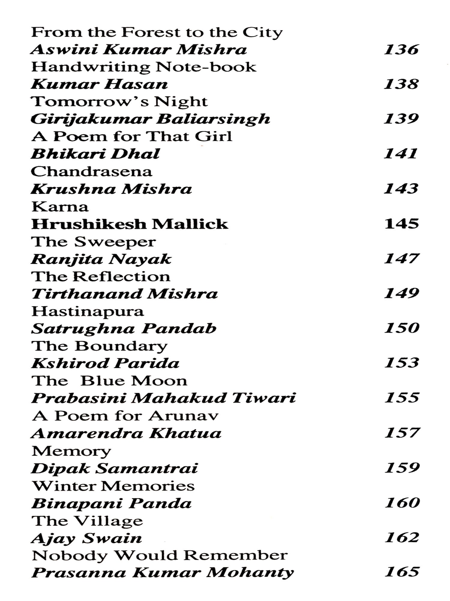 I express my sincere thanks to the translators for their judicious selection of representative modern Oriya poems. I am sure their lucid and sensitive translation of these will win for Oriya poetry a wider readership and a deeper understanding.