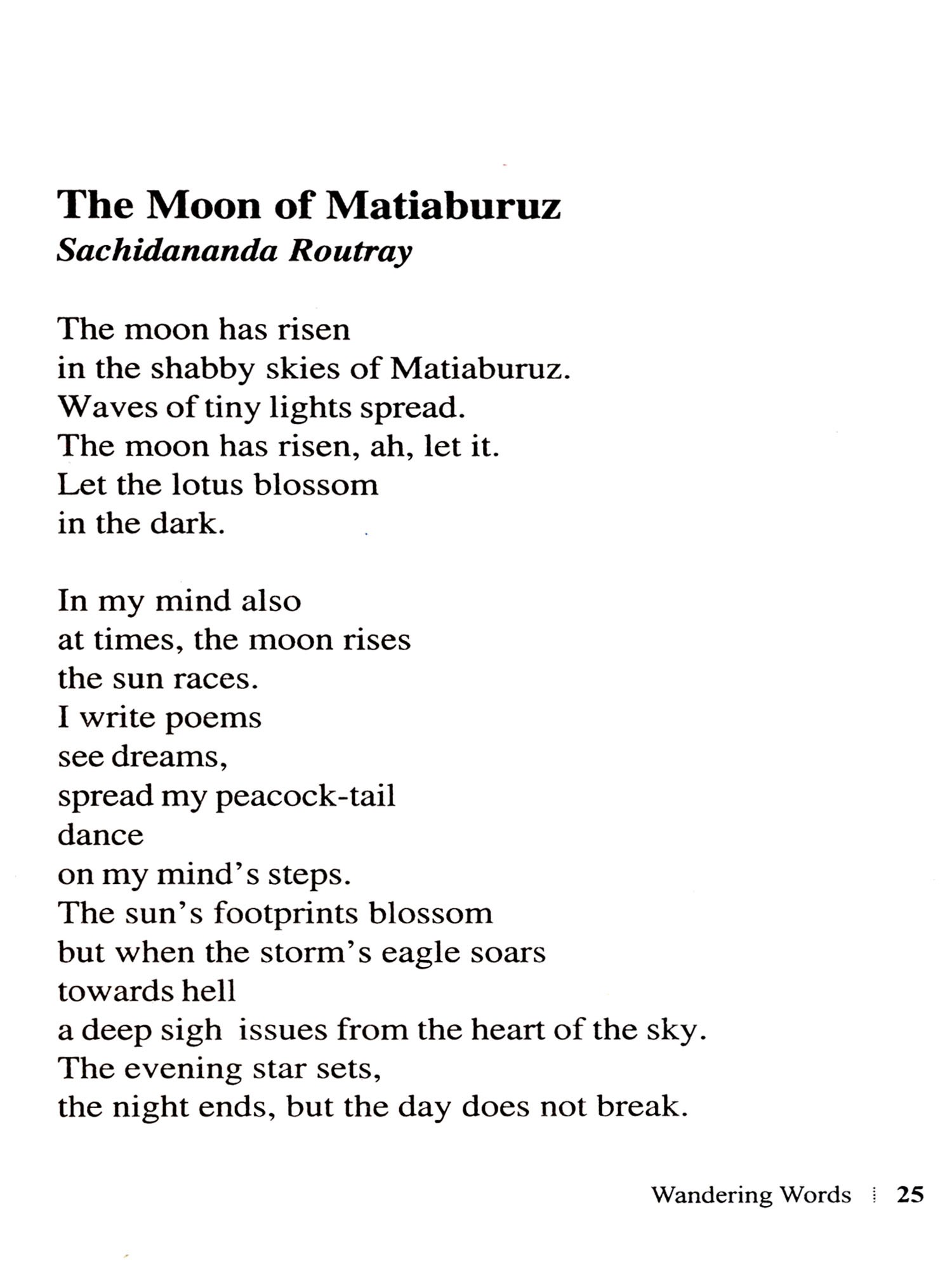 The symbolist poem could be thought of as a linguistic act of intrinsic value. In Oriya poetry this tradition was continued most overtly by Sachidananda Routroy, especially in the poems he wrote around the year of Indian independence. The poems are those very moments in which inspiration gets involved with consciousness and the unity of all things is established. To all accounts, Routroy's poetry becomes a mainstay of existence, something which picks up the fragments of our living and ultimately goes on to reveal those invisible connections between all that is living. To me, this view where man and nature can be identified as one, is particularly significant. Perhaps it seems right that this anthology begins with such a poem by Sachidananda Routroy.
