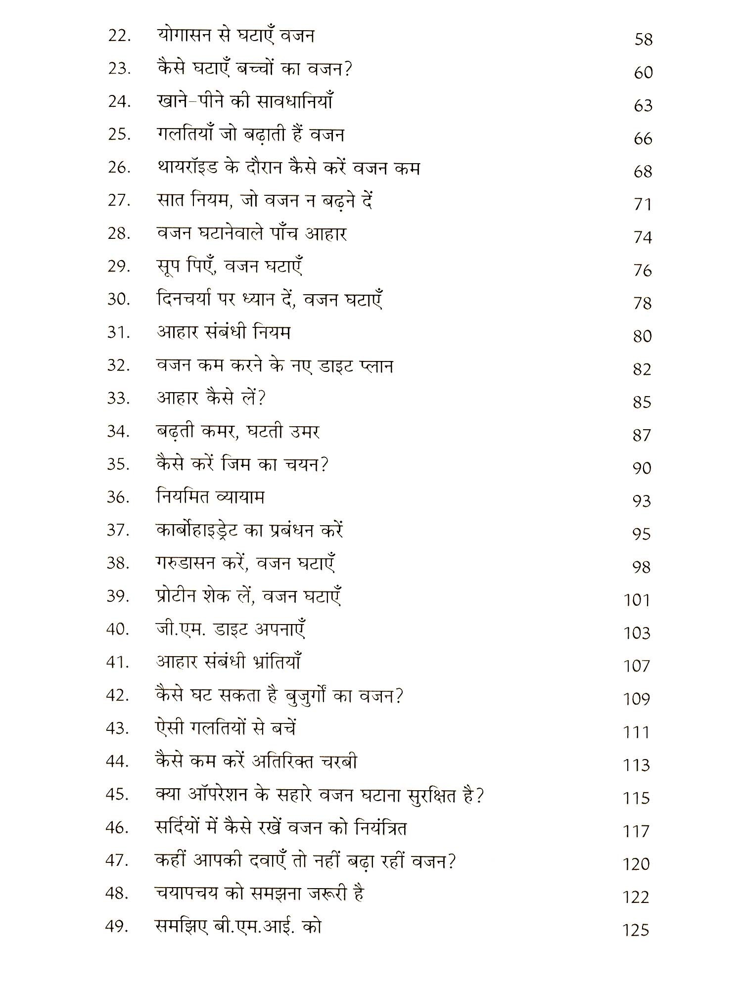 मोटापा टापा उठना-बैठना भी मुश्किल कर देता है। उम्र बढ़‌ने के साथ-साथ व्यक्ति को बीमारियों के अलावा सुस्ती भी घेरती है। वास्तविकता तो यह है कि मोटापा और शरीर का वजन बढ़‌ना ऊर्जा के सेवन और ऊर्जा के उपयोग के बीच असंतुलन के कारण होता है। अधिक वसायुक्त आहार का सेवन करना भी मोटापे का कारण है। मोटापा एक ऐसी बीमारी है, जो किसी को भी हो सकती है। जिस प्रकार खाँसी और कब्ज को रोगों का घर कहा जाता है, वैसे ही मोटापे को भी कई बीमारियों का जनक माना जाता है। दरअसल, अधिक मोटे व्यक्ति के शरीर में चरबी ही बढ़ती है, अन्य धातुएँ उतनी नहीं बढ़तीं। मोटा व्यक्ति भूख शांत करने के लिए नहीं खाता, बल्कि स्वाद की इंद्रियों को शांत करने के लिए कई तरह के भोजन करता है। इसे इस प्रकार भी कह सकते हैं कि अतिरिक्त भोजन मिलने पर, आराम-तलब होने पर और परिश्रम न करने पर हमारा शरीर अनावश्यक चरबी एकत्र करने लगता है। यही मोटापे का कारण है। प्रस्तुत पुस्तक में ऐसे उपयोगी तरीके बताए गए हैं, जिन पर अमल करते हुए कोई भी व्यक्ति अपने शरीर का वजन घटाकर अतिरिक्त मोटापे से निजात पा सकता है। वजन घटाने के व्यावहारिक टिप्स बतानेवाली अत्यंत उपयोगी पुस्तक।