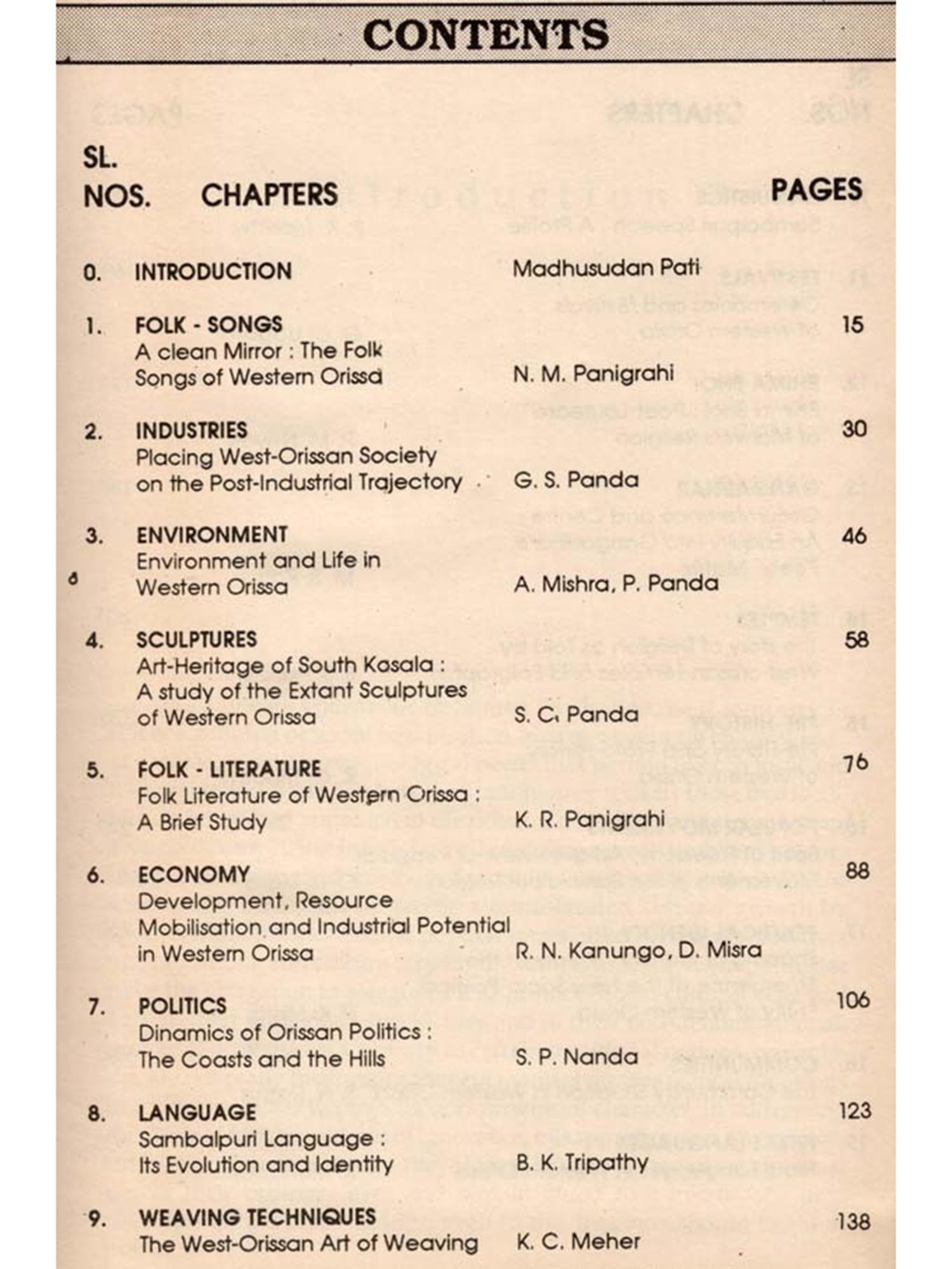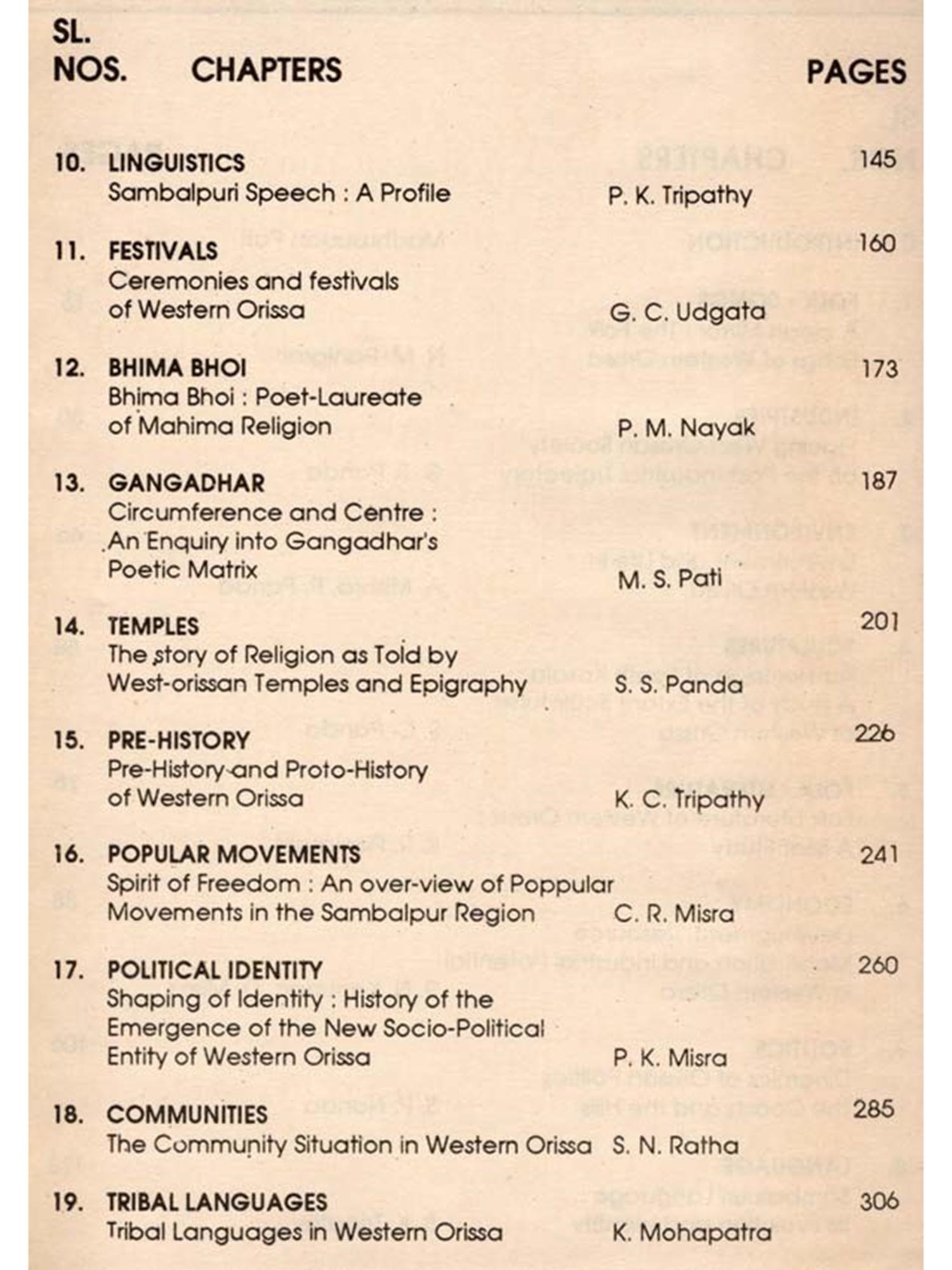 The publication of the commemorative volume is a part of the Silver Jubilee celebration of the Sambalpur University. The contributors of the essays have spared no efforts to record the true picture of the people of the region who, though highly placed socio-culturally, are agro-ecologically disadvantaged and economically distressed due to a great many reasons. In each essay an attempt has been made to identify one or more of the important socio-cultural dimensions, the past history, the present situation and the future potential of the region. Development is not, after all, a historical event which can be recounted once and for all, but a continuing process which demands a perpetual follow up. It is hoped that the volume will be of benefit to future researchers in the field and provide a reasonable data base for regional planning.