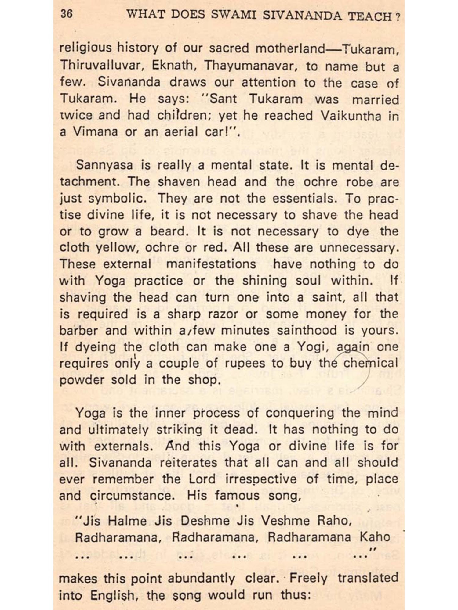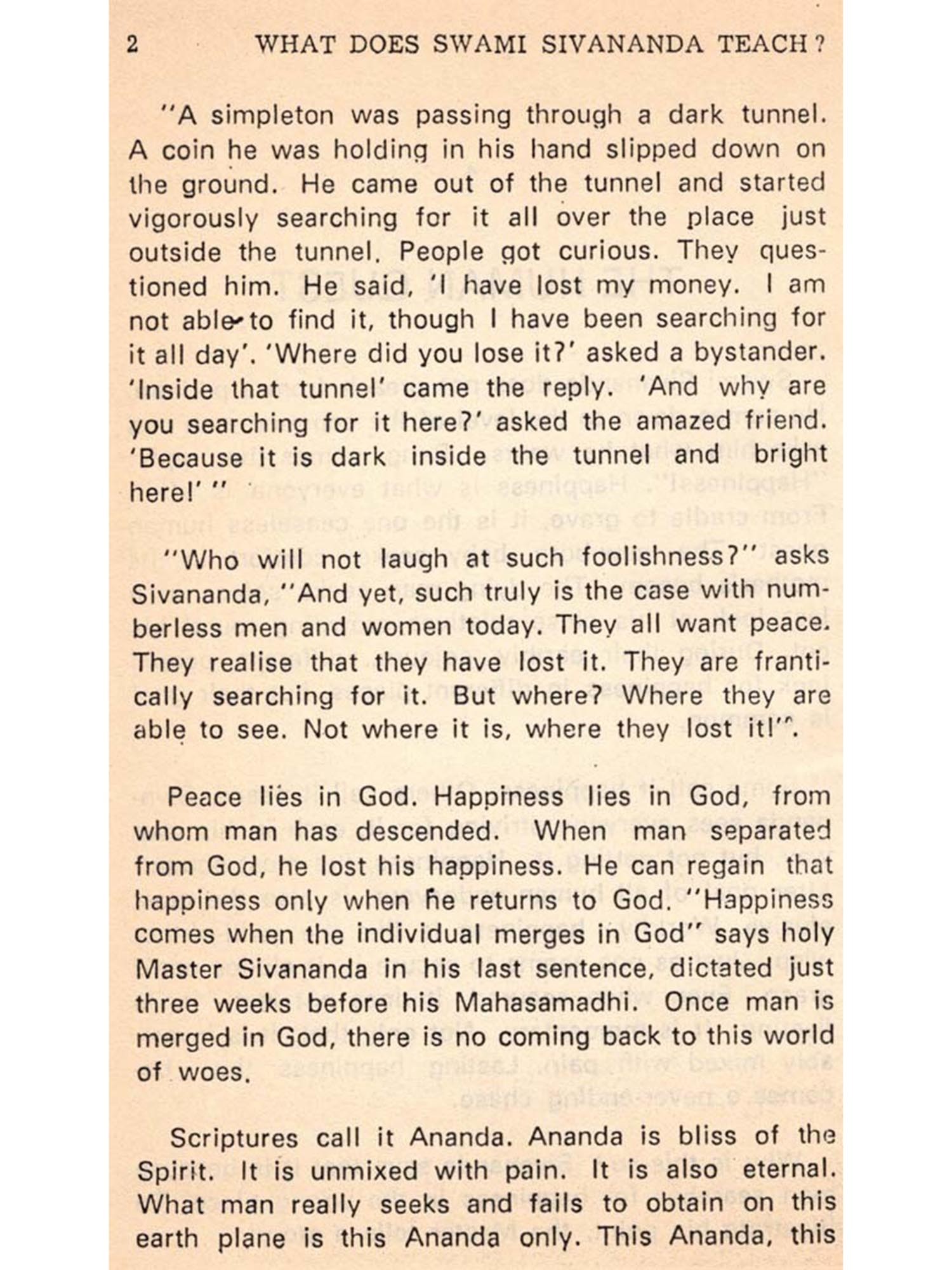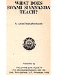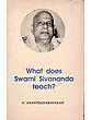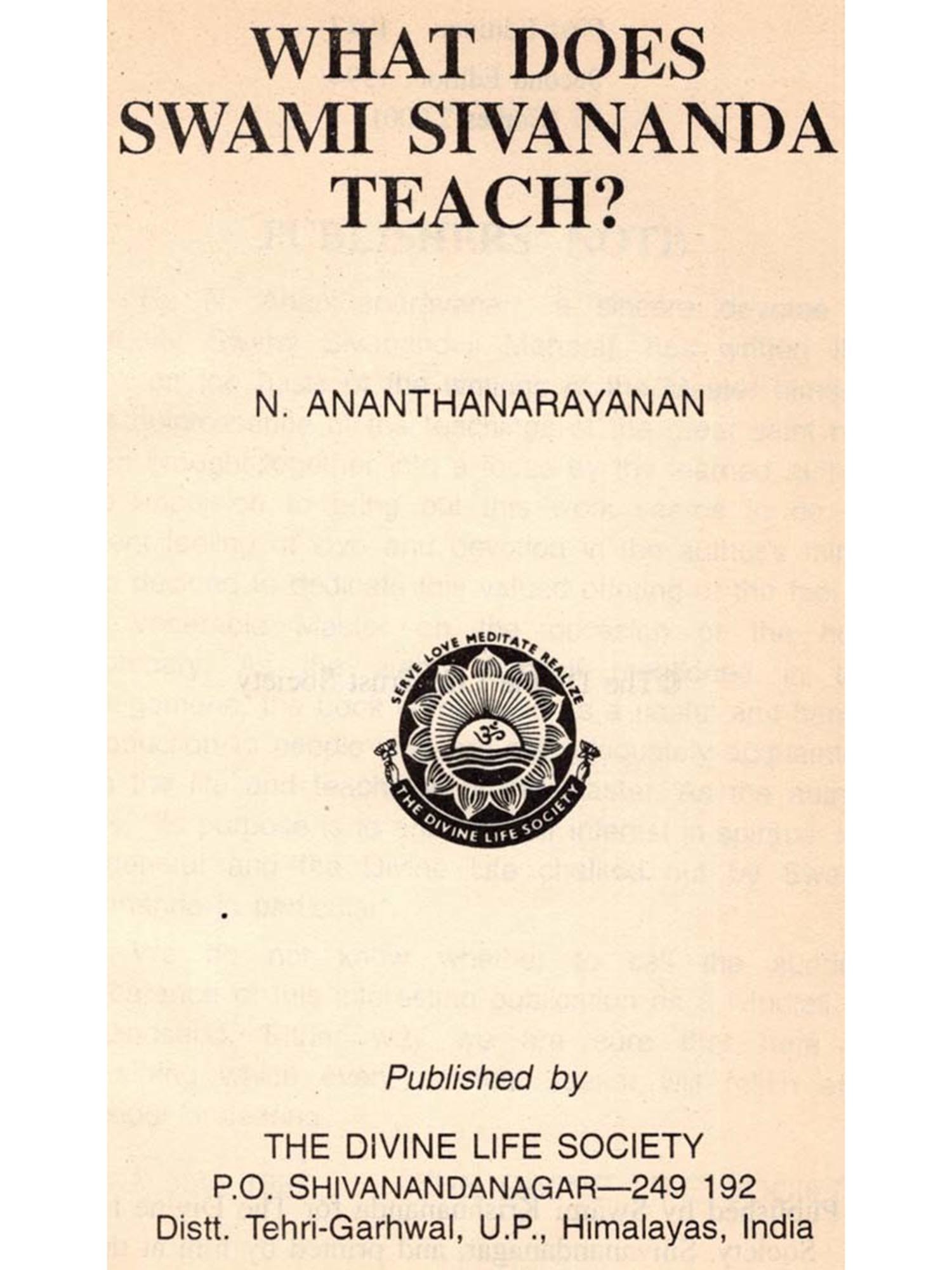 It gives me joy to write this brief foreword to the book, "What Does Swami Sivananda Teach?", written with much devotion by the well-known compiler of the magnificent volume "Bliss Divine" and author of "From Man to God-man", a beautiful biography of Gurudev Swami Sivanandaji with its many interesting illustrations. This present little book is Sri N. Ananthanarayananji's votive offering placed at Gurudev's feet on the auspicious occasion of the holy Master's Birth Centenary on 8th September, 1987. This is the form of Guru-dakshina which Gurudev would rejoice immensely to receive. As such, the present handy brochure constitutes a most appropriate offering upon this holy occasion. For this reason, it affords me special happiness to write this foreword.