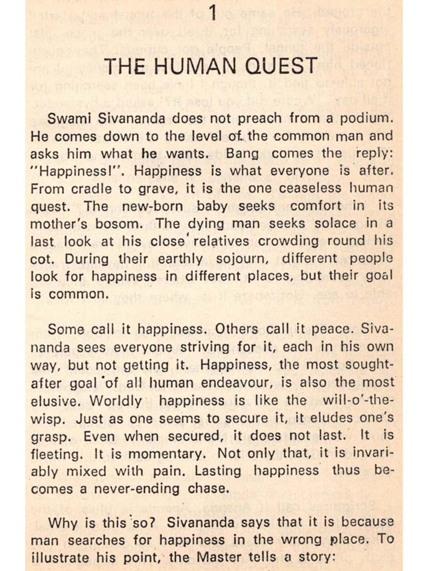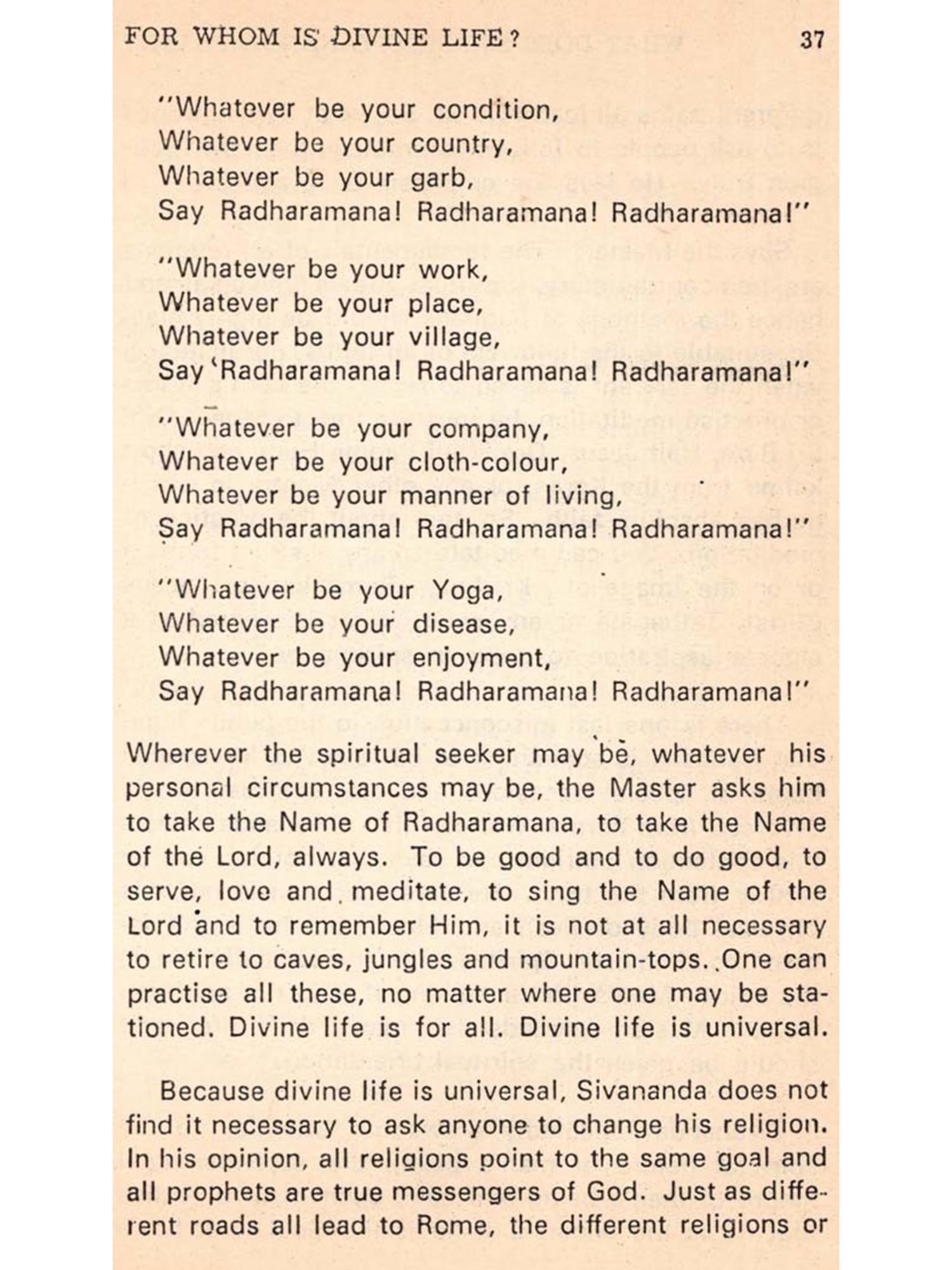 Salutations to holy Master Gurudev Swami Sivananda, the modern world teacher and spiritual awakener of the twentieth century mankind. May his living memory and his sacred spiritual message inspire us to live our life in a noble and divine manner, so that we are a source of abundant good and benefit to our fellowmen and to all life around us.