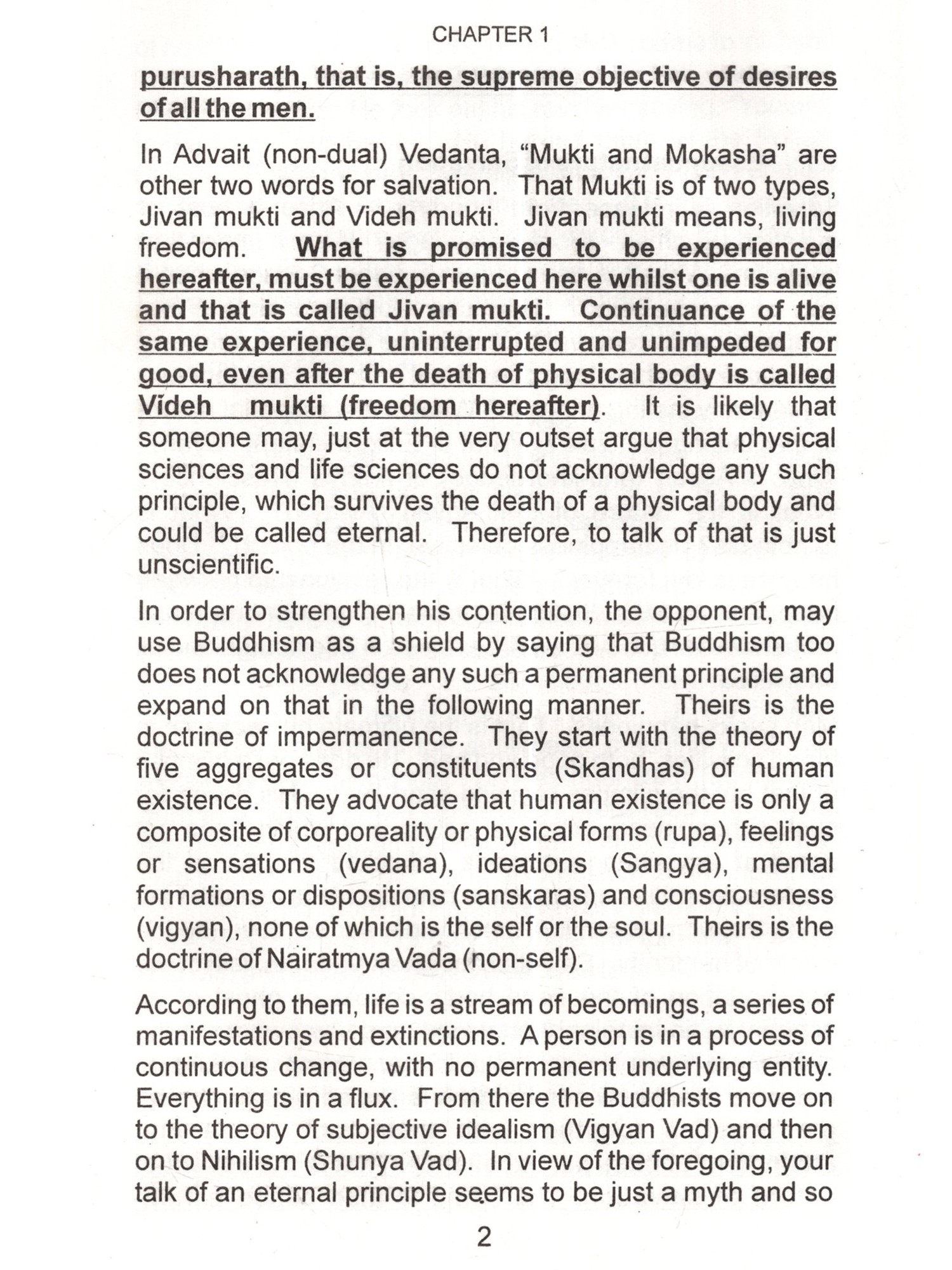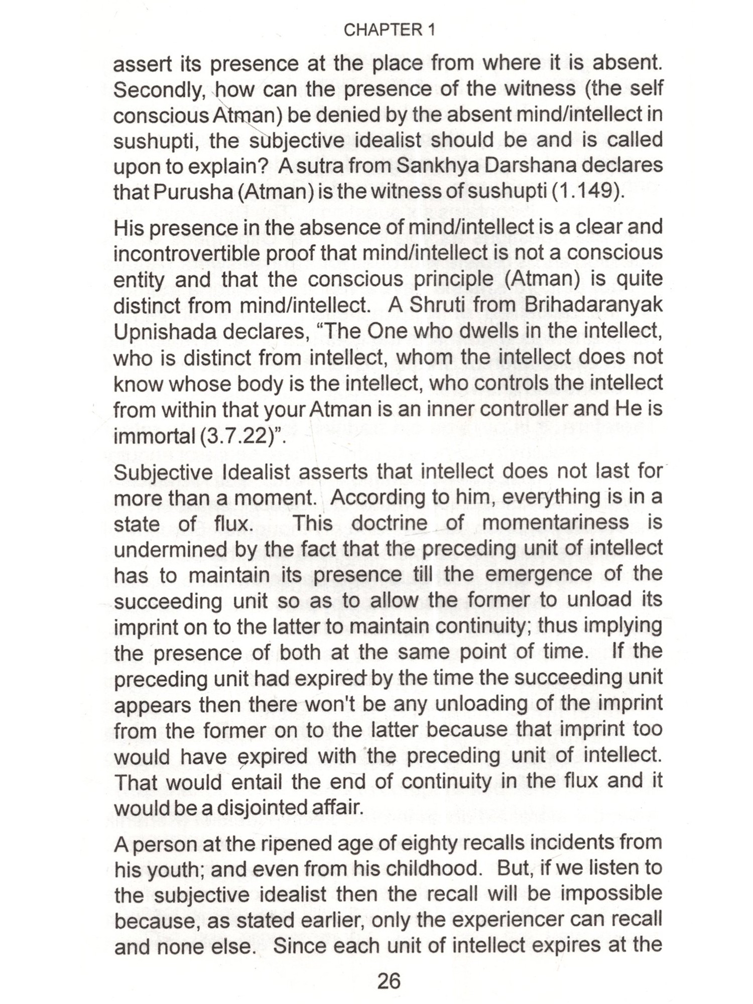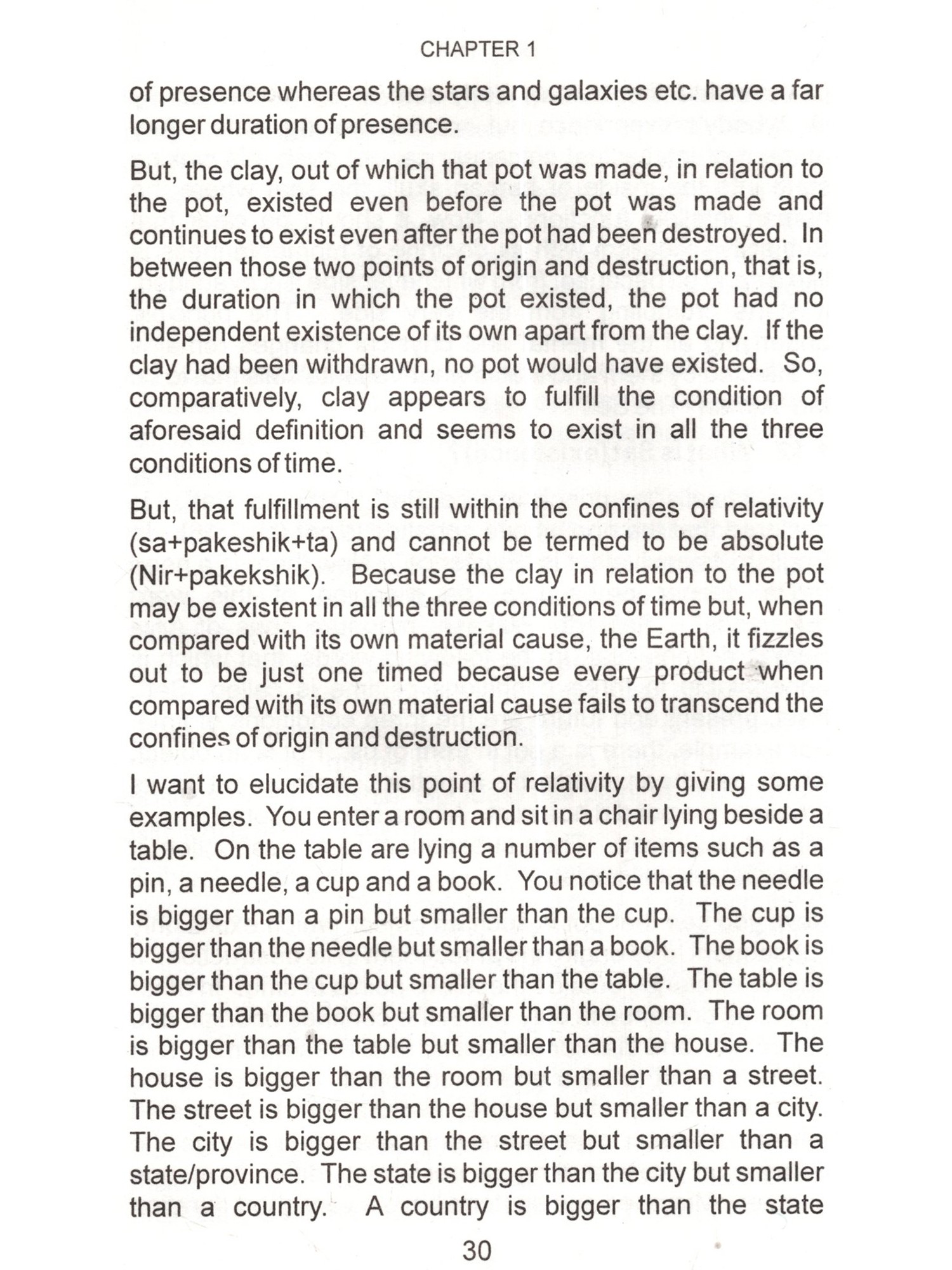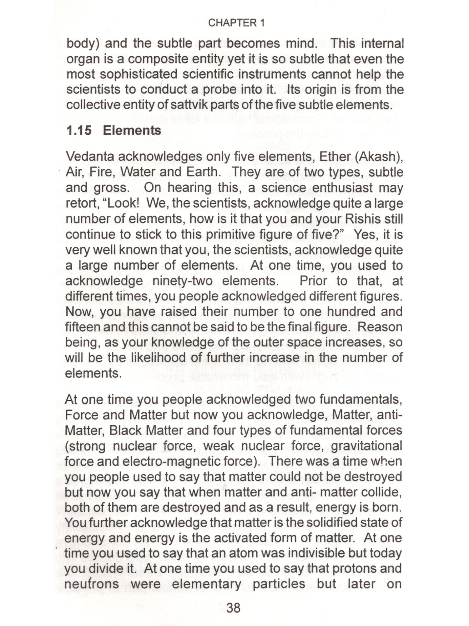 This is the age of Science. Especially, the physical sciences are directly opposed to superstitions and blind faith, which find easy refuge under religion. In religion, there are many good things as well as bad things. Good things, regardless of their source or origin should be accepted without hesitation and bad things even if those are from one's own religion rejected outright. Scientists are intelligent people, brilliant in their subjects and their achievements are spectacular. They should not be expected to accept anything simply on the basis of mere reverence for an author or some kind sentiments for him. By virtue of their training and dictates of their disciplines they demand some proof before accepting anything such as valid and sound. Question arises, is there any set of arguments, rather a doctrine backed by such arguments, which may appeal to them and command their respect ? The answer is an emphatic "Yes". That doctrine is called "Vedanta", that is, the doctrine of the Vedas. In a nutshell that doctrine is: 1. The Ultimate Reality is One and One only. That is called by the name of "Brahm". I am reluctant to use the word Brahman because I find that word to be misleading the general public. I have explained that in detail in the text of this book. 2. Prakriti (Matter) is the material cause of this manifested manifold. In other words, it is the Prakriti, which transforms into this universe but it lacks independent existence of its own. It doesn't have absolute existence but negatable existence. Absolute existence is that which stands unnegated in all the conditions of time. Negatable existence is that which is other than absolute existence and absolute non-existence. Absolute non-existence is that which It can be said to have relative 3. Individual soul's difference from supreme soul is due to the limiting adjunct of the internal organ or the fractional unit of Avidya otherwise, in essence, the former is identical with the latter. Limiting adjunct is that which shows its own characteristics into the other and others characteristics unto itself. Such as, a bucket full of water shows the sun reflected unto itself. If the water is muddy then the reflection is murky too. If the water is shaky then the reflection is shaky too. On the other hand its own water starts getting warm by the heat of the sun. Vedanta employs powerful reasoning. Its reasoning is like the foot of Angad. It can withstand intellectual onslaught of an opponent and still convince him. Angad went to the court of Ravan, the demon king of Lanka and challenged all those who were present there to lift his foot. Those who tried, they all failed. You will find reasoning of the opponent being trounced and stopped in its tracks. Indian philosophy has books with super-subtle arguments. In the words of Professor S.N.Das-Gupta, in the ultra-logical period, A.D.1100-1700, we have keen discussions and dialectics of an extremely subtle character such as had never developed in Europe at that time and which are in part so difficult that few occidental scholars have been able to master them. (A Cultural History of India edited by A.L.Basham-Ch. X). It is likely that any young science enthusiast may make some observations and raise a number of pertinent questions by saying, "Look! We, the scientists, have a large (ii) non-existence. Absolute non-existence is that which It can be said to have relative 3. Individual soul's difference from supreme soul is due to the limiting adjunct of the internal organ or the fractional unit of Avidya otherwise, in essence, the former is identical with the latter. Limiting adjunct is that which shows its own characteristics into the other and others characteristics unto itself. Such as, a bucket full of water shows the sun reflected unto itself. If the water is muddy then the reflection is murky too. If the water is shaky then the reflection is shaky too. On the other hand its own water starts getting warm by the heat of the sun. Vedanta employs powerful reasoning. Its reasoning is like the foot of Angad. It can withstand intellectual onslaught of an opponent and still convince him. Angad went to the court of Ravan, the demon king of Lanka and challenged all those who were present there to lift his foot. Those who tried, they all failed. You will find reasoning of the opponent being trounced and stopped in its tracks. Indian philosophy has books with super-subtle arguments. In the words of Professor S.N.Das-Gupta, in the ultra-logical period, A.D.1100-1700, we have keen discussions and dialectics of an extremely subtle character such as had never developed in Europe at that time and which are in part so difficult that few occidental scholars have been able to master them. (A Cultural History of India edited by A.L.Basham-Ch. X). It is likely that any young science enthusiast may make some observations and raise a number of pertinent questions by saying, "Look! We, the scientists, have a large (ii) non-existence. Absolute non-existence is that which It can be said to have relative 3. Individual soul's difference from supreme soul is due to the limiting adjunct of the internal organ or the fractional unit of Avidya otherwise, in essence, the former is identical with the latter. Limiting adjunct is that which shows its own characteristics into the other and others characteristics unto itself. Such as, a bucket full of water shows the sun reflected unto itself. If the water is muddy then the reflection is murky too. If the water is shaky then the reflection is shaky too. On the other hand its own water starts getting warm by the heat of the sun. Vedanta employs powerful reasoning. Its reasoning is like the foot of Angad. It can withstand intellectual onslaught of an opponent and still convince him. Angad went to the court of Ravan, the demon king of Lanka and challenged all those who were present there to lift his foot. Those who tried, they all failed. You will find reasoning of the opponent being troun