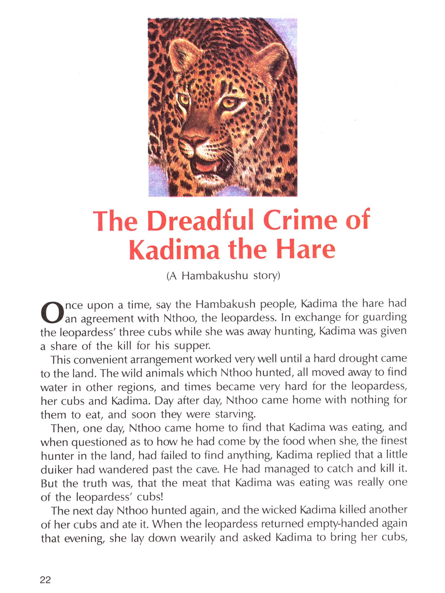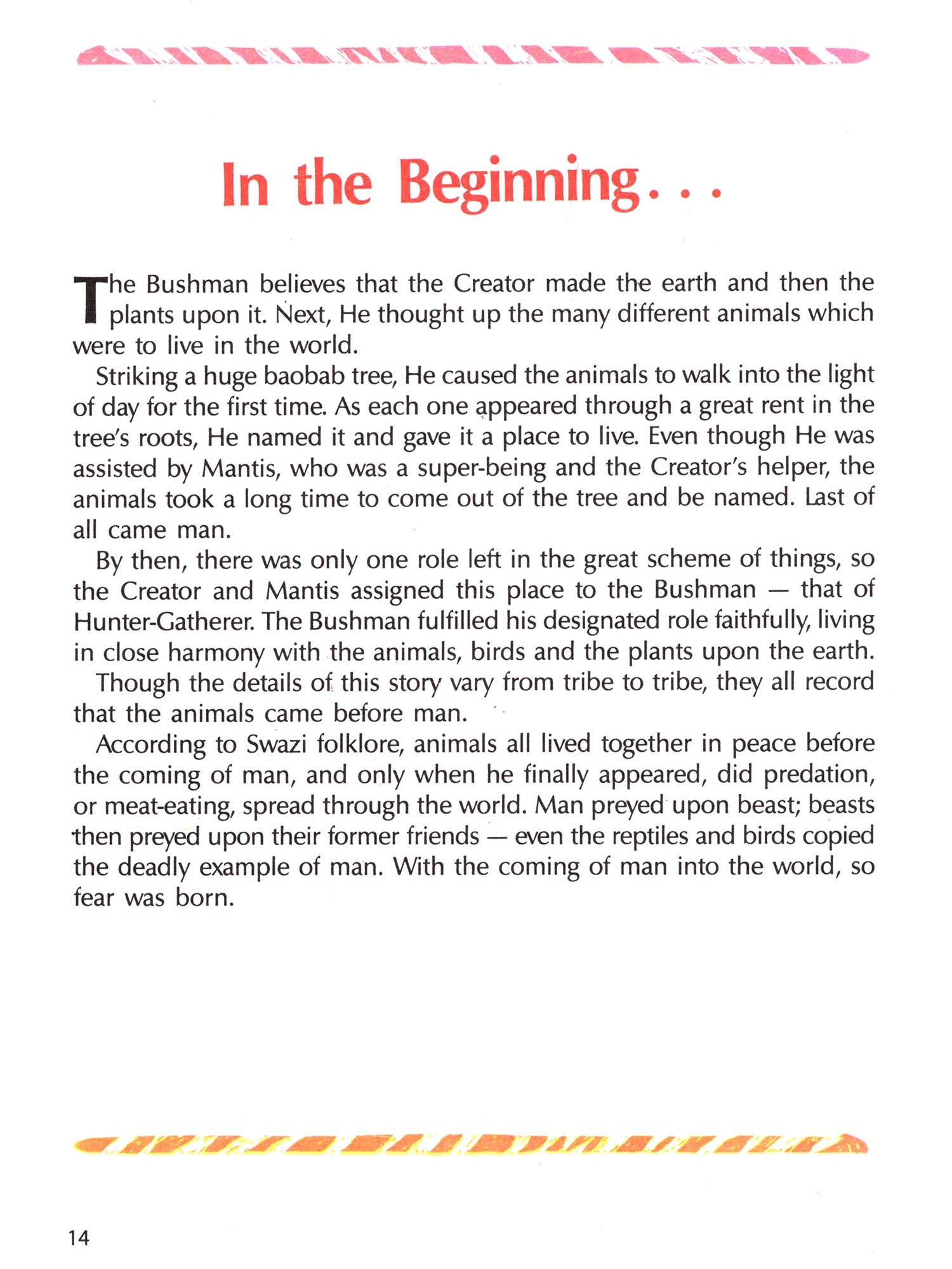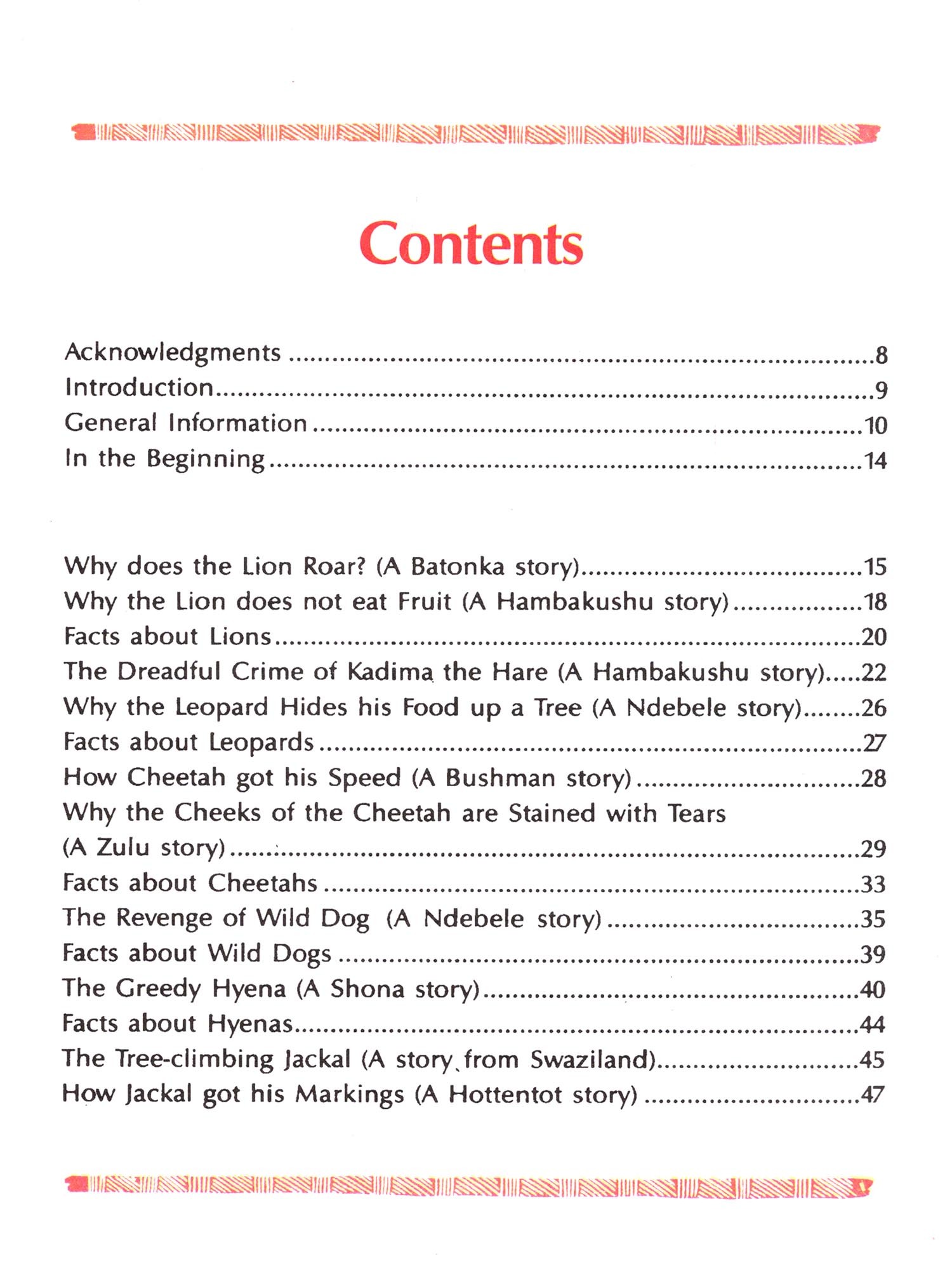 One of the legacies of Africa's erstwhile teeming wildlife is the wealth of folklore and mythology surrounding it. Indeed, the richness of the lore mirrors the richness of the wildlife. Many of the tales, although told by different tribes from region to region, are basically similar, and they remain a source of knowledge and enjoyment to us and to future generations.