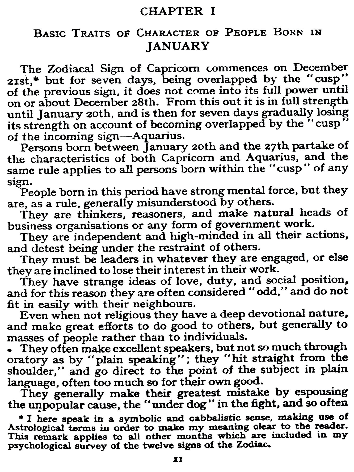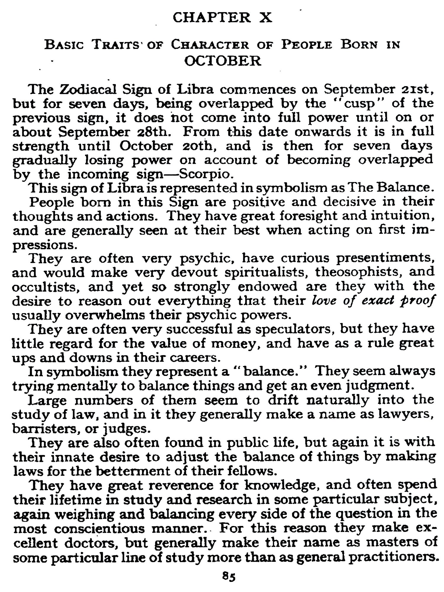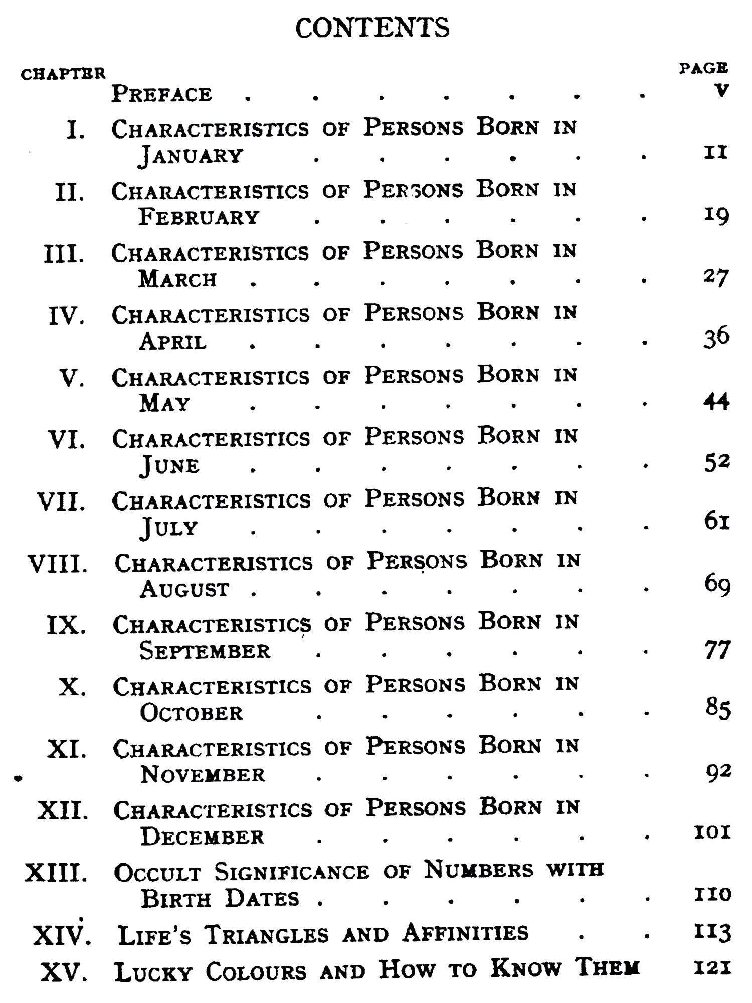 The purpose of this book is to endeavour to show in a clear and simple manner the useful and practical truth that underlies the so-called occult study of reading character and disposition by the "period of birth," and the meaning of the number of each day and the influence of such things on human life. It will, I hope, be seen in reading these pages how perfect is the mechanism of the Universe, by which certain characteristics, and even details as to health, may be traced by a study of such things.