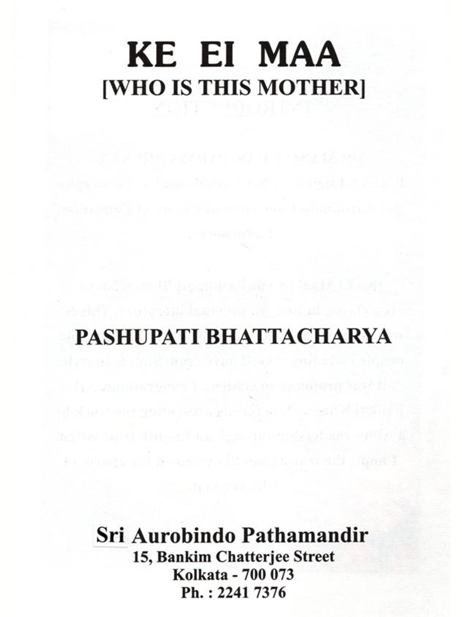 The rendering of Dr. Pashupati Bhattacharya's renowned and most popular Bengali biography of the Mother, 'Ke Ei Maa' into English by Sri Pankaj Kumar Paul, who is a member of Sri Aurobindo Society, Madhyamgram and also a senior member of Sri Aurobindo Pathamandir, Kolkata has made a remarkable strides in the first edition of the book published in 21" Feb.2018 to fulfil the growing interest in India and abroad to know about the multifaceted and charismatic Personality of the Divine Mother in her diverse manifestations and activities by all sections of the people particularly by those who do not understand Bengali.