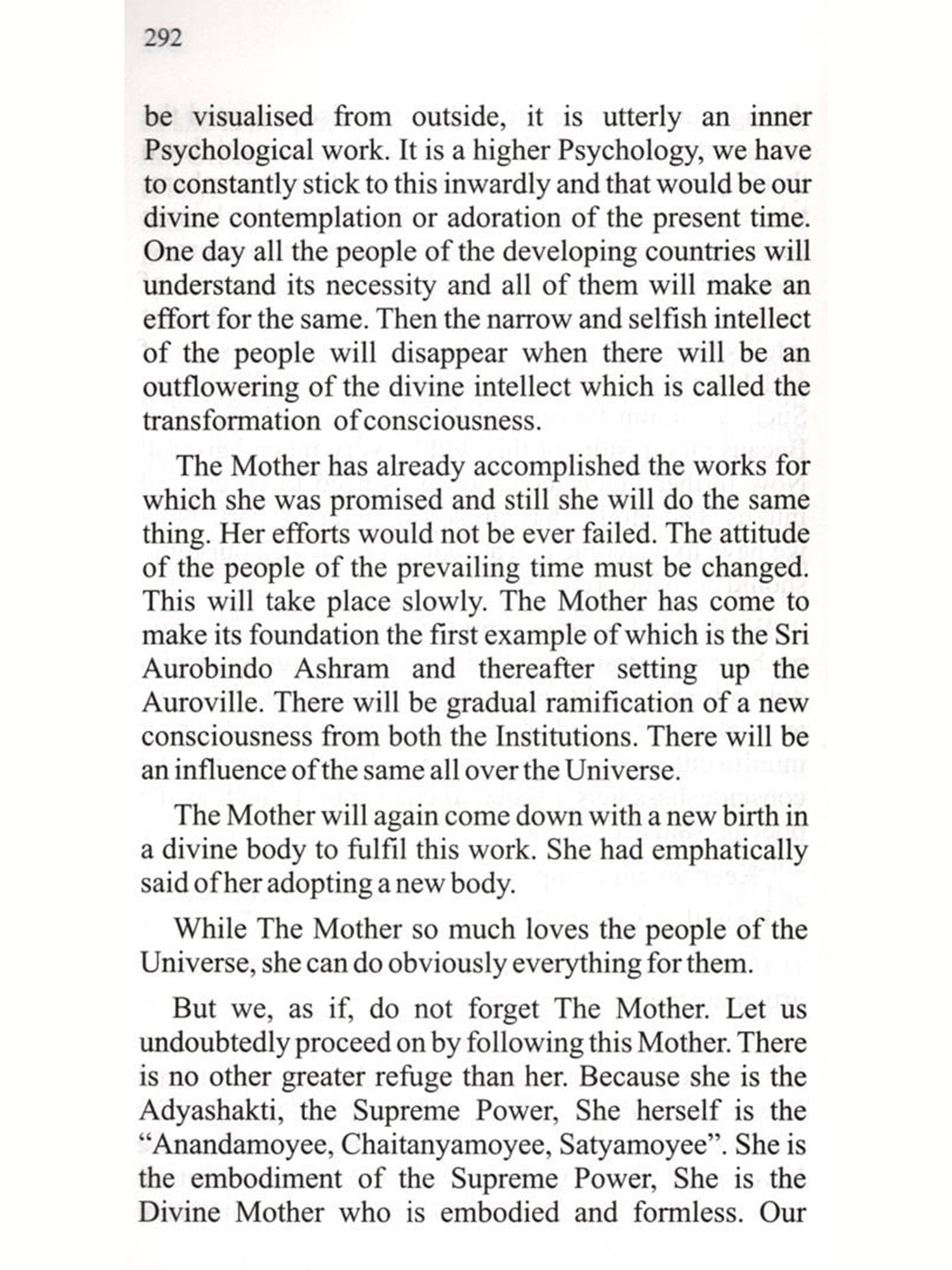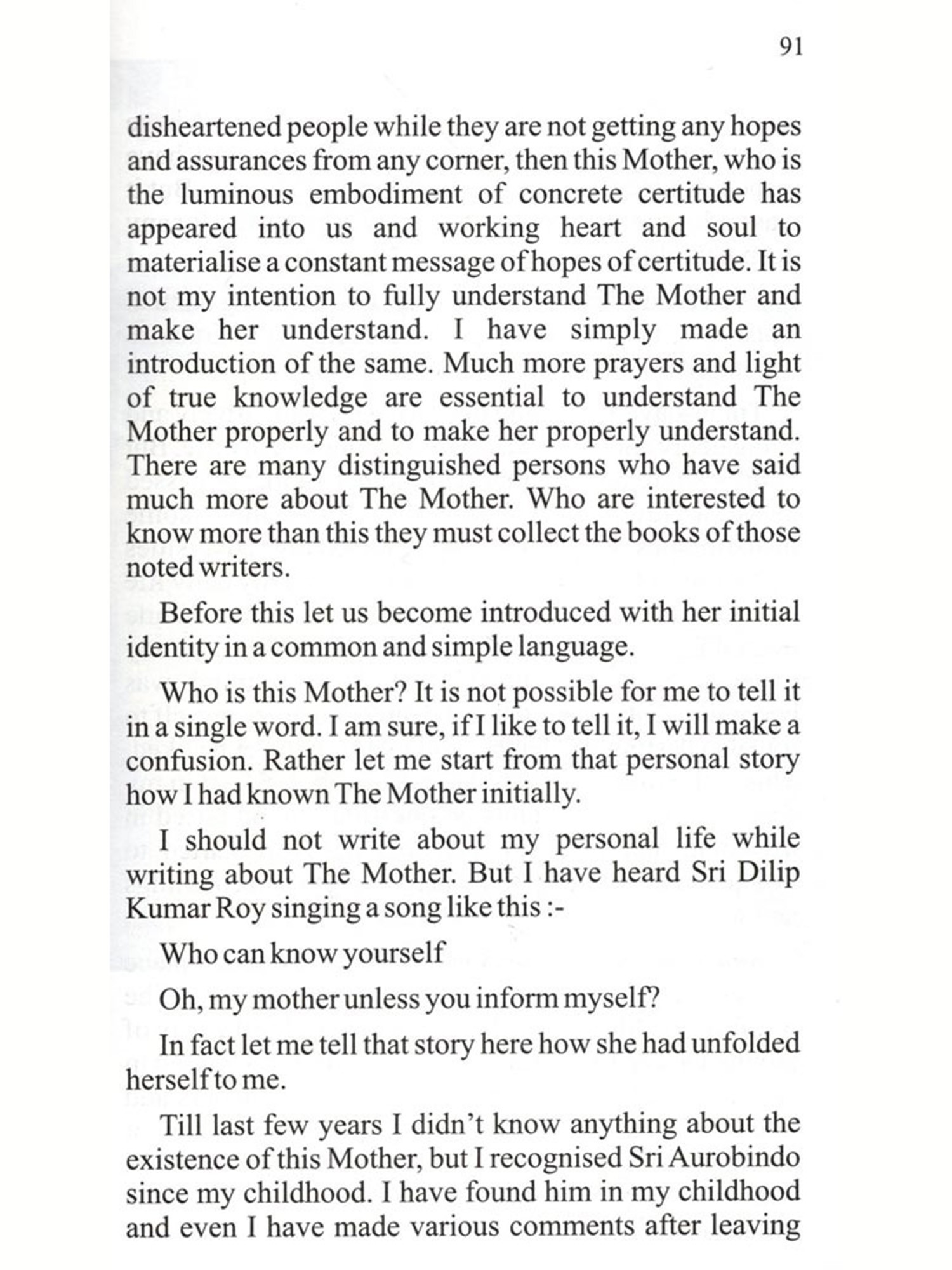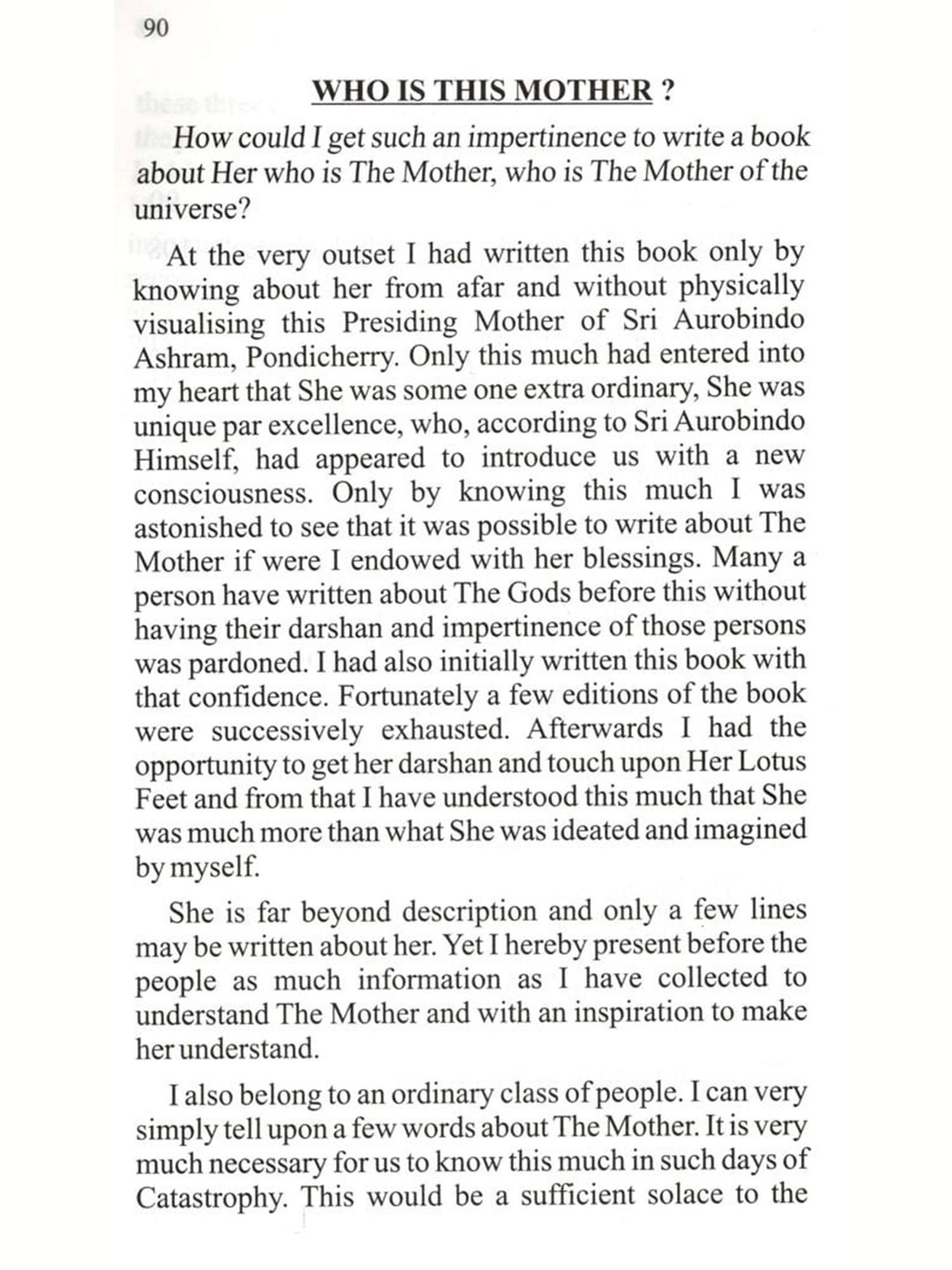 Prof. Trija Roy, the Learned Chairman of Sri Aurobindo Pathamandir, Kolkata has rightly said about the book in the last paragraph of his Preface to the Golden Jubilee edition of Ke Ei Maa". I am overwhelmed, inter alia, especially with his living translation of the Mother's prayers which were written by herself to her Lord with a painful clarity.