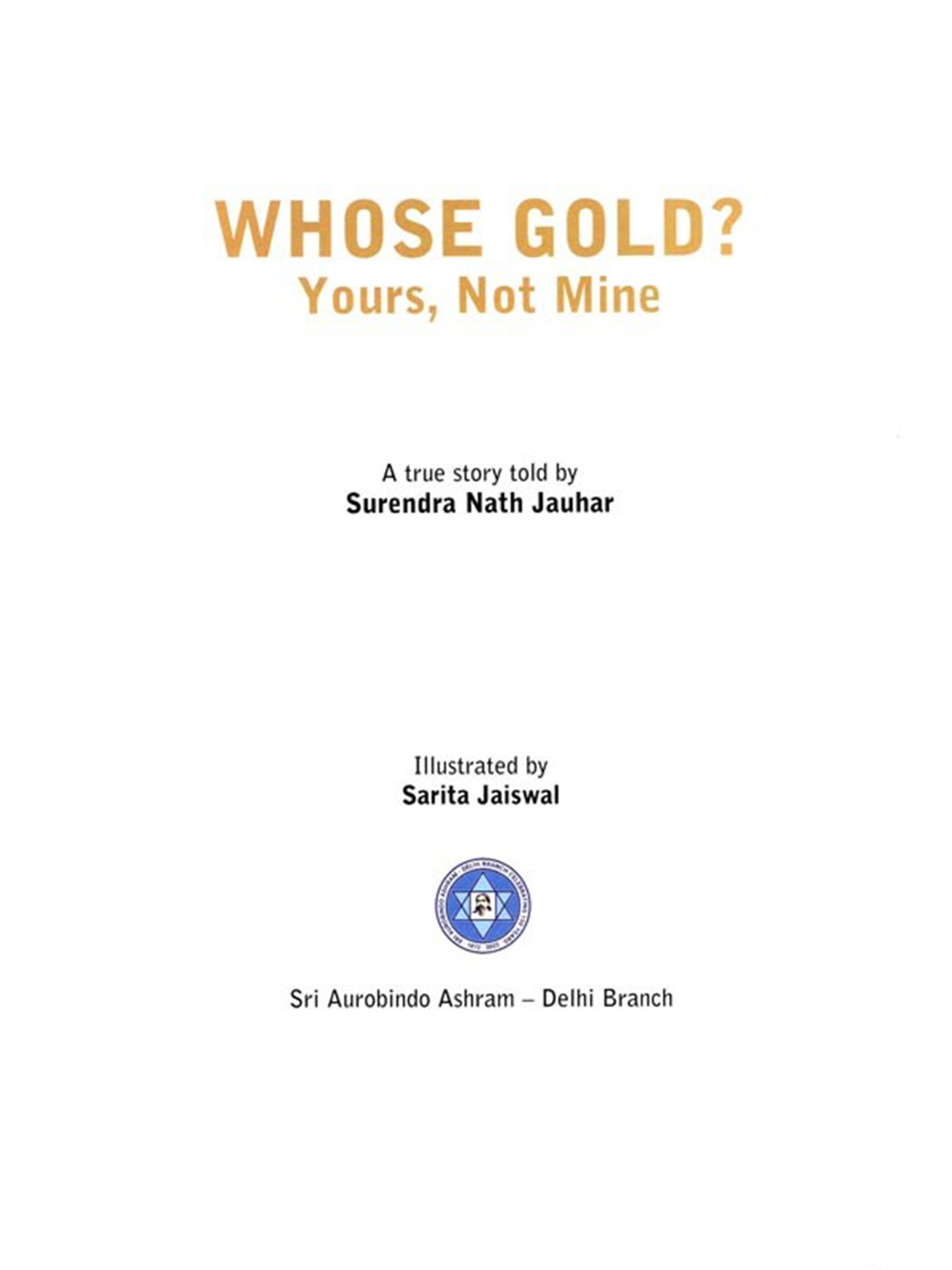 A Hindu, who had bought land years ago from a Muslim, discovers while ploughing the field a pot of gold buried underneath. The Hindu wants to return the gold because he says that he had bought only the land, not the gold buried in it. The Muslim does not want to take the gold because he had sold the land along with everything there was in it. Neither of them wants to keep the gold for fear of going to hell for the sin of taking something that does not belong to him. The arguments evolve into a dispute that lands both of them in jail. Read the story to know how the case that puzzled the judges was finally resolved. Whose Gold: Yours, Not Mine is based on a moving real-life incident that took place not far from where Shri Surendranath Jauhar, the founder of Sri Aurobindo Ashram- Delhi Branch, was born.