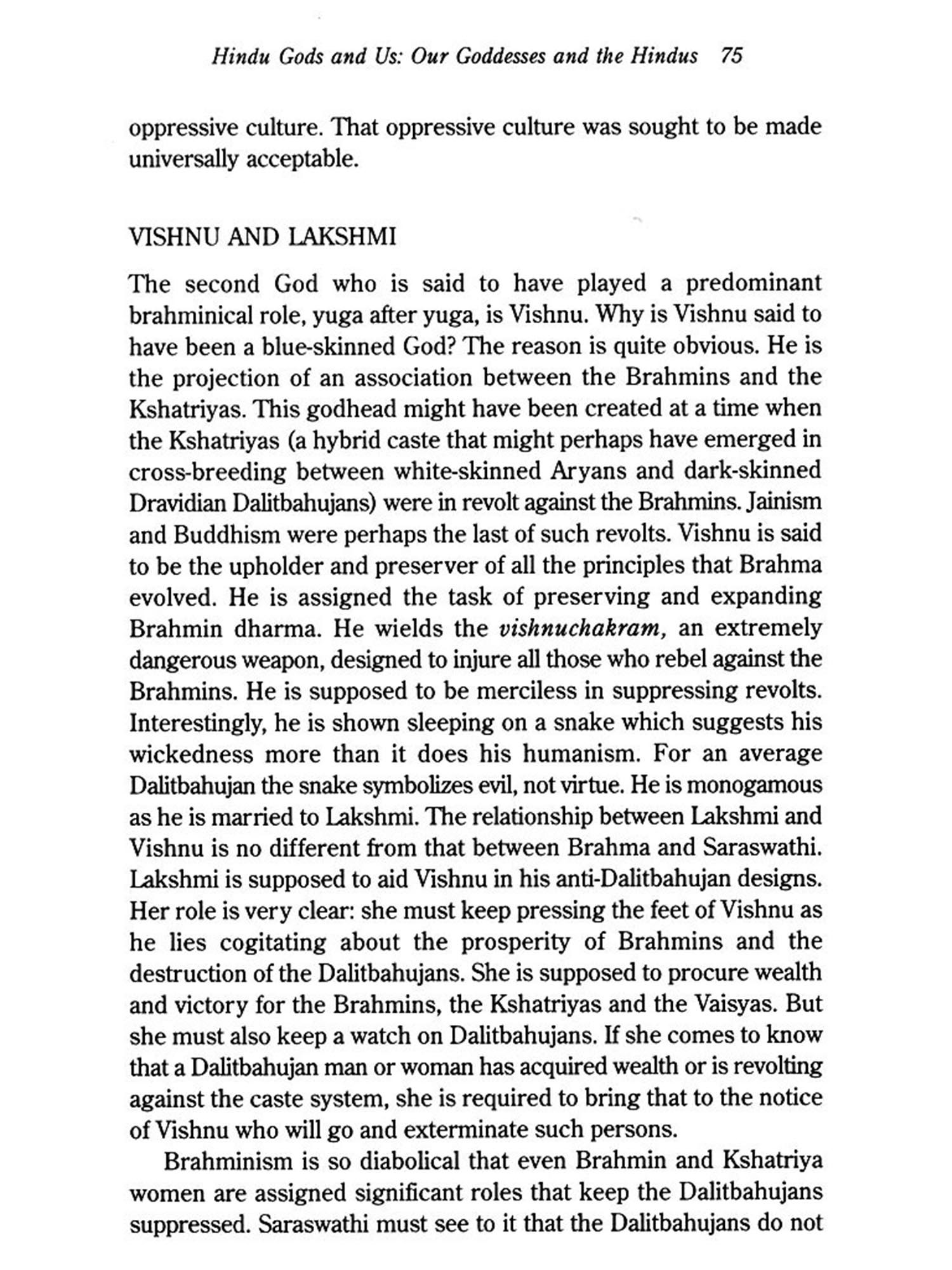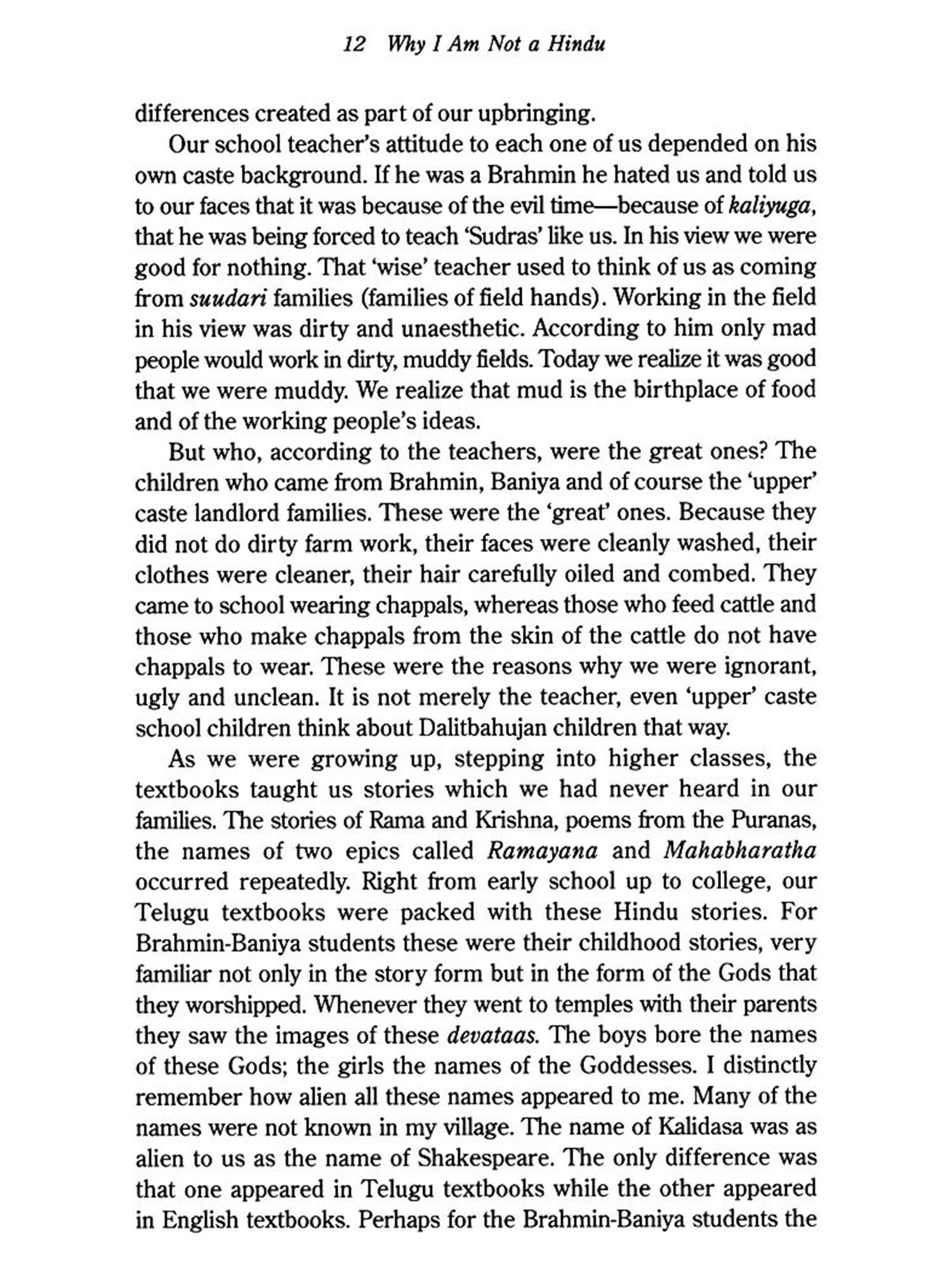 The question before me now is not whether I must treat Muslims or Christians or Sikhs as enemies, as the Hindutva school wants me to do. The question is What do we, the lower Sudras and Ati-Sudras (whom I also call Dalitbahujans), have to do with Hinduism or with Hindutva itself? I, indeed not only I, but all of us, the Dalitsbahujans of India, have never heard the word 'Hindu' not as a word, nor as the name of a culture, nor as the name of a religion in our early childhood days. We heard about Turukoollu (Muslims), we heard about Kirastaanapoollu (Christians), we heard about Baapanoollu (Brahmins) and Koomatoollu (Baniyas) spoken of as people who were different from us. Among these four categories, the most different were the Baapanoollu and the Koomatoollu. There are at least some aspects of life common to us and the Turukoollu and Kirastaanapoollu. We all eat meat, we all touch each other. With the Turukoollu, we shared several other cultural relations. We both celebrated the Peerila festival. Many Turukoollu came with us to the fields. The only people with whom we had no relations, whatsoever, were the Baapanoollu and the Koomatoollu. But today we are suddenly being told that we have a common religious and cultural relationship with the Baapanoollu and the Koomatoollu. This is not merely surprising, it is shocking.