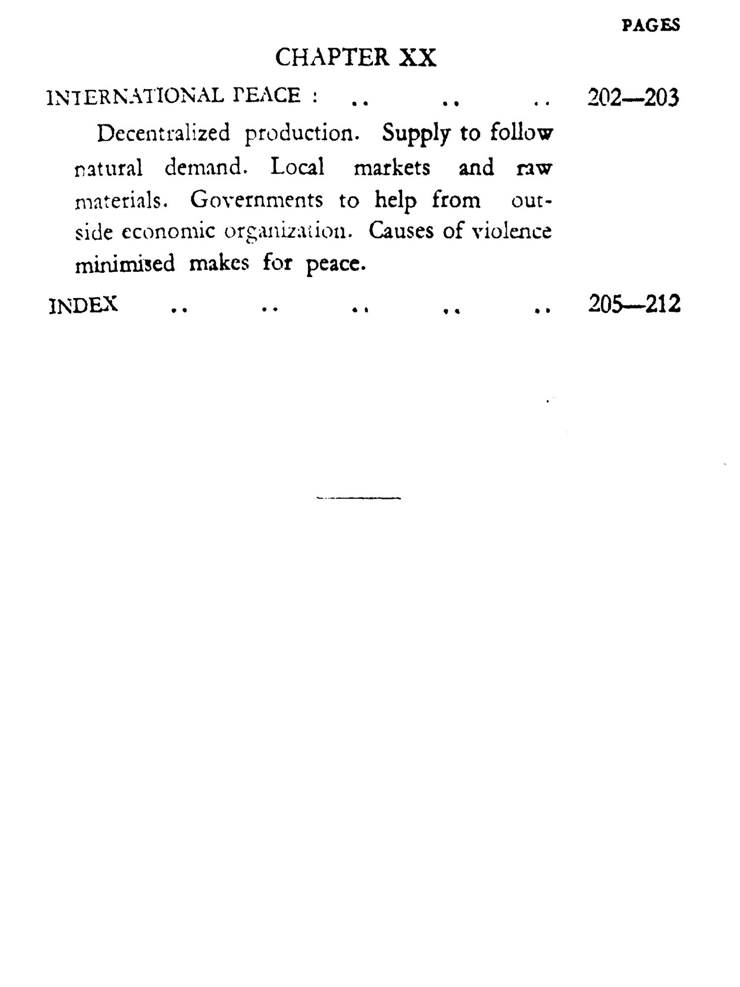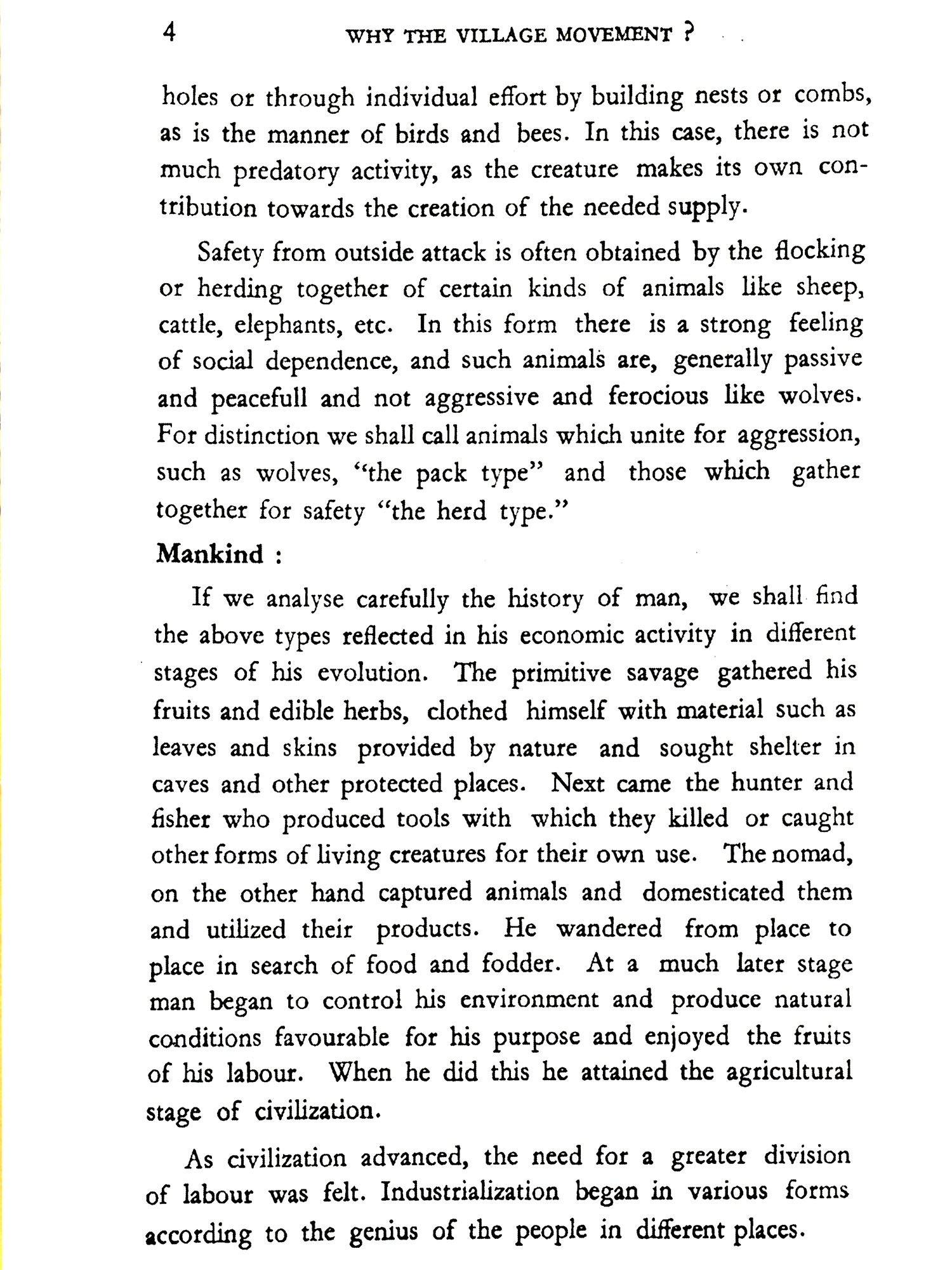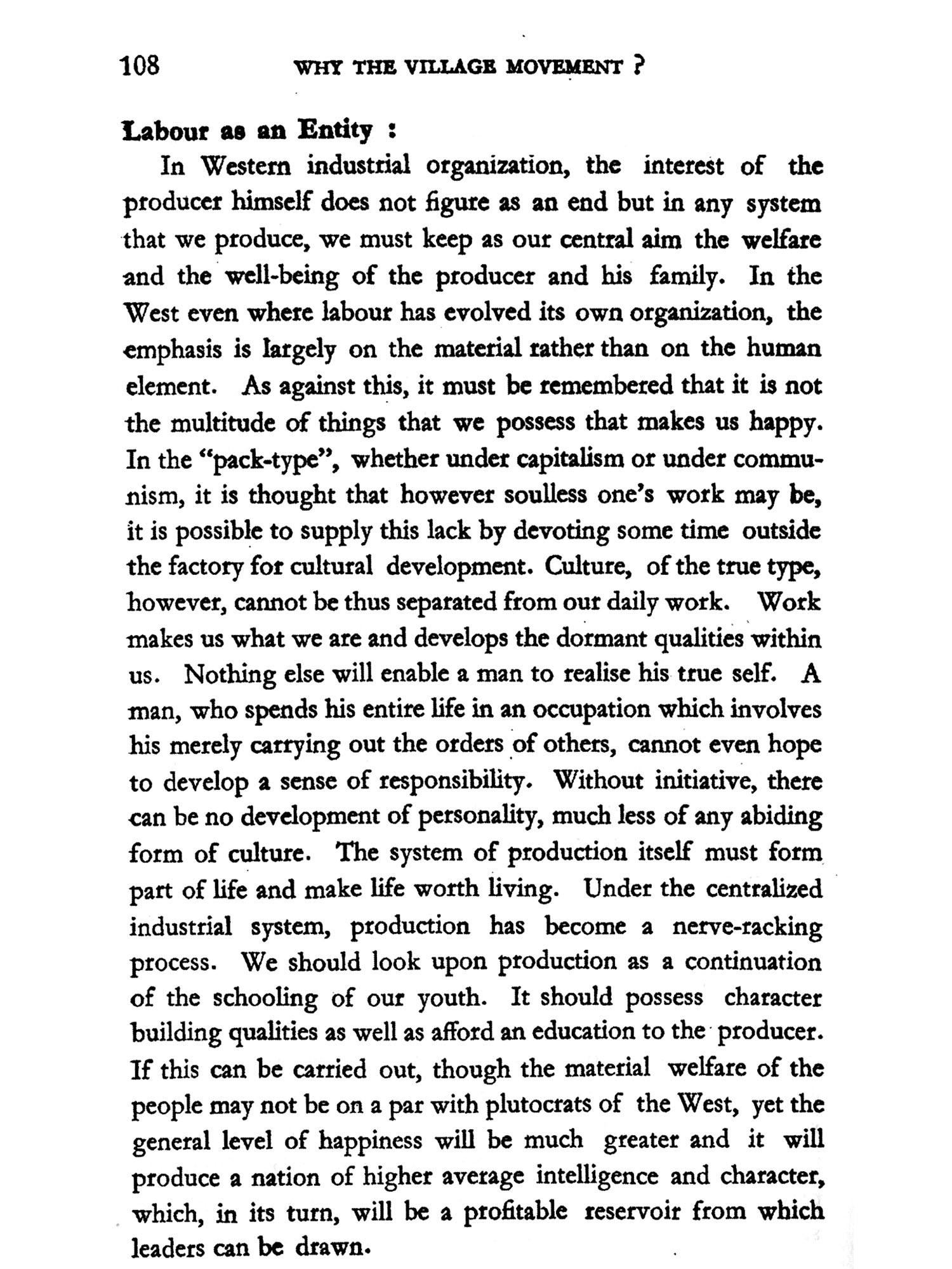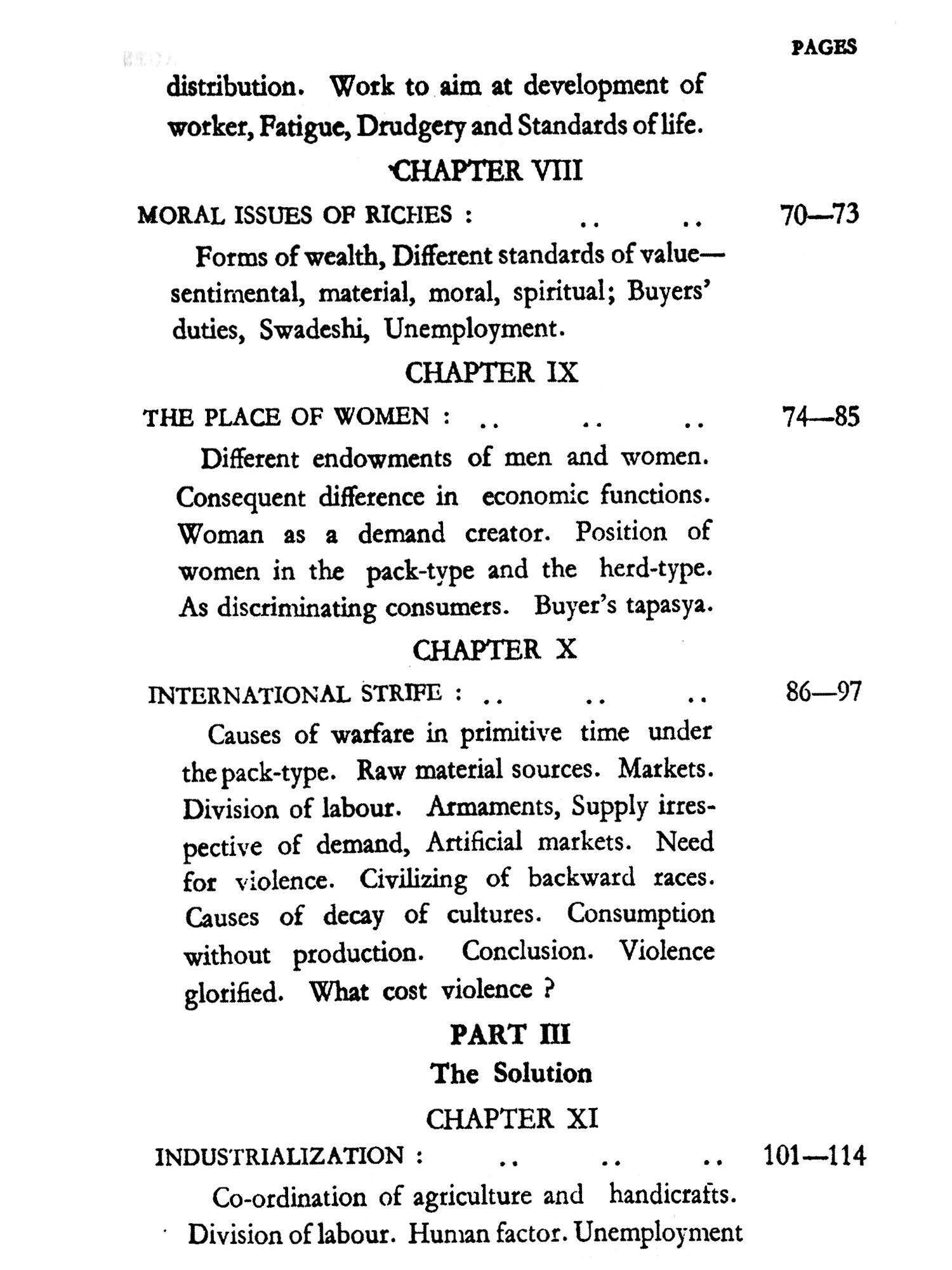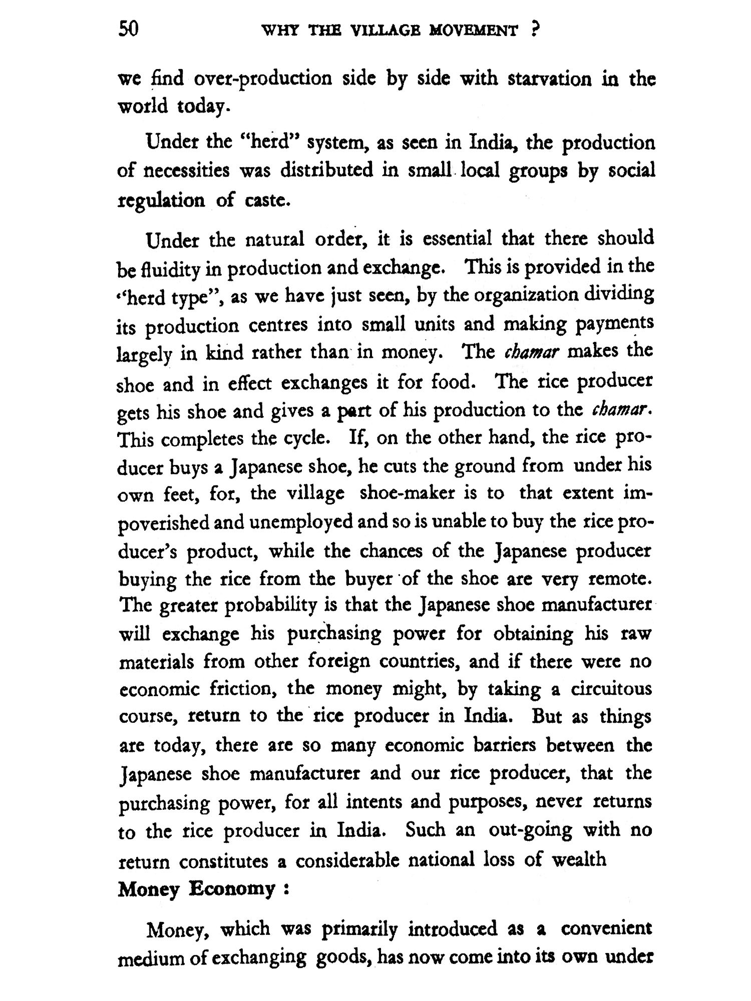 Amongst thinking people the world over there is a growing dissatisfaction as to the efficacy of capitalism as a cure for the poverty that faces us. Industrialization depends guarantee of a steady flow of raw materials and a ready market expends on the for manufactured goods. The system, therefore, requires as a pre-requisite a control of raw materials and markets which can only be obtained by violence. Soviet Communism, while seeking to remove the profit motive, has retained centralized production which entails concentration of power and, hence, calls for a greater sense of trusteeship to administer it for the benefit of the masses than is required under concentration of wealth. Ultimately, the difficulties of collection of raw materials and distribution of finished goods will have to be faced. Both capitalism and communism are based on a consideration of material values forgetting that such a myth as the "Economic Man" does not exist. The human factor and the effects of culture are ignored. In this booklet it is sought to examine the chances of basing an economic order on cultural values and human needs which formed the foundation of the old Oriental Civilization, Man is a complex being. We cannot nurture him to his full stature under a system which carries division of labour to the extreme. His religion, philosophy, politics, social and economic activities, and his family relations have all to be rolled into one before a cultural person can evolve. We cannot segregate various aspects of his life in different compartments and attempt to develop them in distinct stages. The practical side of the theme of this booklet can be seen in the programme of work of the All India Spinners' Association and the All India Village Industries Association. If this booklet clarifies to some extent the ideals of these Associations it will justify its existence.